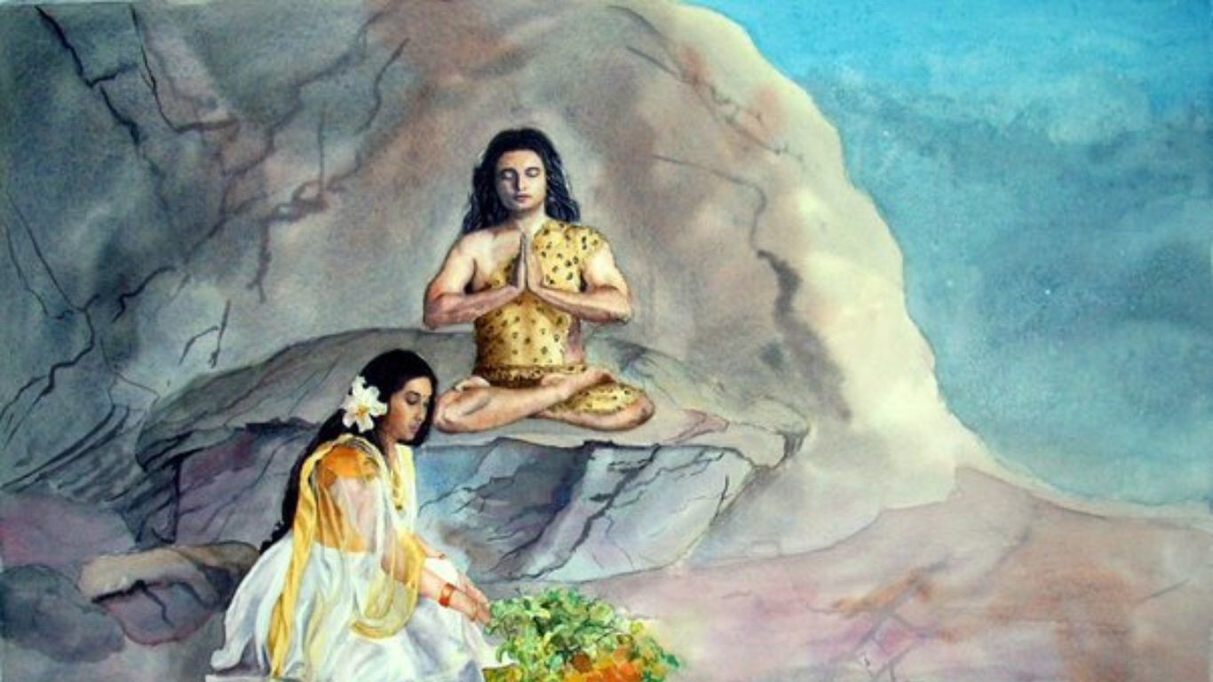 Roaming the world, Andhakasura, one day, reached Mandarachal with his army. There he saw a supremely beautiful woman, an ascetic adorned with ashes (bhasma), serpents (sarpa), Rudraksha bead necklaces, adorned with skull garland, with Tirshula and Khadag (sickle). First intrigued and then enchanted by the beautiful lady, Andhakasura approached the ascetic and asked, “Why are you engaged in austerities when you have such a beautiful woman accompanying you?” “Who is this exquisite woman and why is she with you?”