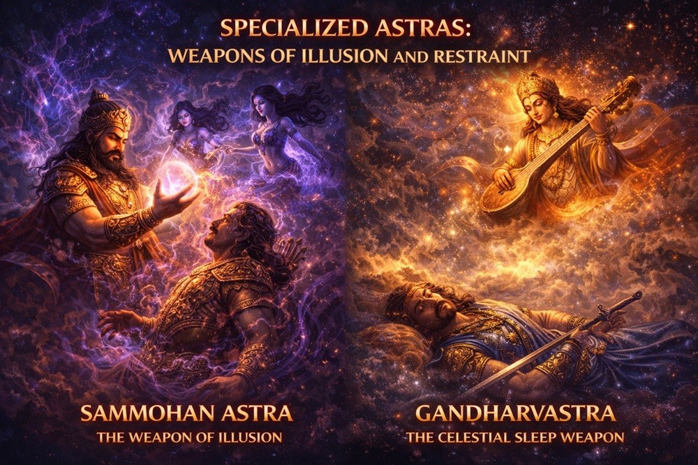 Gandharva-type Astras create delusion, confusion, or sleep across the enemy. They work through music or supernatural charm, functioning as illusory weapons rather than causing physical harm, Gandharvastra was used to end conflict without bloodshed, reflecting the ethical ideal of restraint in warfare.