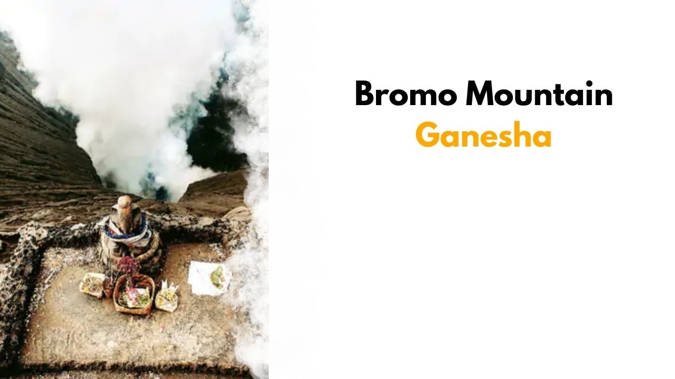 A Ganesha statue whose throne is a volcano! Near Mount Bromo in East Java- an active volcano rising 7,641 feet- a stone-carved Ganesha sits, a humble form but powerful guardian of the people.