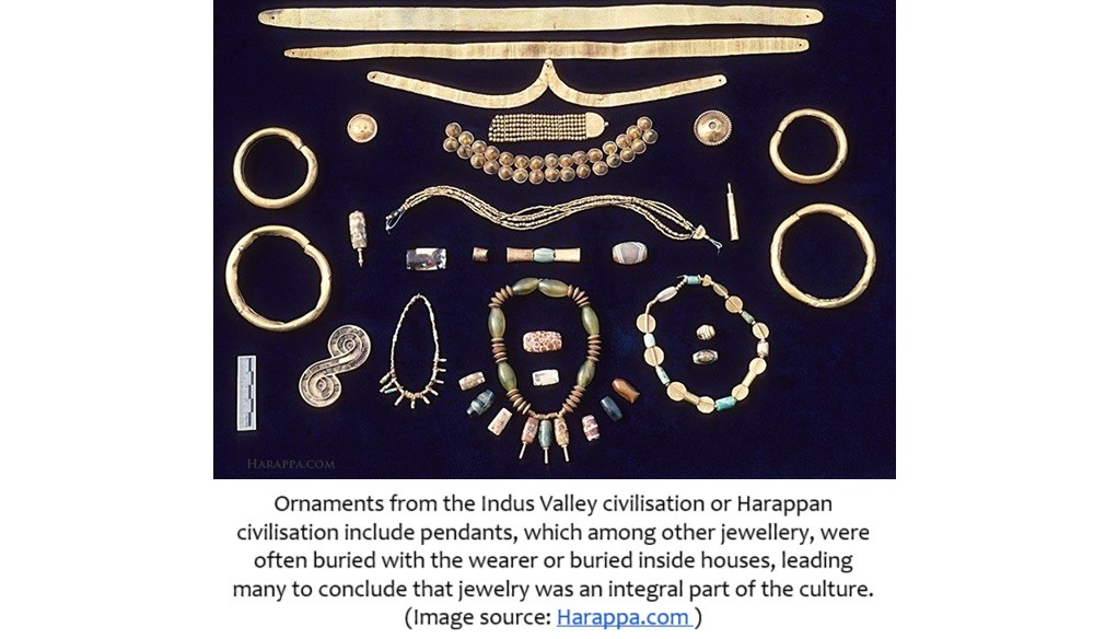 Archaeological sites of the Indus Valley present terracotta, faience, and shell pendants. These were worn for both ritual and aesthetic reasons, by both men and women. Many contain geometric patterns that reflect early cosmological ideas. In the early historic period, pendants carved in crystal, agate, and carnelian appear in trade routes stretching from Taxila to the Roman world. These were valued as adornment, as markers of wealth and cross-cultural exchange.