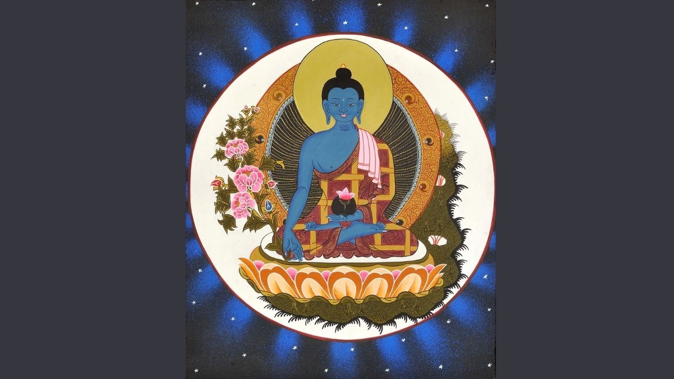 His name- Bhaiṣajya-guru Vaidūrya-prabhā-rāja- translates to “Medicine Master and King of Lapis Lazuli Light.”