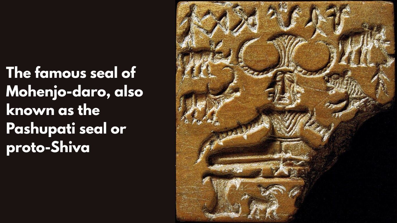 The famous seal of Mohenjo-daro, also known as the Pashupati seal or proto-Shiva, depicts a male deity, surrounded by animals, wearing a horned crown, and sitting in a graceful yet alert pose.