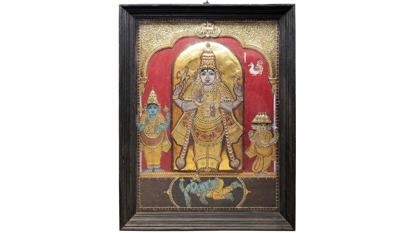 He holds the Pashu (antelope), Trishula (trident), Ankusha (goad), and Abhaya or Varada mudra (gesture of removing fear and giving boons).