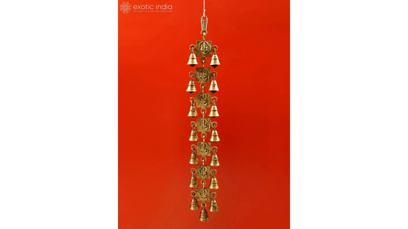 A perfect addition to your doorways, this brass wall hanging features Ganesha with Om, the cosmic sound, which is often used along with Ganapati to create a most auspicious image. Ganesha is framed with bells, that create a gentle chime as they move, making this decor a source of energy and joy in any space it adorns. Offers soothing chimes alongside powerful symbolism for joyful energy.