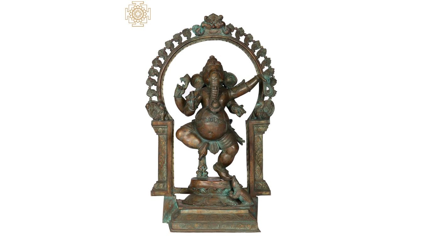 The auspicious lord dances joyfully on the head of a serpent, a story from the Puranas where Ganesha defeated Vasuki Naaga and danced victoriously. The flat statue made with brass is a dynamic figure, bringing movement and artistic appeal to your space. A dynamic, flat brass statue embodying mythological victory.