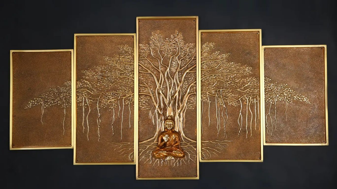 Brass becomes the home of wisdom in this divine wall hanging, featuring Buddha under the Bodhi tree. Refined sculpting, natural texture, and finish of the metal create a centrepiece that will transform your space into the abode of Buddha.