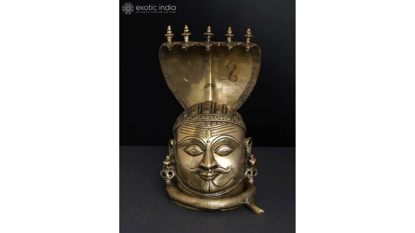A representation of Shiva's head as worshipped in temples of Andhra, Karnataka, and parts of Maharashtra, this Mukhalingam is crafted in brass, a work of divine aesthetics that will transform the sacred decor of any space.