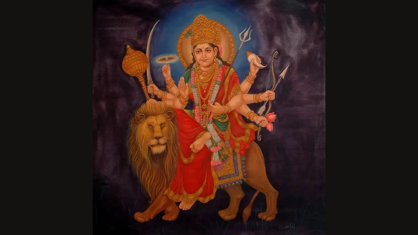 🦁 Durga’s lion/tiger represents courage and victory over negativity.