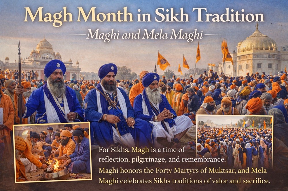 The month of Magha also holds deep religious importance in Sikh tradition through the observance of Maghi and the annual Mela Maghi. Sikh observances during this period reflect shared themes of remembrance, purification, courage, and collective responsibility. Maghi is observed on the first day of the Magha month and is closely associated with sacrifice, loyalty, and spiritual liberation in Sikh history.