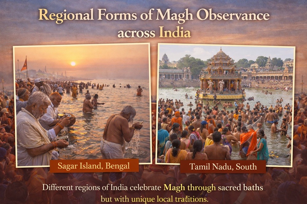 Across India, Magh-period observances appear in varied forms. At Sagar Island, located at the mouth of the Ganga in Bengal, Magh bathing coincides with ancestor rites. In southern India, particularly in Tamil Nadu, the Mahamaham tank festival echoes the same Puranic idea of periodic cosmic purification through water. The ritual bathing performed during Mahamaham reflects Magha’s underlying symbolism