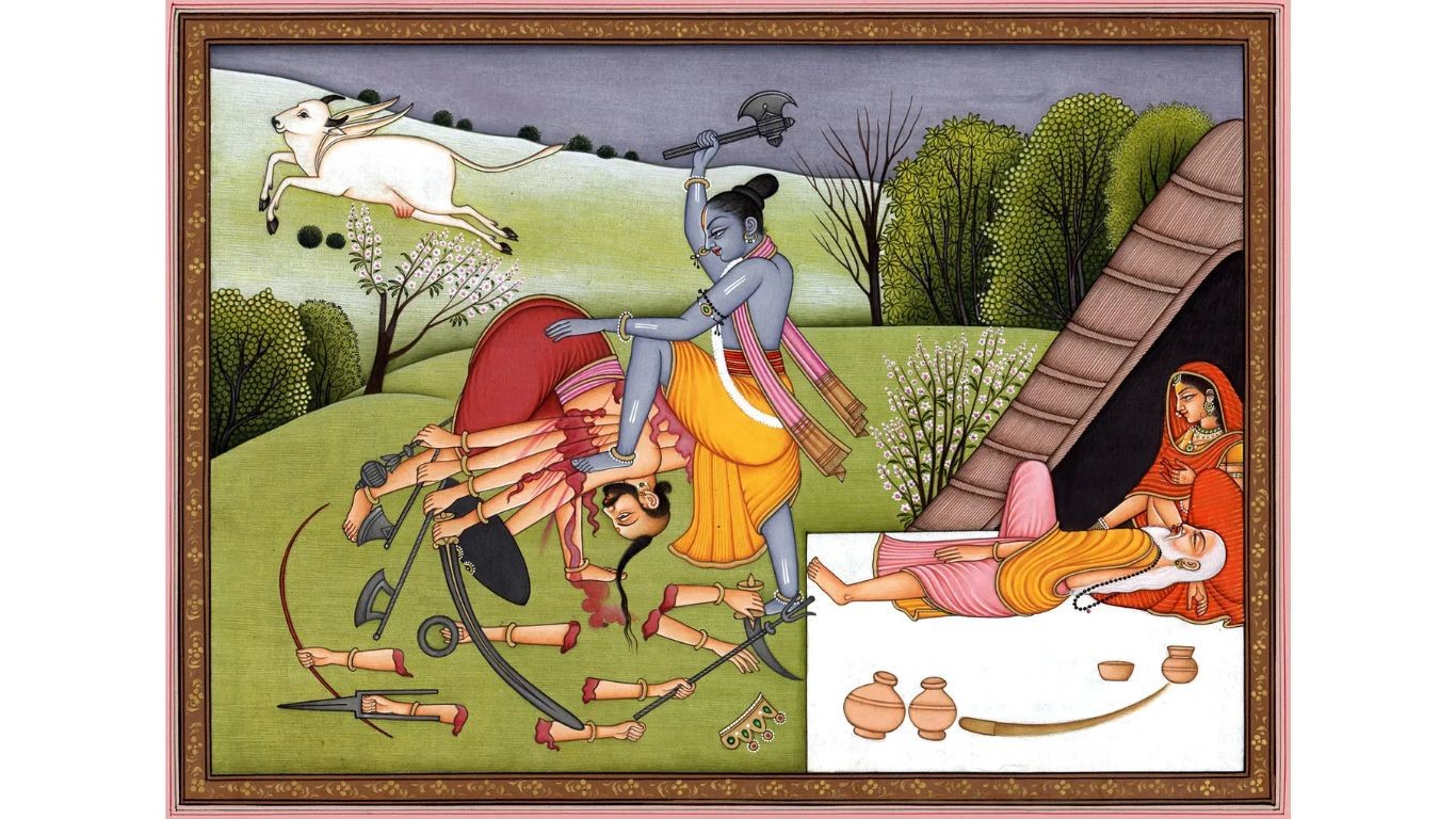 Kartavirya Arjuna, a thousand-armed king, once stole Sage Jamadagni’s divine cow, Kamadhenu. In retaliation, Parashurama fought him and his army, ultimately killing him and restoring dharma.