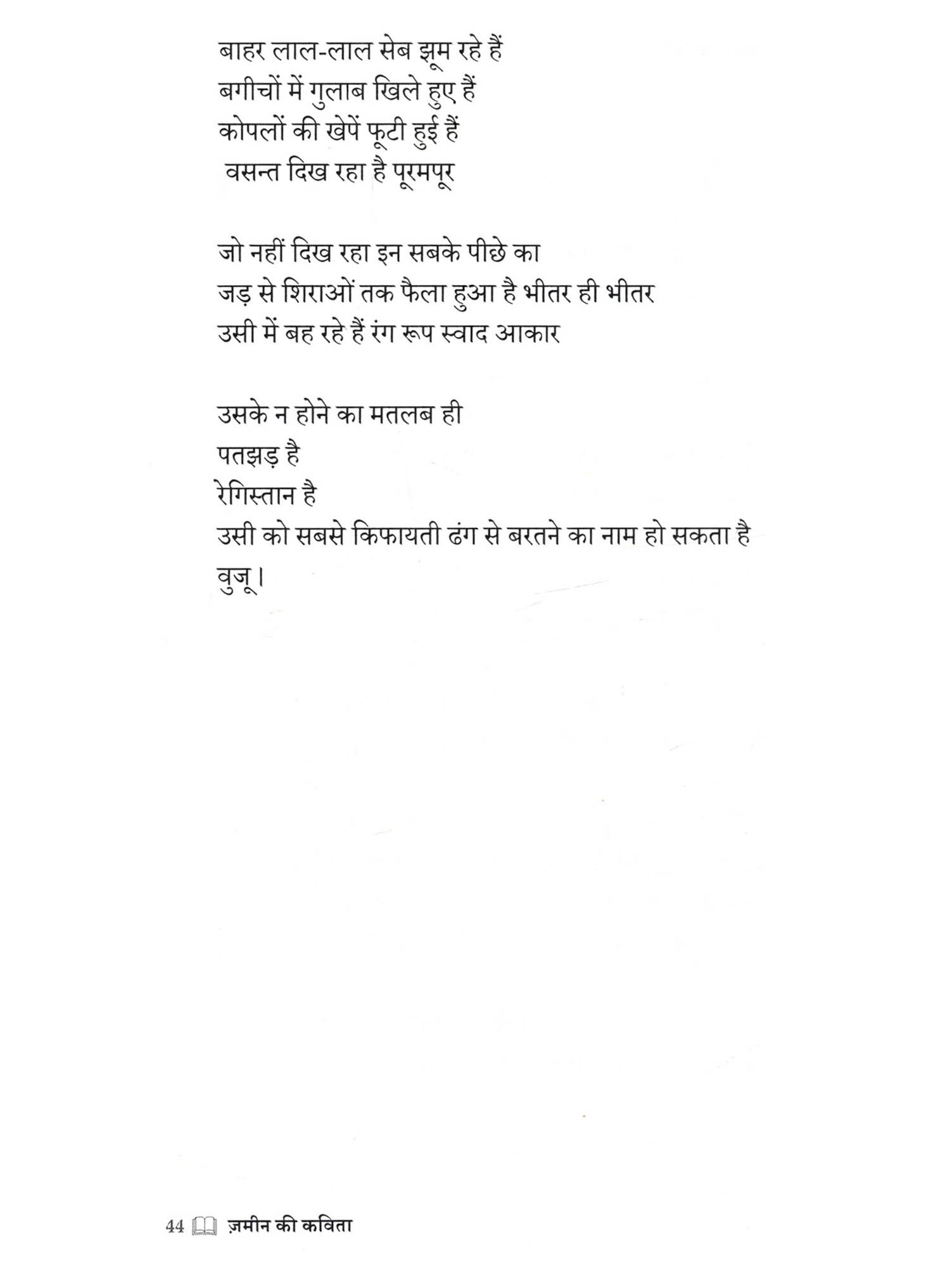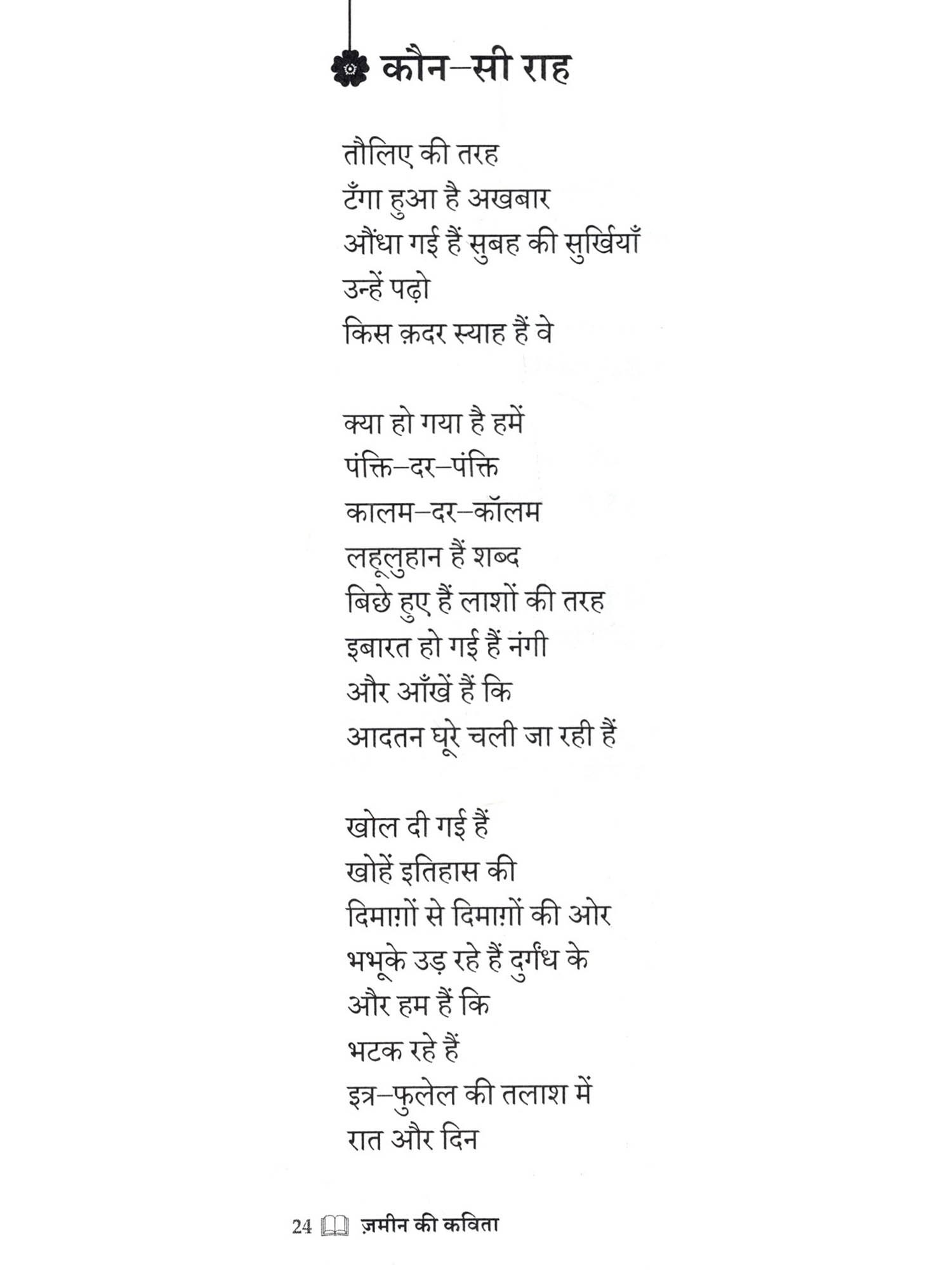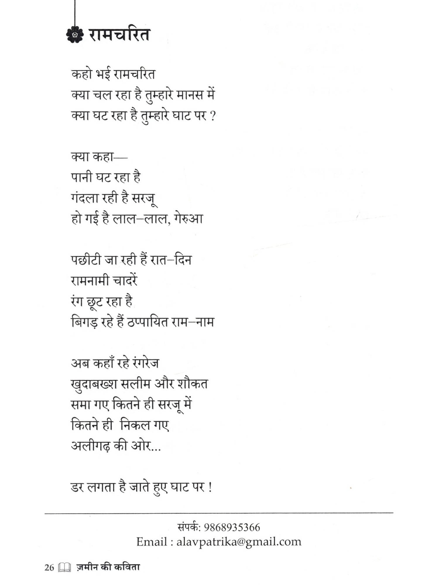 सबसे अच्छी कविता सबसे अच्छी कविता इतनी विनम्र होगी कि जविश्वसनीय लगेगी इतनी प्राकृतिक होगी कि हिंदी लगेगी इतने दुखों में काम आएगी कि लिखी हुई नहीं लगेगी सबसे अच्छी कविता सबसे बुरे दिनों में याद आएगी उसे जो कंठ गाएगा मीठा लगेगा सबसे अच्छी कविता विकल कर देगी मुक्ति के लिए सबसे अच्छी कविता सबसे अच्छी बंदूक का सबसे बुरा छर्रा साबित होगी सबसे अच्छी कविता सबसे बुरे दिनों में पहचानी जाएगी देखते-देखते आग में बदल जाएगी।