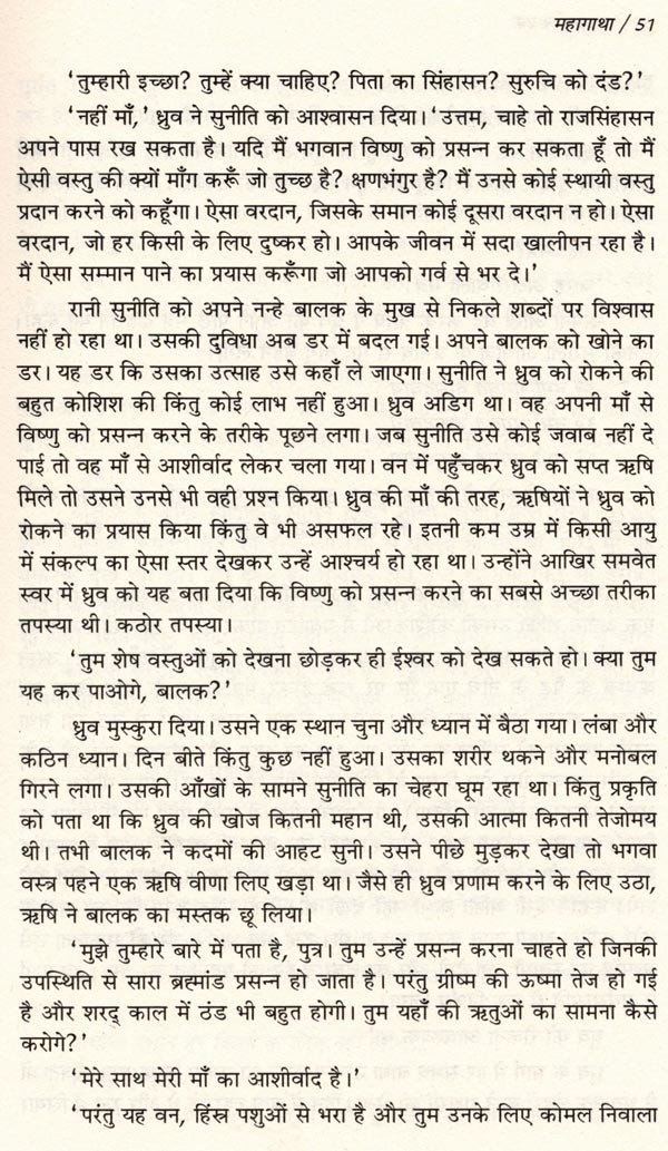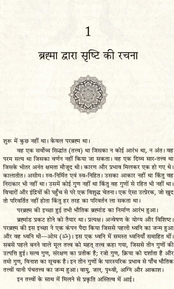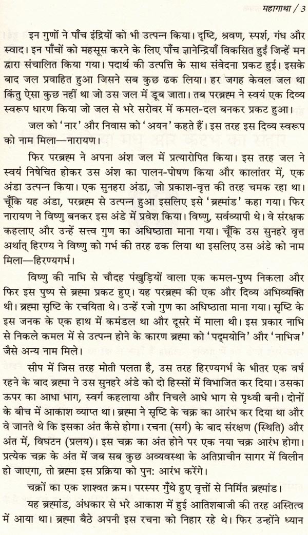 हिंदू धर्म के पुटाण, जान का संसार हैं, जिनमें जवाबों की तह मूलभूत खोज समाहित है जिसके कारण वे सदा प्रासंगिक बने रहते हैं। अब, पहली बाट, इन प्राचीन ग्रंथों में से 100 महानतम् पौराणिक कथाओं को चुनकर, उन्हें सचित्र महाकाव्यात्मक रूप में संकलित किया गया है। देवताओं, असुटों, ऋषियों और टाजाओं की लोकप्रिय कथाओं के अतिरिक्त, सत्यार्थ नायक ने अल्पजात कहानियों को भी खोज निकाला है, जैसे कि वह कथा जिसमें विष्णु का सिर काट दिया गया था या जिसमें सरस्वती ने लक्ष्मी को शाप दिया अथवा वह कथा जिसमें हरिश्चंद्र ने वरुण के साथ छल किया। नायक ने इन 100 कहानियों को ऐसे अदवितीय कालानुक्रमिक प्रारूप में कहने का प्रयास किया है, जिसका आरंभ सत्युग में सृष्टि के सृजन से और अंत, कलियुग के आगमन के साथ होता है। पौटाणिक प्रतीकों का उपयोग करते हुए, सत्यार्थ ने ऐसी कथा की रचना की है जो सतत और चेतन सक्रियता के साथ चार युगों की यात्रा करती है। इस तरह पढ़ने से पता चलता है कि ये कहानियाँ अलग-अलग घटनाएँ नहीं, अपितु एक-दूसरे से जुड़ी हुई है तथा बृहत् फलक का निर्माण करती है। हर घटना का एक अतीत और एक भविष्य है। कारण और प्रभाव। कर्म तथा कर्म-फल का अंतर्संबद्ध चक्र। देवताओं, राक्षसों और मनुष्यों के मानस में समान रूप से सहायक होंगी।