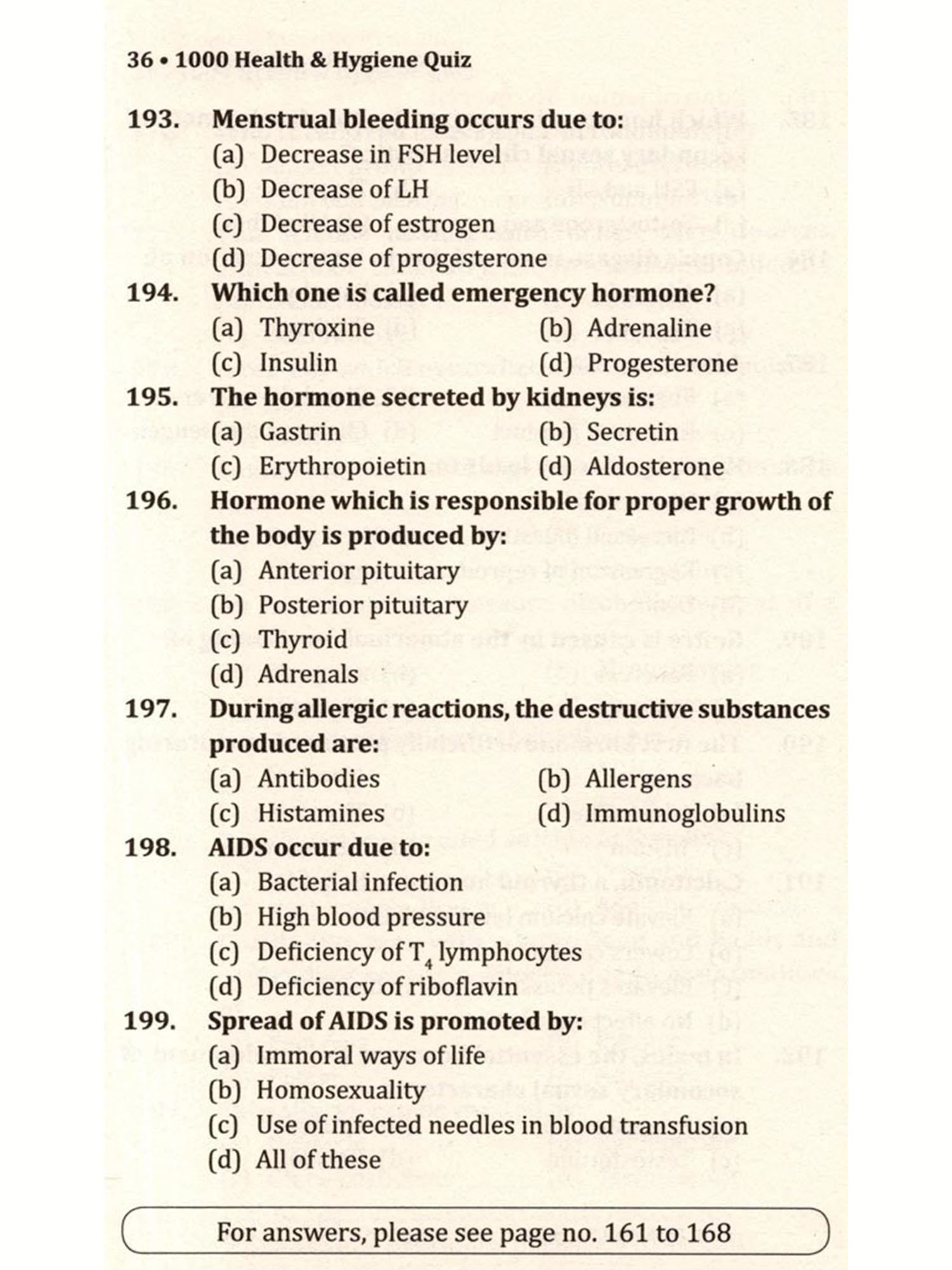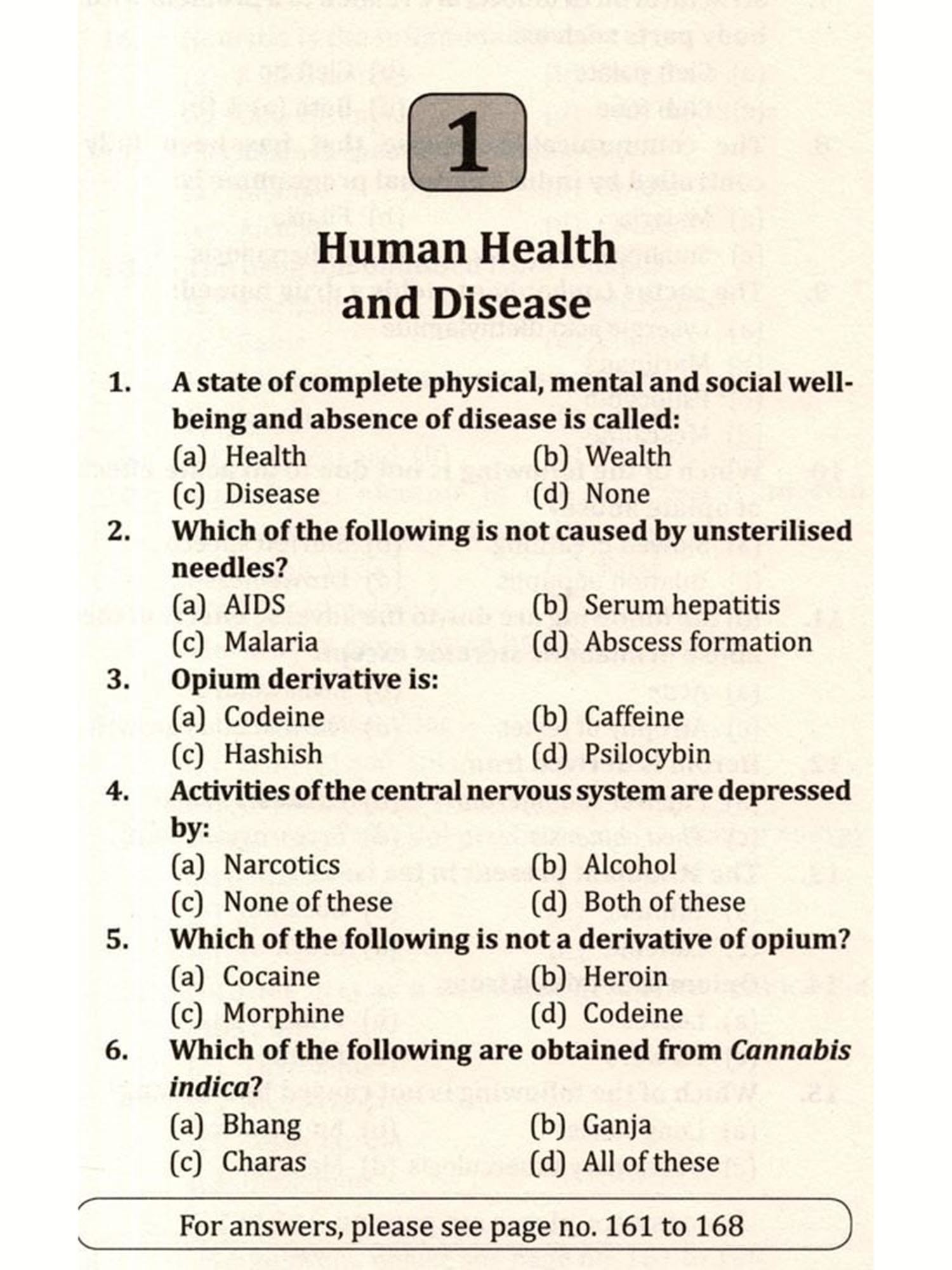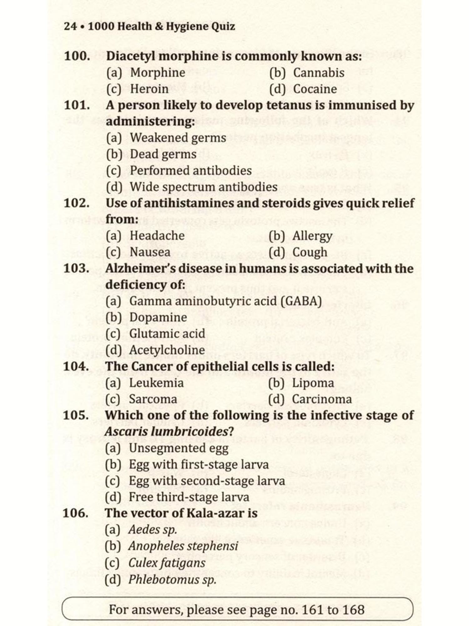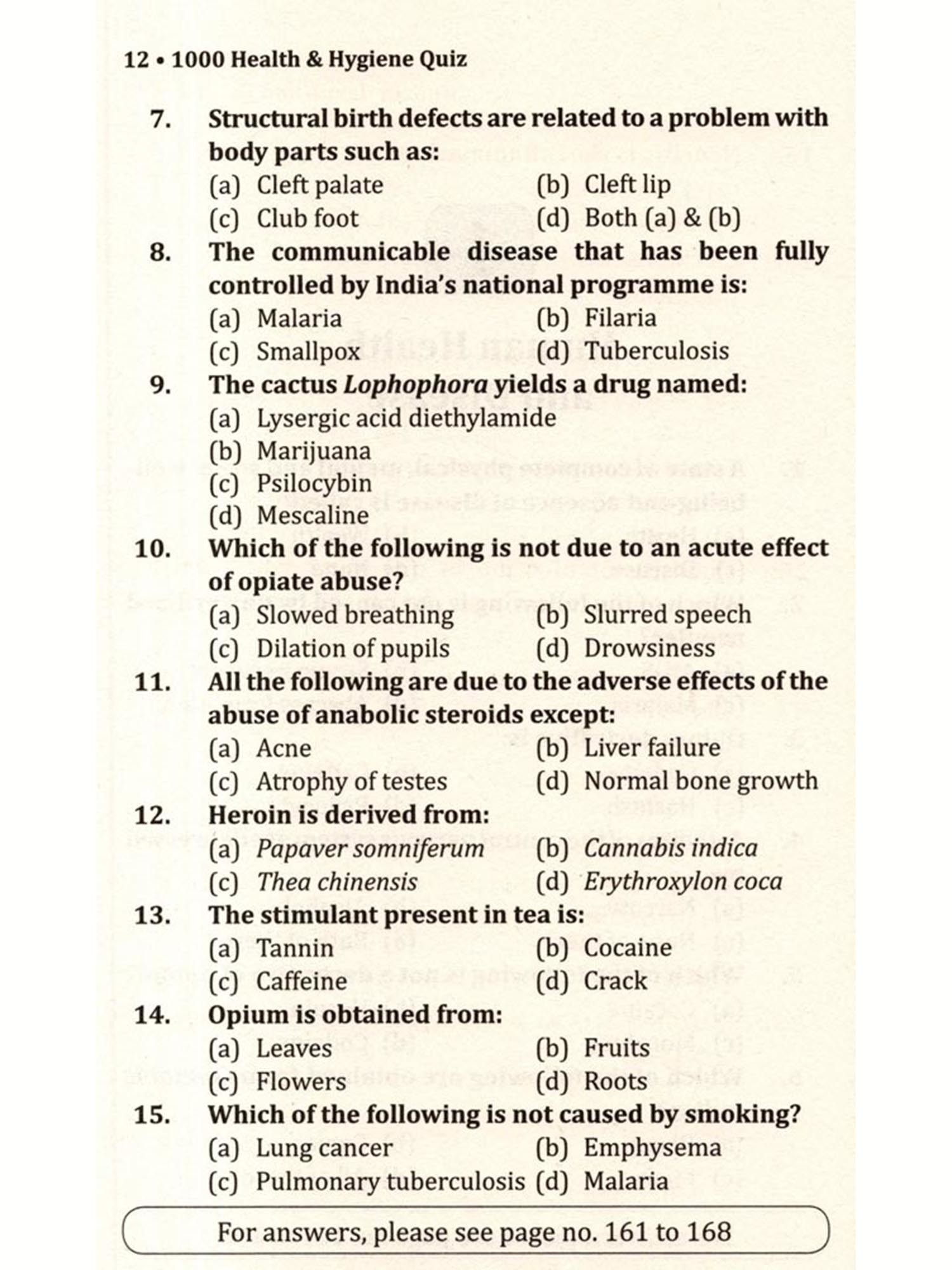 As defined by the World Health Organisation (WHO), health is a A "state of complete physical, mental and social well-being, and not merely the absense of disease or infirmity". Truly speaking. health is a dynamic condition resulting from a body's constant adjustment and adaptation in response to stresses and changes in the environment for maintaining an inner equilibrium called homeostasis. As per the constitution of the WHO principles, the enjoyment of the highest attainable standard of health is one of the fundamental rights of every human being without distinction of race, religion, political belief, economic or social condition. Also the health of all people is fundamental to the attainment of peace and security and is dependent on the fullest cooperation of individuals and states. Hygiene is a set of practices performed to preserve health. According to WHO, "Hygiene refers to conditions and practices that help maintain health and prevent the spread of diseases." Personal hygiene refers to maintaining the body's cleanliness. Many people equate hygiene with 'cleanliness', but hygiene is a broad term. It includes such personal habit choices as how frequently to bathe, wash hands, trim fingernails, and change clothing. It also includes attention to keeping surfaces in the home and workplace, including bathroom facilities, clean and pathogen-free. The book in hand-'1000 Health and Hygiene Quiz'-has been written in lucid language to make the younger generation, specially the students of different School Boards, aware of various diseases of body and mind. The book contains useful and important topics like Defense against diseases, Immune system, AIDS, Disorders of nervous system, Psychological disorders, Hormone and vitamin deficiency diseases. Biotechnology and Dermatology questions have also been included for the benefit of students. The book is of immense use for the students and those preparing for medical entrance and other competitive examinations. I wish to acknowledge my sincere thanks to Dr. B.R. Singh, former HoD of Zoology, Bihar University and former Vice Chancellor, Bihar University; Dr. K.R. Singh, former Reader, L.S. College, Muzaffarpur; my elder brother Sh. Hare Ram Singh; my wife Mrs. M. Singh Bhargav, Abhishek and Rishabh for their valuable contribution in critical revision of the book and updating the multiple-choice questions. Suggestions for further improvement of the book will be highly appreciated.