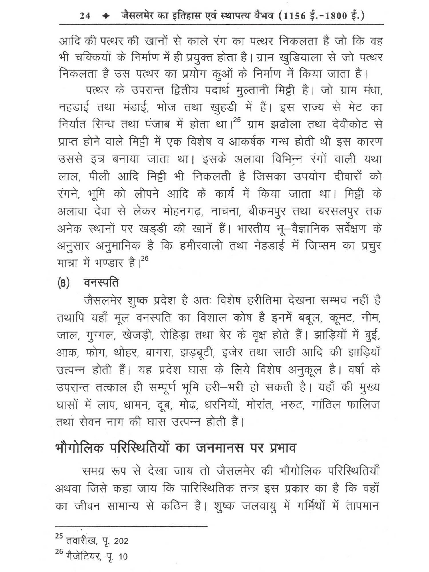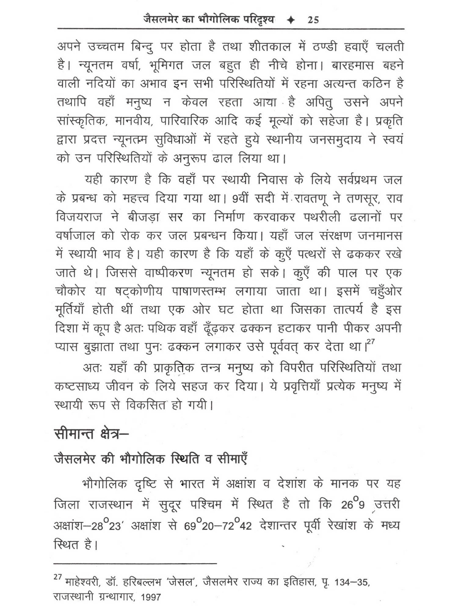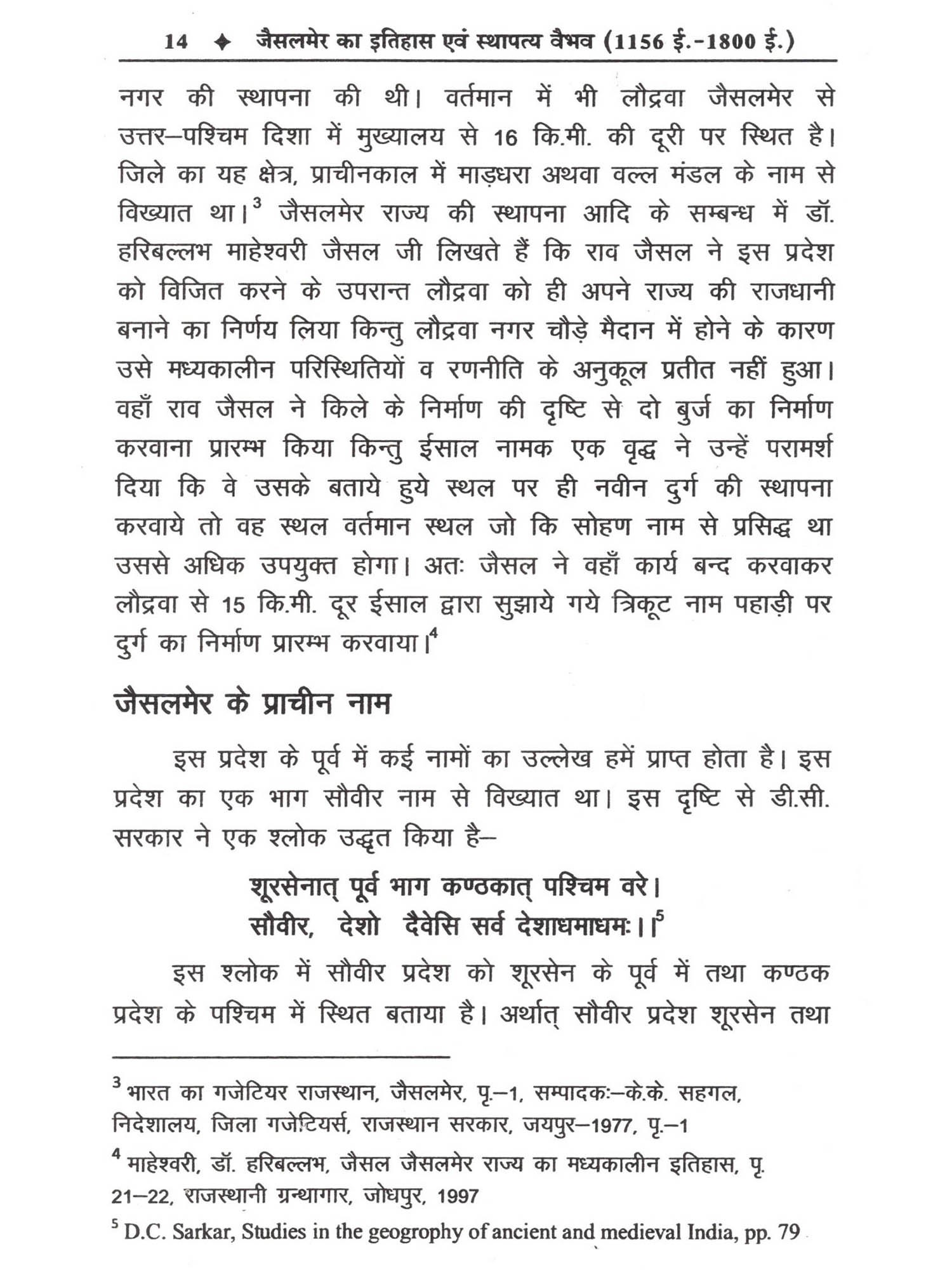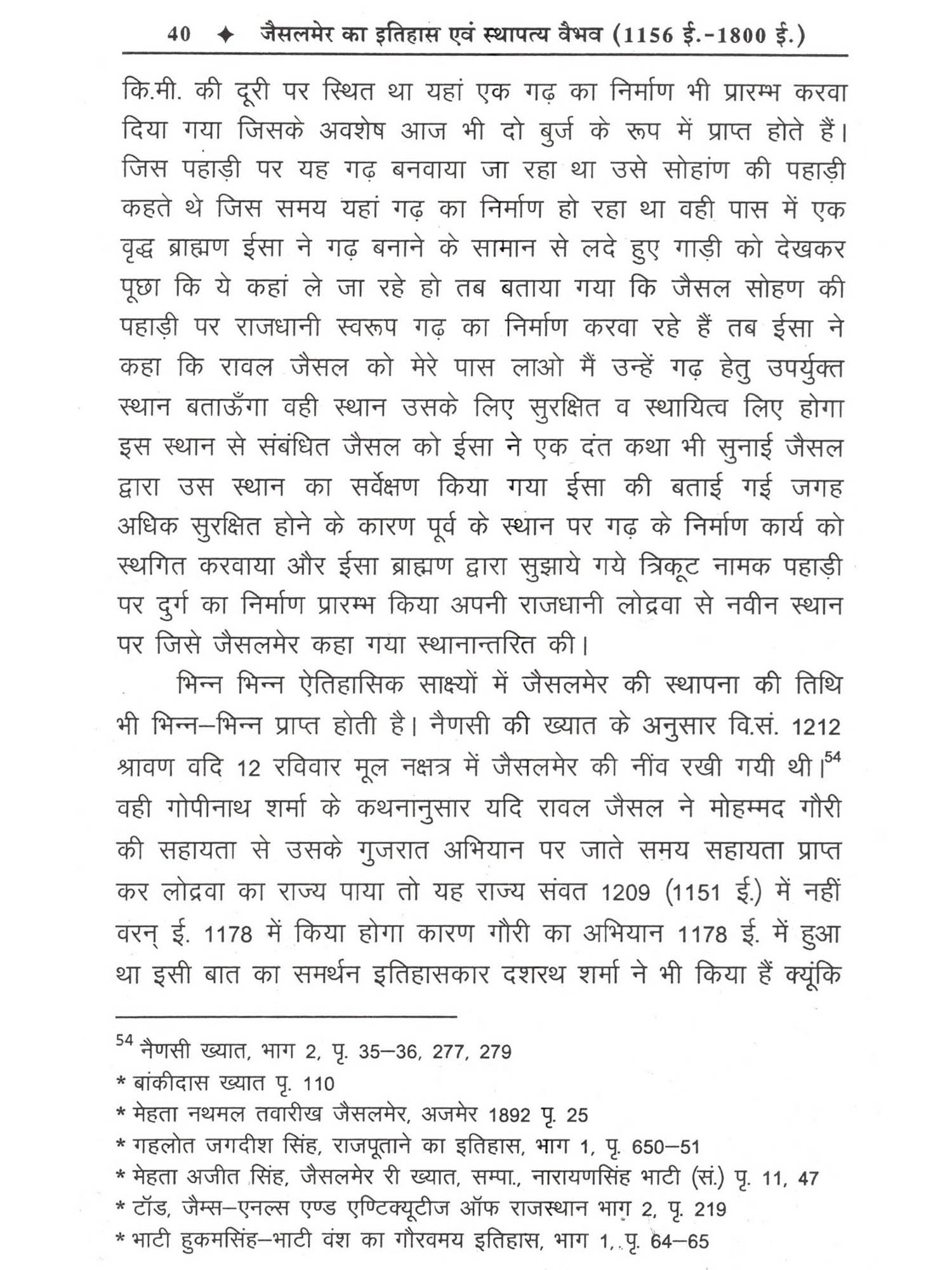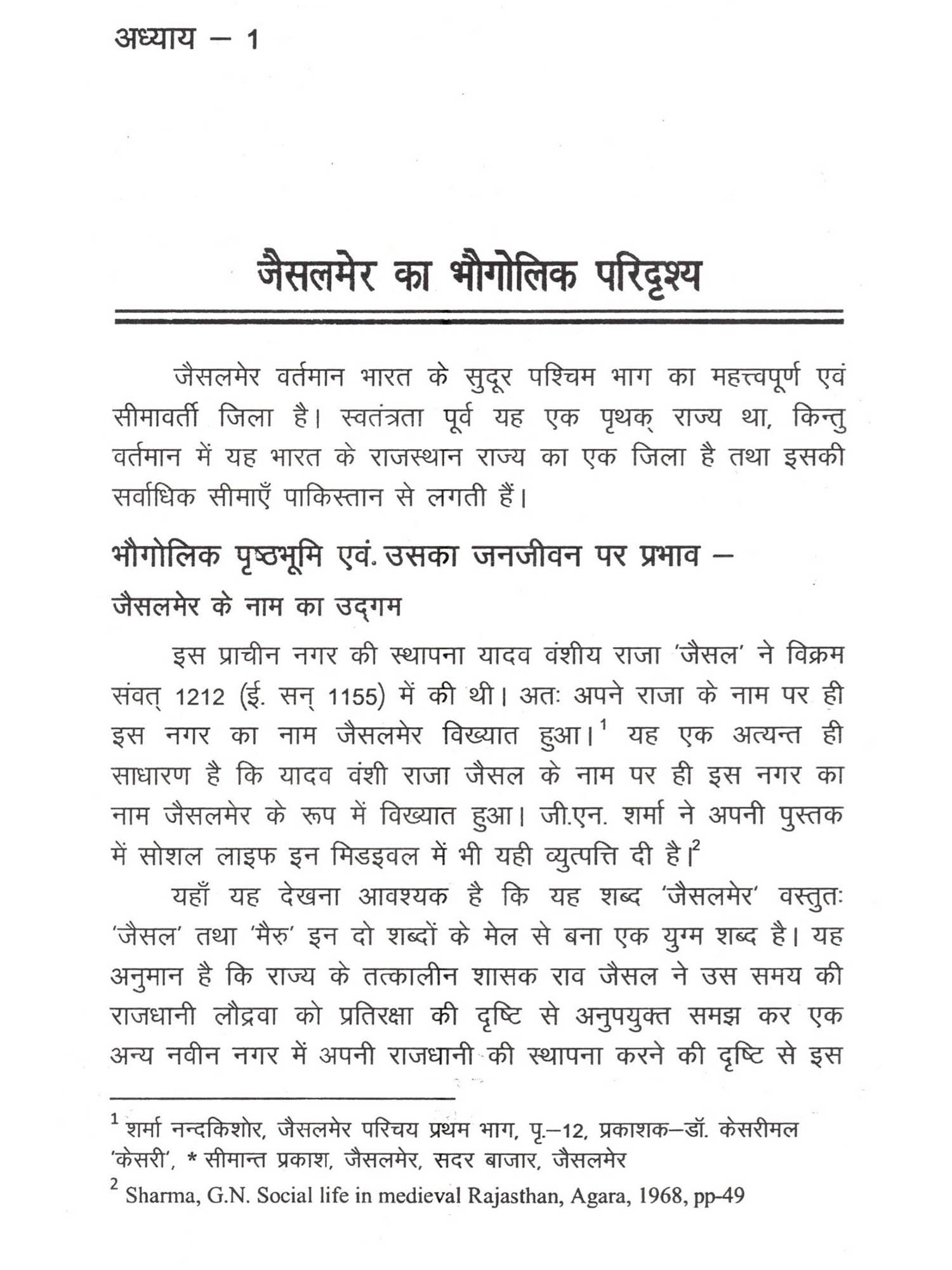 जैसलमेर का राज्य अन्य राज्यों से अत्यन्त प्राचीन होने के कारण अपने आपमें एक प्रभावशाली अद्भुत पहचान रखता है। इसकी स्थापना 1156 ई. में रावल जैसल द्वारा की गई और यहाँ का विकास कर इसे मुख्य नगर के रूप में स्थापित किया। इस क्षेत्र की उत्तर पश्चिम की वह अवस्थिति थी जो इस राज्य के व्यापार वाणिज्य और आर्थिक दृष्टि सम्पन्नता के लिए अत्यन्त महत्त्वपूर्ण थी। यहाँ के व्यापारिक मार्ग भी अपना विशेष स्थान रखते थे। इन मार्गों की सुरक्षा का भी उचित प्रबन्ध गढ़ियों व चौकियों के द्वारा किया गया था। सिन्ध के क्षेत्रों का सामान जैसलमेर मार्ग से होकर ही निकलता था। इसी प्रकार राजपुताने का व्यापारिक वर्ग इसी रास्ते से अपना माल सिन्ध तक पहुँचाते थे। इस हेतु जैसलमेर के शासकों ने मुख्य बाजारों का निर्माण कर अपनी महत्ता को और अधिक सुदृढ़ किया इससे कई व्यापारिक जातियाँ उभर कर सामने आई, स्थापत्य कला की ओर दृष्टि डाले तो पाते हैं कि यहाँ की भव्य इमारतें पीले पाषाणों द्वारा निर्मित अद्भुत सौंदर्य की छटा बिखेरती हैं। यहाँ के भवन, दुर्ग, जैन मंदिर, हिन्दू मंदिर, मृत्यु स्मारक और राजप्रसाद साथ ही जलस्रोत निर्माण व उनका स्थापत्य कारिगरों की कारीगरी एक अलग विशेषता लिए हुए है। यहाँ सामाजिक, सांस्कृतिक इतिहास एक विशेष पहचान लिए हुए है। भिन्न-भिन्न जाति विशेष की वेशभूषा व आभूषण चटक रंगों के कारण विशेष रूप से ध्यान आकृष्ट करती हैं। यहाँ के शासकों के द्वारा किये गए शाके विश्वविख्यात हैं और इनके संघर्षों के अध्ययन से ज्ञात होता है कि यह राज्य जो भाटियों की स्थली था कई बार उजड़ा और कई बार बसा जो गजनी से भटनेर और जैसलमेर तक विस्तृत था। इनके संघर्षों ने जैसलमेर शासकों के वैभव, मान-सम्मान और गौरवान्वित करने वाली स्वाभिमानता को बढ़ाया। जैसलमेर के शासकों ने अपने राज्य में अनेकों स्थापत्य निर्माण करवाए परन्तु शासक वर्ग के साथ-साथ यहाँ के अधिकारी व व्यापारी वर्ग ने भी अनेकों सुन्दर स्थापत्य निर्माण स्वरूप कई हवेलियां बनवाई जिनमें नथमल की हवेली, दीवान सालमसिंह की हवेली, पटवों की हवेलियां अपना विशेष स्थान रखती हैं। उत्तर पश्चिम से होने वाले आक्रमणों से जैसलमेर के शासकों ने रक्षात्मक दृष्टिकोण अपनाया चूंकि यहाँ की अवस्थिति उत्तर पश्चिम की ओर होने के कारण पहला सामना जैसलमेर रियासत का ही होता था। यहाँ के भाटी शासकों ने आक्रान्ताओं को हर संभव राज्य प्रवेश से रोकने का प्रयास किया। अतः ये अपने राज्य में प्रवेश करने वालों को रोकने का द्वार बनकर इस क्षेत्र की रक्षा करते थे। अतः सुरक्षा प्रदान करने के कारण इन्हें 'उत्तर भड़ किवाड़ भाटी' की उपाधि से अलंकृत किया गया था।