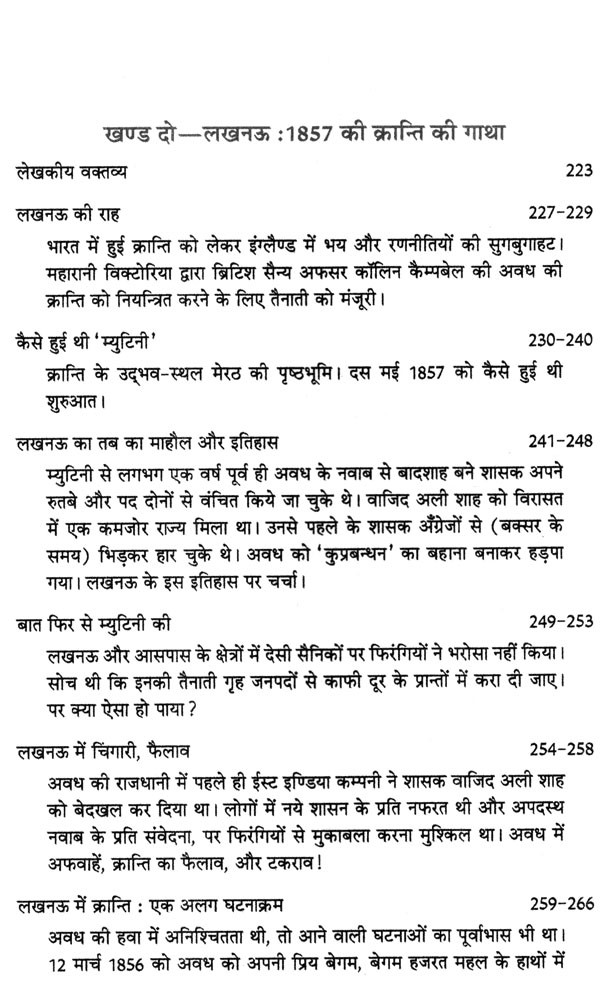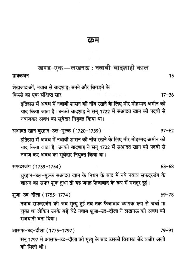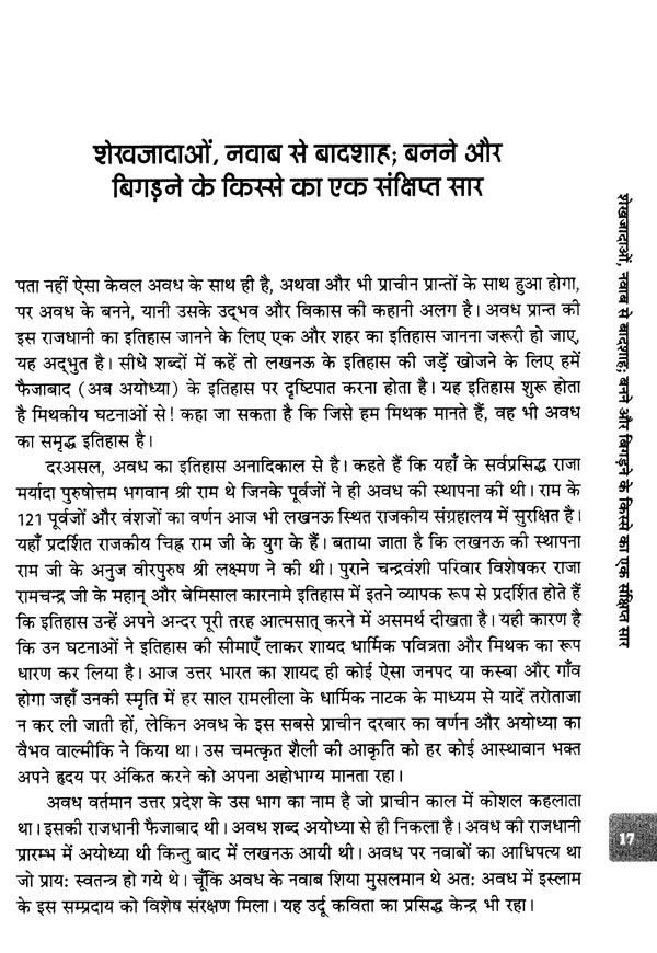 लखनऊः या यूँ कहिए अवध का इतिहास एक वृहद विषय है। यह शून्य से शुरू होकर उत्कर्ष और इंस्ट इण्डिया कम्पनी से ब्रिटिश साम्राज्य के महत्त्वपूर्ण प्रक्षेत्र में बदलने की कहानी है तो शेखजादाओं से आरम्भ होकर नवाबी युग और फिर बादशाहत, 1857 के लम्बे चले संघर्ष का घटनाक्रम भी है। यह उत्तर भारत को उस ऐतिहासिक विरासत, संस्कृति और तहजीब का जोवन्त और विशद आख्यान है, जिसे इतिहास के किसी कालखण्ड में अनदेखा नहीं किया जा सकता। यह पुस्तक अवध के पूरे इतिहास को समेटने का प्रयास न होकर उसके बनने, बिगड़ने, संभलने और नवाबी युग से बादशाहत के साम्राज्य में फैलने संकुचित होने की वह कहानी है, जिसे हम जानने की उत्कण्ठा रखते हैं। इस पुस्तक में शेखजादाओं के बाद से सआदत खान और सफदरजंग के गौरवशाली इतिहास का वर्णन है, उनके शून्य से शिखर तक पहुँचने और चर्चित आखिरी बादशाह वाजिद अली शाह के शासनकाल तक दरक कर विस्मृत हो जाने के समय की कथा के मुख्य बिन्दुओं का लेखन किया गया है। अवध की राजधानी लखनऊ की सत्ता के इस इतिहास में, इन किस्सों में कुछ चीजें जरूर नयी प्रतीत होंगी, तो काफी छूट गयी होंगी, यह स्वाभाविक है। प्रयास यह किया गया है कि जितना लिखा जाए, वह प्रामाणिक हो, पुष्ट हो तथा इतिहास में हो, हमारी कल्पनाओं और विश्लेषण में नहीं। यदि कुछ ऐसा किंवदन्तियों में, पौराणिक गाथाओं, चर्चाओं और लोकसंस्कृतियों में हो, तो उसका यथास्थान उल्लेख अवश्य हो। सन् 1801 के बाद से, जब ब्रिटिश ईस्ट इण्डिया कम्पनी अपनी निश्चितता के साथ उत्तर भारत की प्रमुख रियासतों में पाँव पसार रही थी तो अवध पर उनकी सतर्क निगाह शुरू से ही बनी हुई थी।