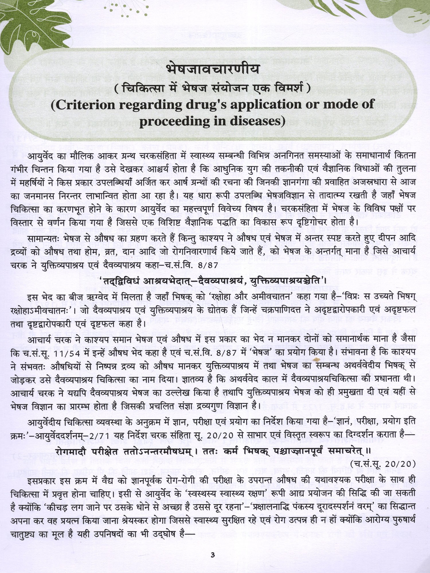 आयुर्वेद औषध सम्पदा का विशाल भण्डार है। इसमें प्रायः वानस्पतिक द्रव्य हैं जो भारत की भूमि में उगते एवं सुलभहैं। अपनी सहज विशेषताओं के कारण प्राचीनकाल में जितनी आवश्यकता थी उससे कहीं अधिक उपयोगिता आज है जिससे व्यक्ति के शरीर एवं मन का संतुलन हो और समाज में सुख, शान्ति और समन्वय का वातावरण बन सके।