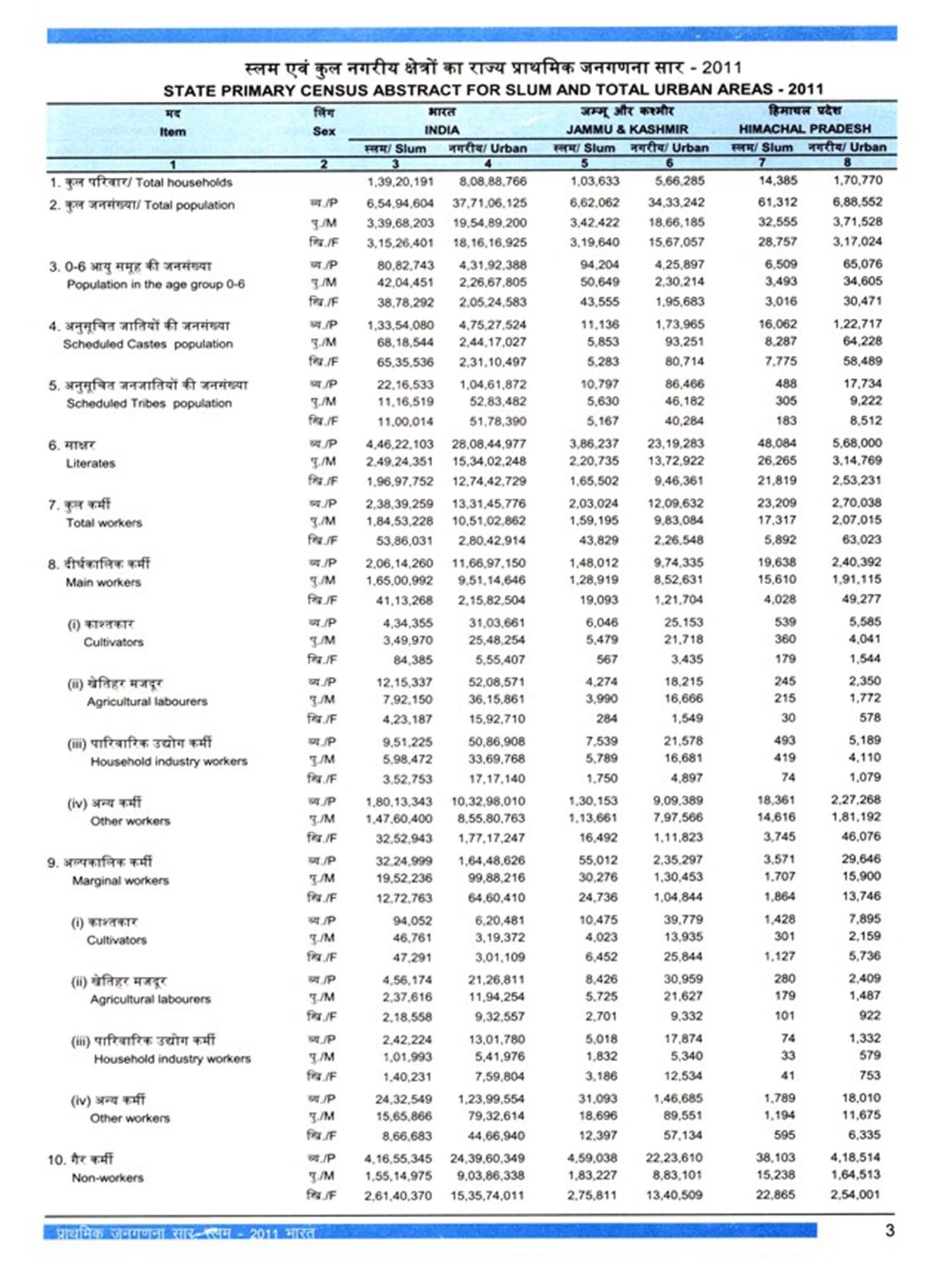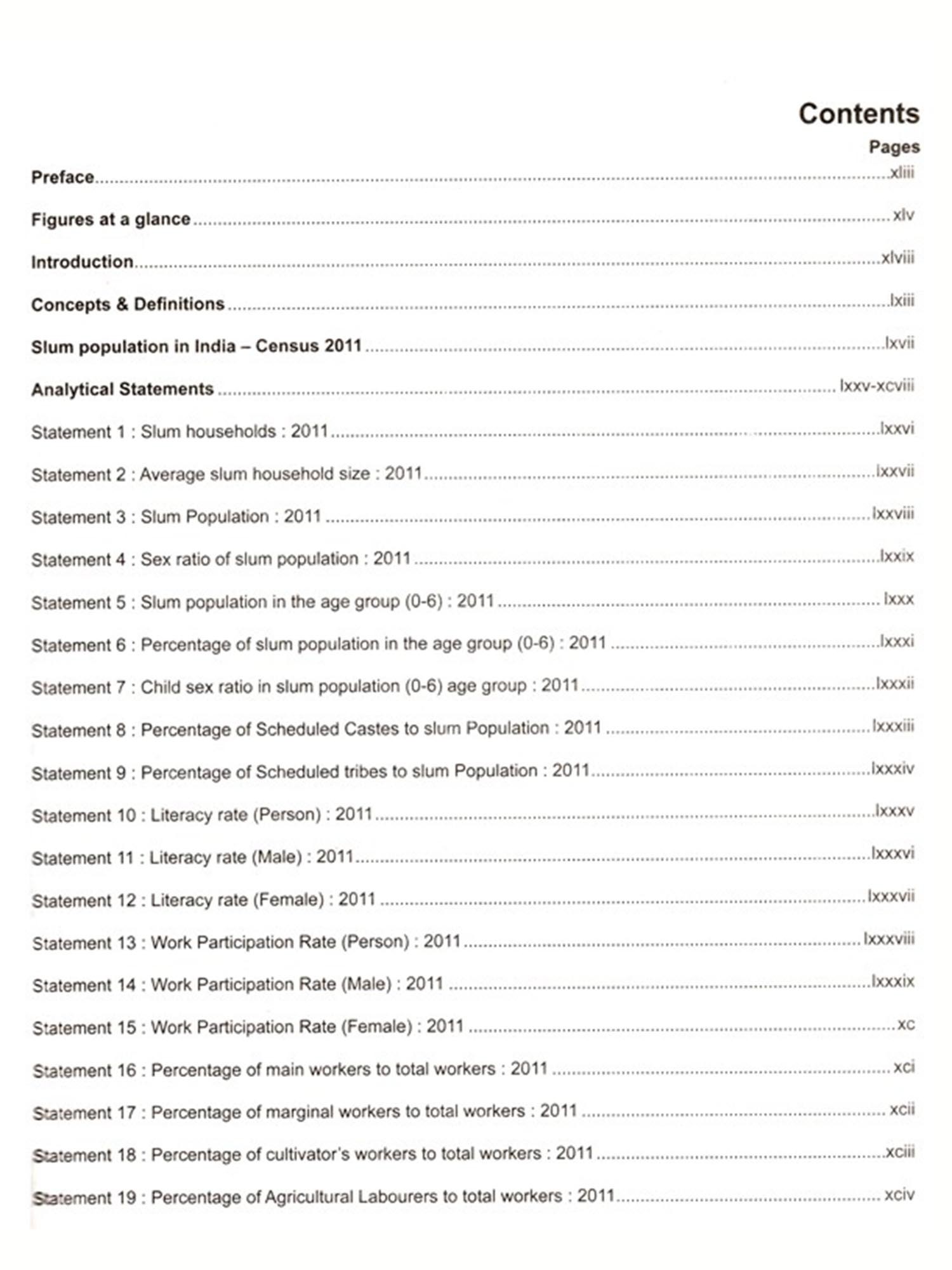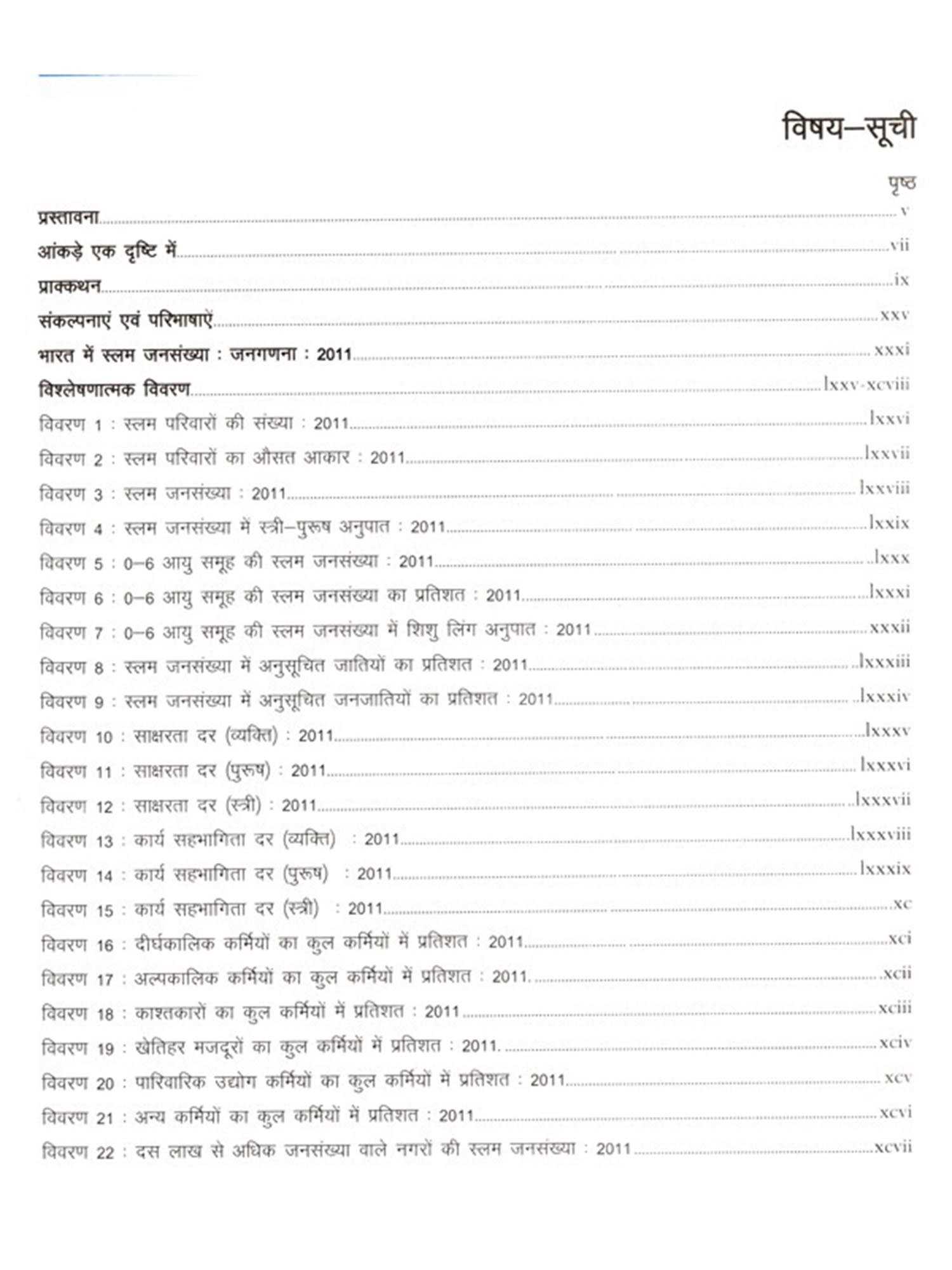 यह प्रकाशन जनसंख्या की गणना के दूसरे चरण के आधार पर स्लम निवासियों के जनसांख्यिकीय, सामाजिक-आर्थिक पहलुओं को सामने लाता है। इस प्रकाशन में स्लमों के संबंध में उपलब्ध करवाई गई विस्तृत जानकारी भविष्य में उनमें सुधार तथा पुनर्वास के लिए एक प्रभावी और समन्वित नीति तैयार करने के लिए आवश्यक है।