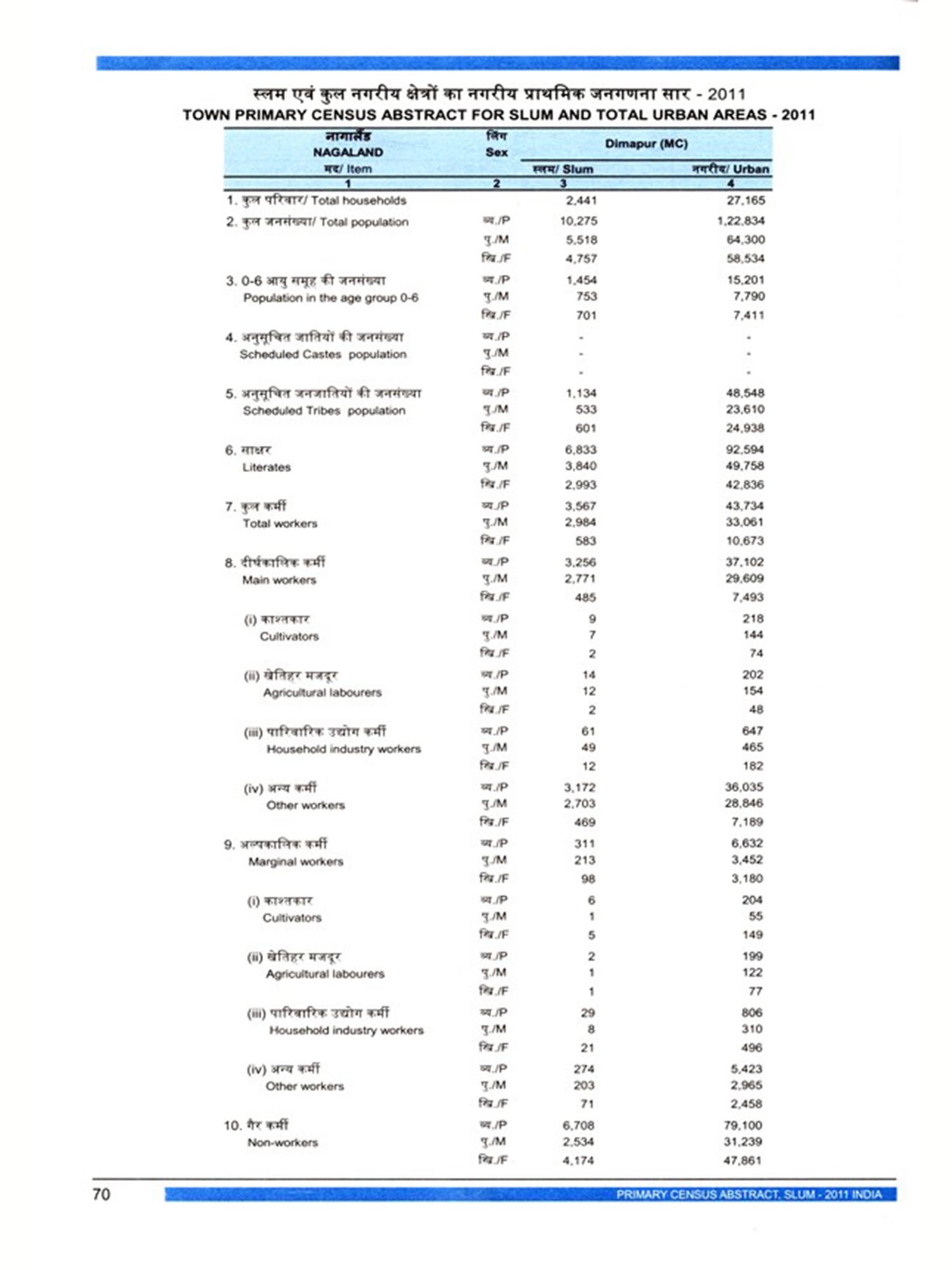 In Census 2011, slums have been identified in all statutory towns irrespective of their population size. The identity of slum areas was kept separate to the extent possible. The population characteristics of the slum dwellers were collected through the same questionnaire i.e. the "Household Schedule" canvassed for the entire population.