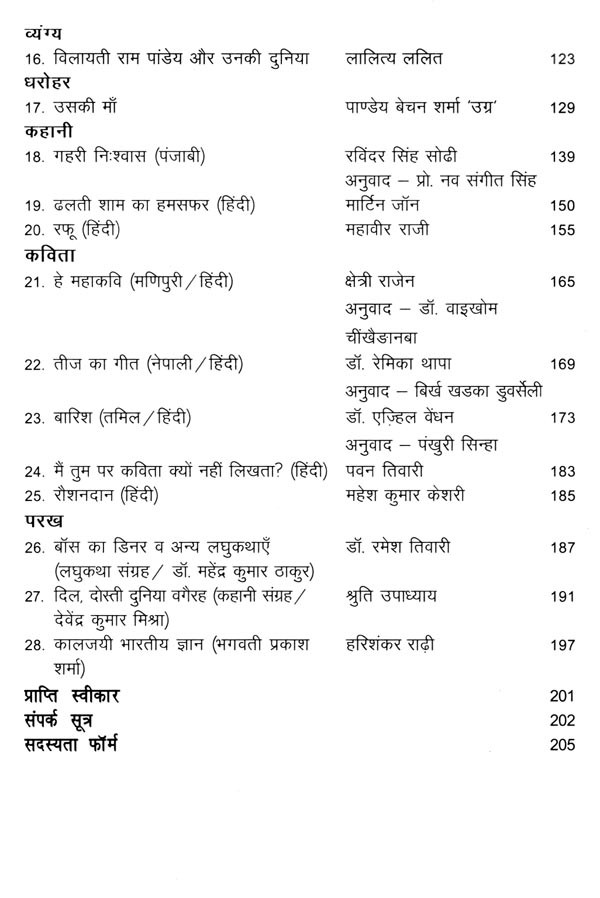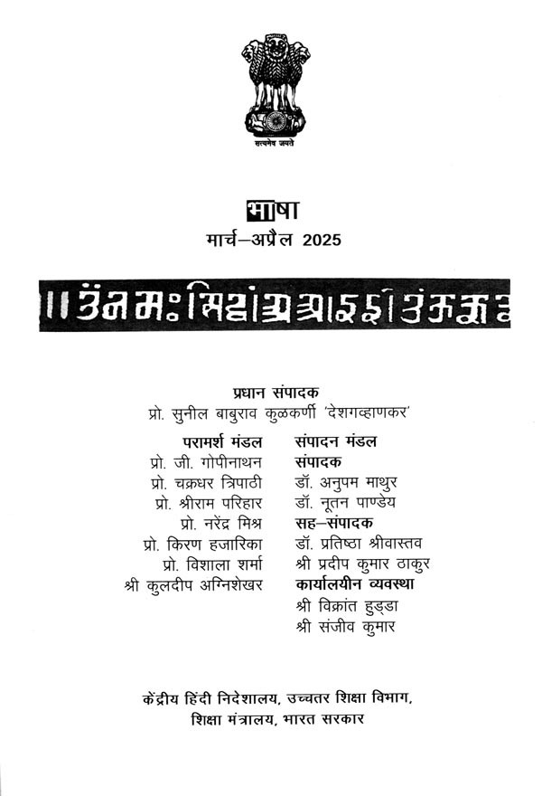 भाषा पत्रिका परिवार ही नहीं, अपितु समस्त निदेशालय परिवार के लिए यह अत्यंत सौभाग्य और गर्व का विषय है कि इस वर्ष प्रगति मैदान, नई दिल्ली में आयोजित विश्व पुस्तक मेले में लेखक मंच पर भाषा पत्रिका के रामदरश मिश्र जन्मशती विशेषांक का लोकार्पण स्वयं शतीपुरुष डॉ. रामदरश मिश्र जी के करकमलों द्वारा संपन्न हुआ। भाषा पत्रिका ऐसे ही सुखमय क्षणों को अपने इतिहास में समेटकर समय के साथ चलते हुए समग्र भारतीय साहित्य की संपन्नता से स्वयं को और अपने सुधी पाठकों को समृद्ध करती रहे, इसी सुदृढ़ विश्वास के साथ आपके समक्ष पत्रिका का यह अंक समर्पित है। आपकी प्रतिक्रियाओं की प्रतीक्षा रहेगी।