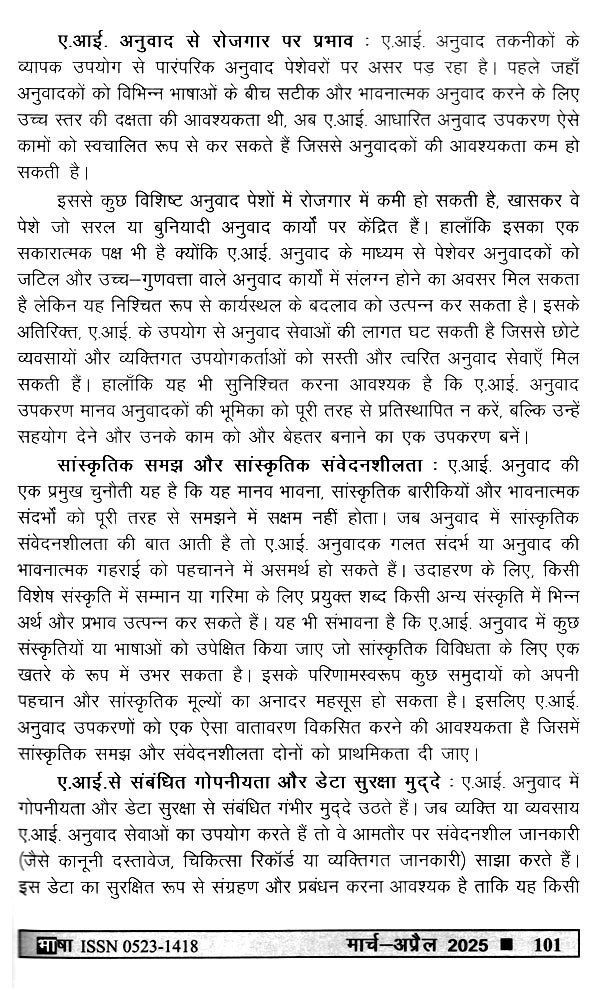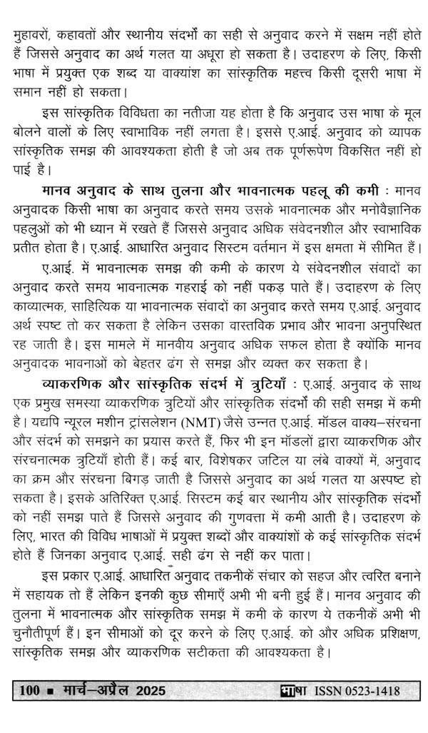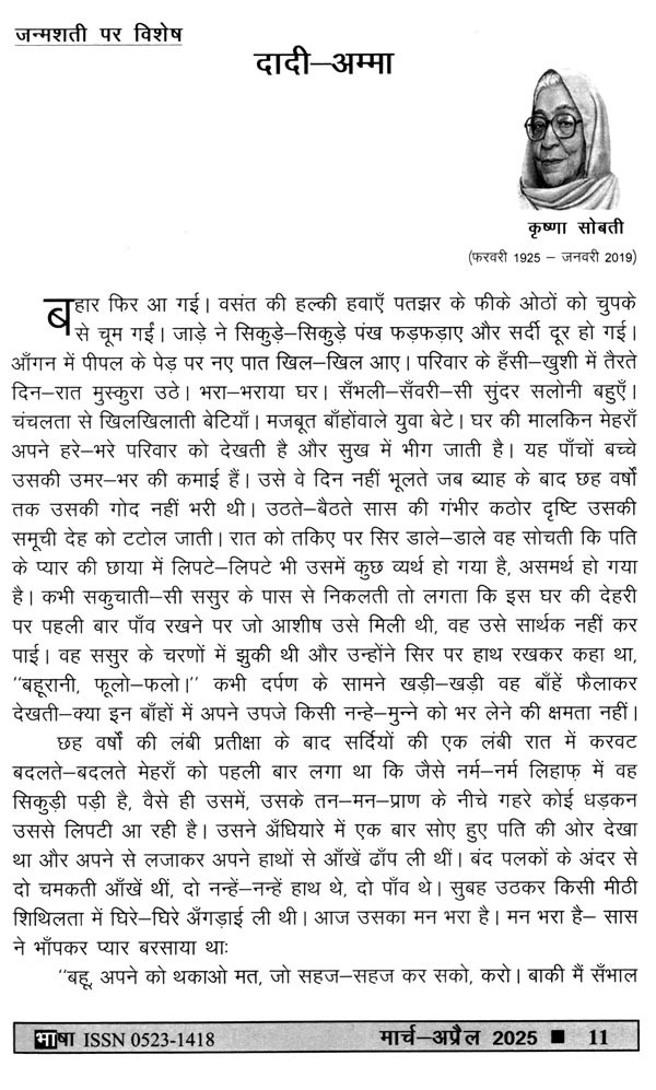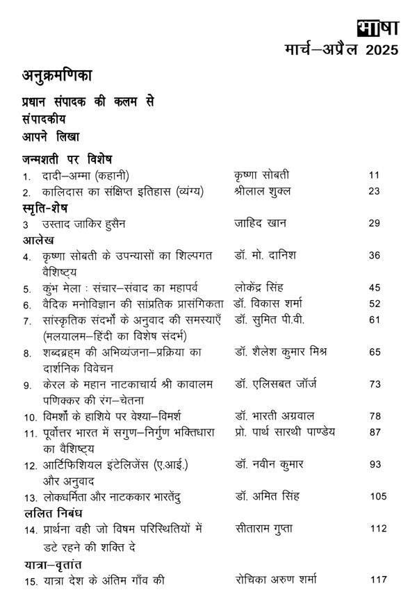 वर्ष 2025 हिंदी के मूर्धन्य साहित्यकारों- कृष्णा सोबती जी तथा श्रीलाल शुक्ल जी का जन्मशती वर्ष है। अपनी अपूर्व कथात्मक अभिव्यक्ति और सुगठित रचनात्मकता के लिए विख्यात कृष्णा सोबती जी ने हिंदी के कथा साहित्य को विलक्षण स्वरूप प्रदान किया है। साधारण और सरल शब्दों के बावजूद उनके भाषा संस्कार की सजीवता और संयमितता हमारे युग की अनेक कटु और जटिल सच्चाइयों को इस प्रकार अनावृत करती है कि पाठक-हृदय सहज और स्वतः उससे जुड़ जाता है। उन्हें 1990 में साहित्य अकादमी पुरस्कार तथा 1996 में साहित्य अकादमी अध्येतावृत्ति से सम्मानित किया गया था। 2017 में इन्हें भारतीय साहित्य के सर्वोच्च सम्मान ""ज्ञानपीठ पुरस्कार"" से सम्मानित किया गया है। उद्देश्यपूर्ण व्यंग्य-लेखन के लिए प्रसिद्ध श्री लाल शुक्ल जी को उनके उपन्यास 'राग दरबारी' (1968) के लिए साहित्य अकादमी पुरस्कार से सम्मानित किया गया। उनके इस उपन्यास पर एक दूरदर्शन-धारावाहिक का निर्माण भी हुआ। श्रीलाल शुक्ल को भारत सरकार द्वारा वर्ष 2008 में पद्मभूषण पुरस्कार से सम्मानित किया गया है। ये दोनों ही रचनाकार अपने रचना-कर्म द्वारा न केवल हिंदी साहित्य की धरोहर है अपितु नई पीढ़ी के लेखकों के लिए भी प्रेरणा-स्रोत और मार्गदर्शक हैं। समादृत कृष्णा सोबती जी तथा श्रीलाल शुक्ल जी की जन्मशती के अवसर पर भाषा पत्रिका के इस अंक में कृष्णा सोबती जी की कहानी 'दादी अम्मा' तथा श्रीलाल शुक्ल जी के व्यंग्य 'कालिदास का संक्षिप्त इतिहास' को शामिल किया गया है।