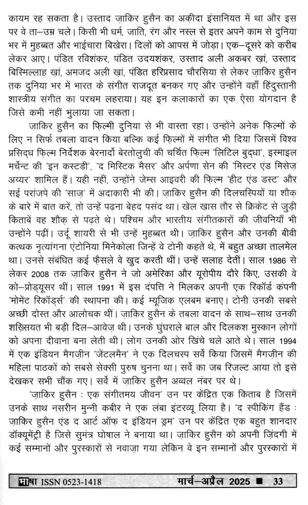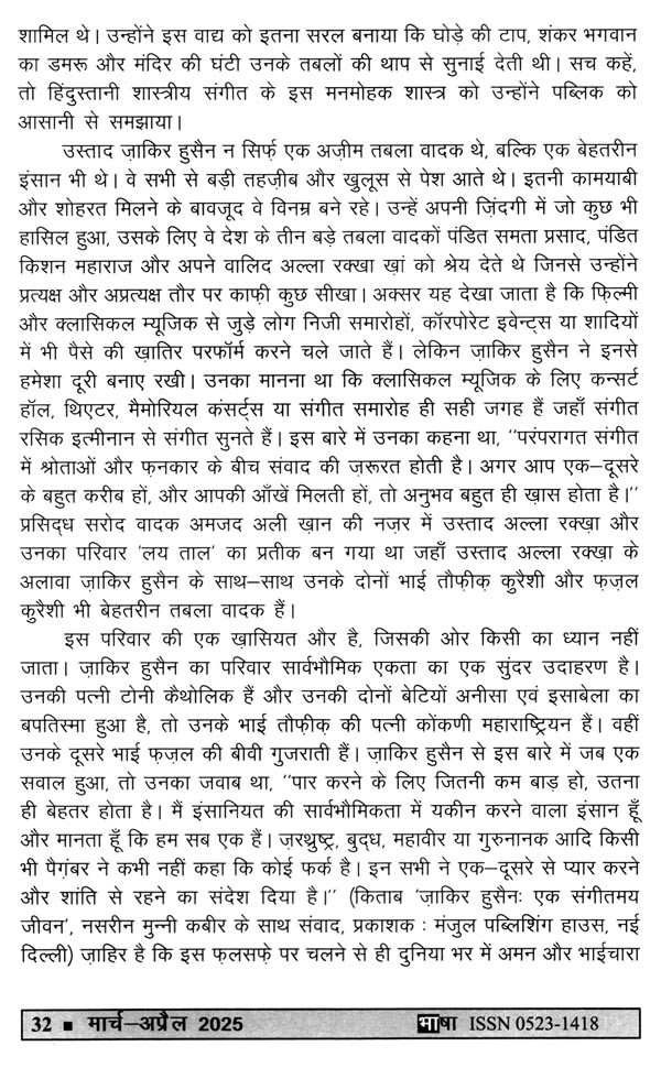 पिछले वर्ष भारतीय शास्त्रीय संगीत के विशिष्ट आइकॉन, मशहूर तबलावादक श्री जाकिर हुसैन जी का देहावसान हो गया। संगीत को भाषिक, भौगोलिक एवं सांस्कृतिक परिधियों से परे ले जाकर विश्व के एकात्म में स्थापित करना ऐसे ही महान संगीत-आराधकों के अथक प्रयासों से संभव हो पाता है। दिवंगत आत्मा के प्रति श्रद्धांजलि स्वरूप संगीत की दुनिया में उनके योगदान को रेखांकित करता आलेख भी इस अंक में शामिल किया गया है।