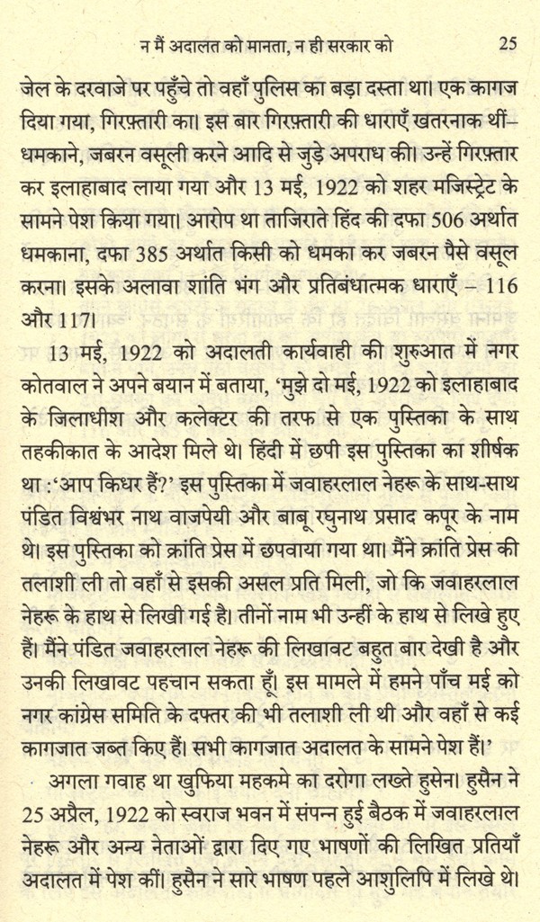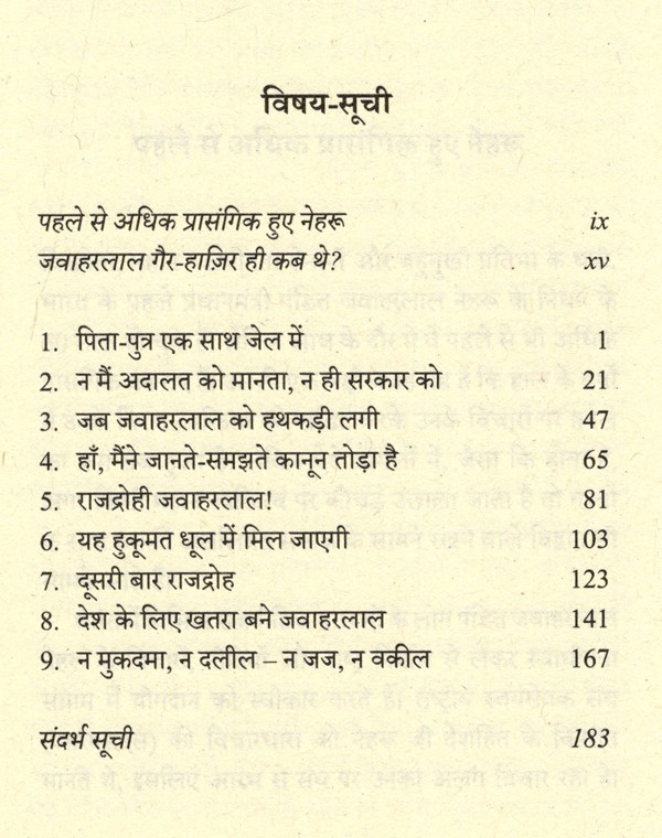 वास्तव में यह कहानी है कि किस तरह नेहरू ने सन् 1915 से 1947 तक लगातार संघर्ष में जेल और अदालत को अपनी बात कहने का माध्यम बनाया। हमारी आजादी की यात्रा, कारावास और कानून के सँकरे गलियारों से होते हुए हमारे संविधान तक पहुँची। यह पुस्तक महज अदालती कार्यवाही का दस्तावेज्ज नहीं है, जवाहरलाल नेहरू की जेल यात्राओं के दौरान घटित महत्त्वपूर्ण घटनाओं और स्वतंत्रता संग्राम के अनगिनत अनाम सेनानियों के संघर्षों का दस्तावेज़ है।