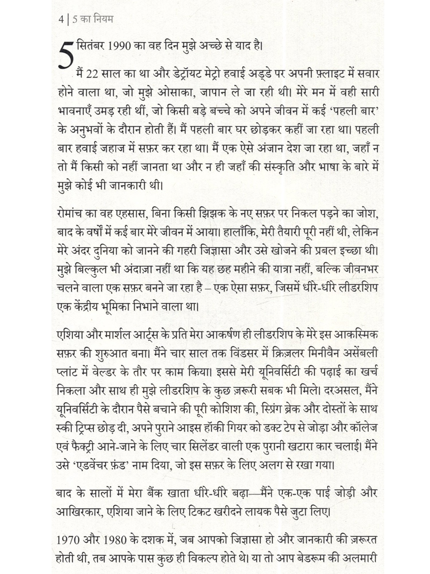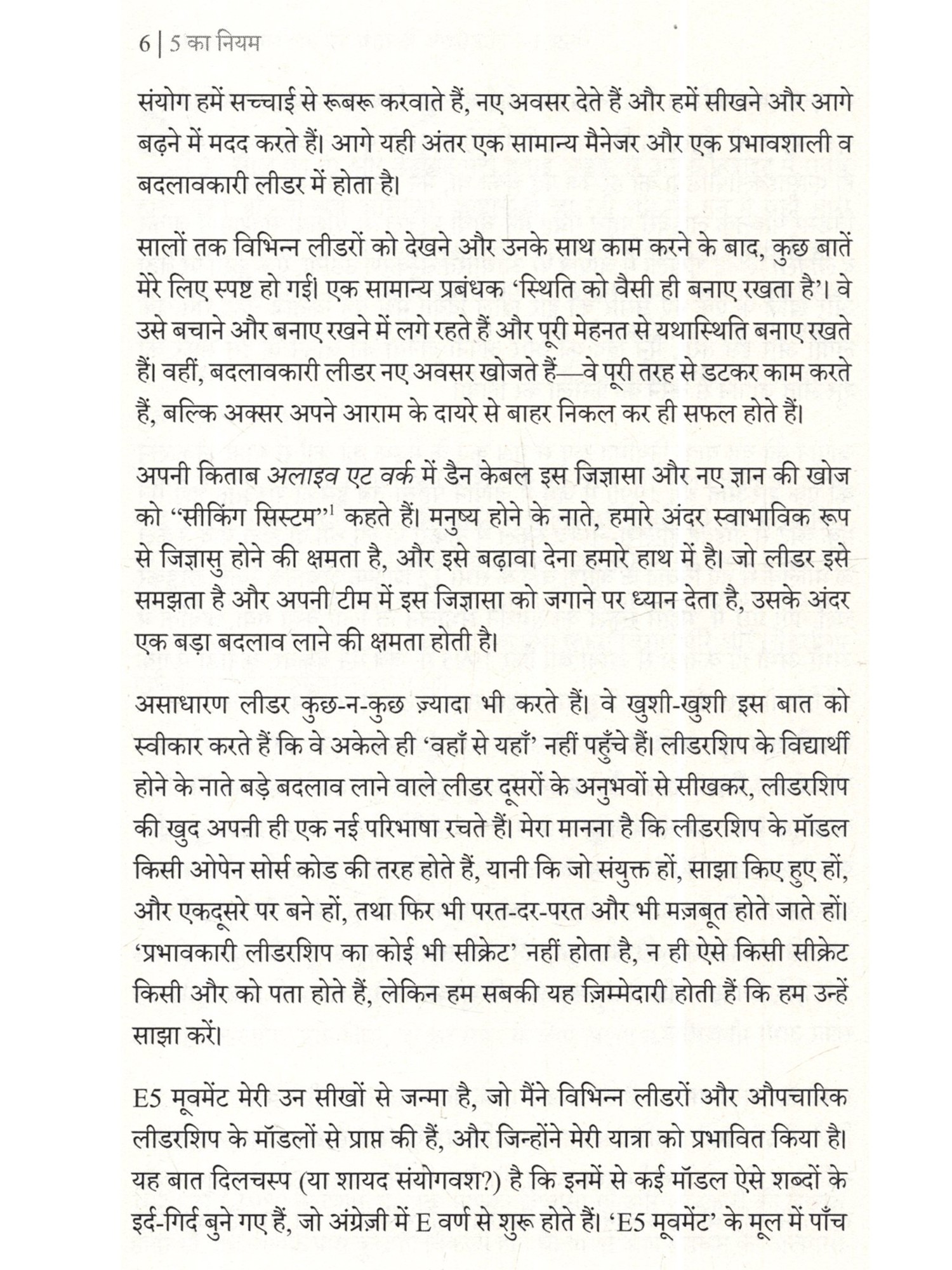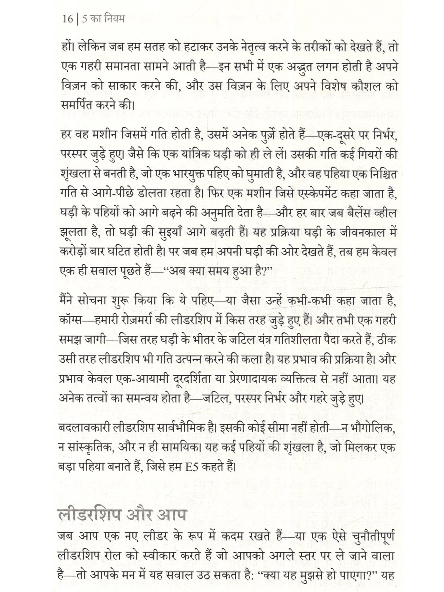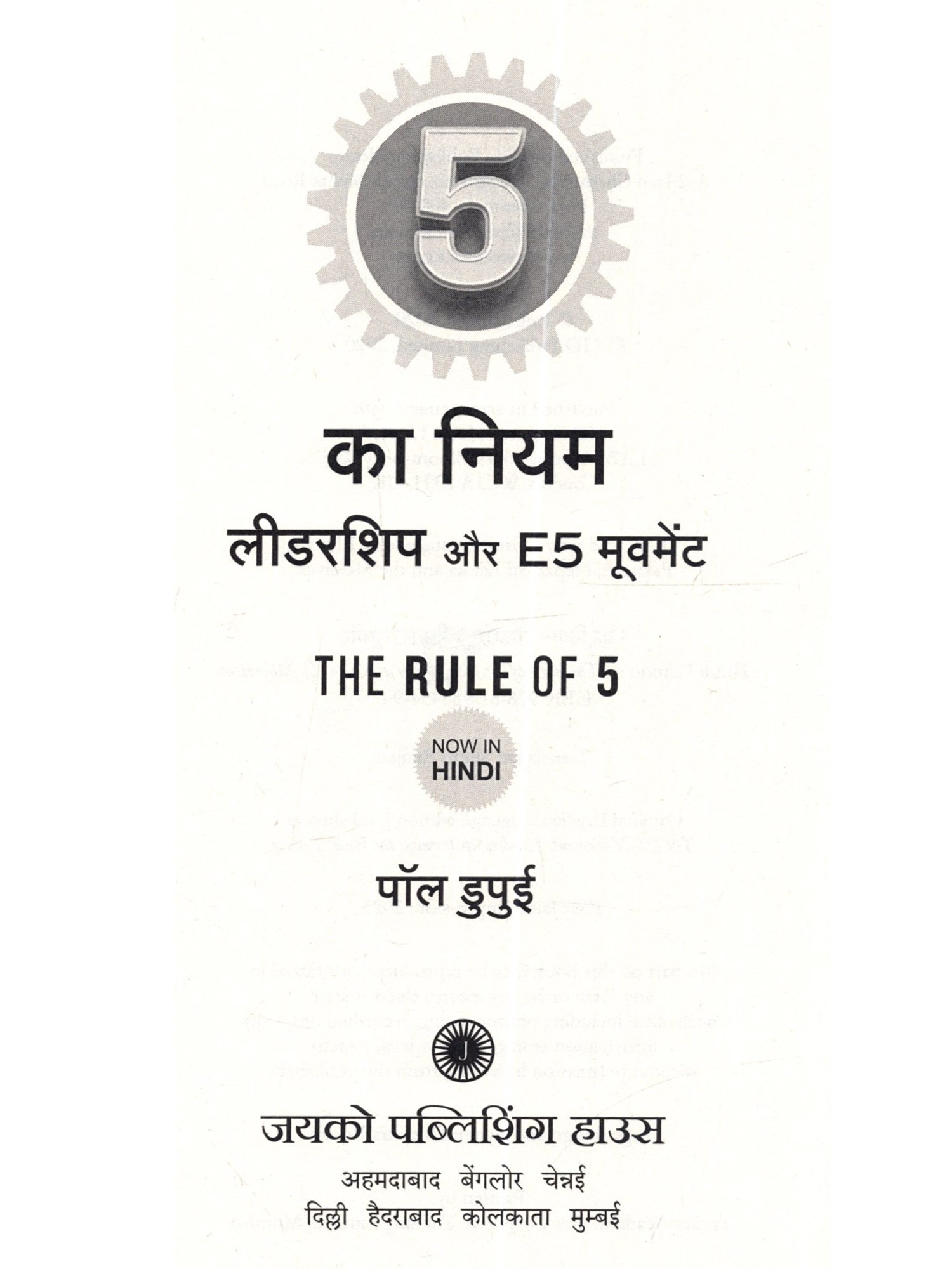 जापान के किसी पार्क की बेंच पर सोनेवाले एक युवा बैकपैकर से लेकर दुनिया की सबसे बड़े कॉर्पोरेट दिग्गज कंपनियों में से एक के सीनियर लीडर बनने तक के अपने सफ़र में पॉल डुपुई ने एक एथलीट, स्वयंसेवक और सीईओ के तौर पर अपने अनुभव के साथ परिवर्तनकारी लीडरशिप के जरिए अपना करियर खुद बनाया। 5 का नियम पुस्तक में विचारा गया E5 का फॉर्मूला जाना-पहचाना भी है और नया भी। यह लीडरशिप का एक ऐसा मॉडल है जिसकी नींव 'दिग्गजों के समर्थन' पर आधारित है। इसकी सीख ऐसे लीडरों से ली गई है जिनमें शामिल हैं 'समानुभूति' और 'सक्षम बनाने' को अपने लीडरशिप दृष्टिकोण के मूल में रखनेवाले, पैनासोनिक के संस्थापक, कोनोसुके मात्सुशिता; अपने 3E को साथ लेकर चलनेवाले जैक वेल्च, जिन्होंने फिर प्रॉक्टर ऍड गैम्बल के बॉब मैकडॉनल्ड को खुद 5E के संस्करण को ईजाद करने के लिए प्रेरित किया, और जिम कॉलिन्स जिन्होंने निष्पादन को मूल में रखते हुए गुड टु ग्रेट पुस्तक में लेवल 5 लीडरशिप का अपना संस्करण साझा किया। E5 मूवमेंट एक आह्वान है दुनियाभर के सभी लीडर्स के लिए कि वे पूरे प्रभाव के साथ कदम उठाने हेतु दुनिया का नेतृत्व करें। यह पाँच E हैं परिकल्पना करना, अभिव्यक्त करना, रोमांचित करना, सक्षम करना और निष्पादित करना। लीडरशिप के यह पाँचों नियम समय व सीमाओं से परे हैं। असल जीवन से लिए गए उदाहरण इस पुस्तक की संवादात्मक शैली के साथ मिलकर इसे सभी के लिए समझने-योग्य व प्रभावशाली बनाते हैं। यह विचारोत्तेजक व व्यवहारिक पुस्तक लीडरों को विवश कर देगी कि वे खुद अपनी लीडरशिप के बारे में सोचें और अपनी-अपनी टीमों का नेतृत्व करने के अपने मिशन में पाँचो E को अपनाएँ, जो वाकई में परिवर्तनकारी हो सकता है। आप भी अपने पाँच चुनकर इस आंदोलन में शामिल हो जाएँ।