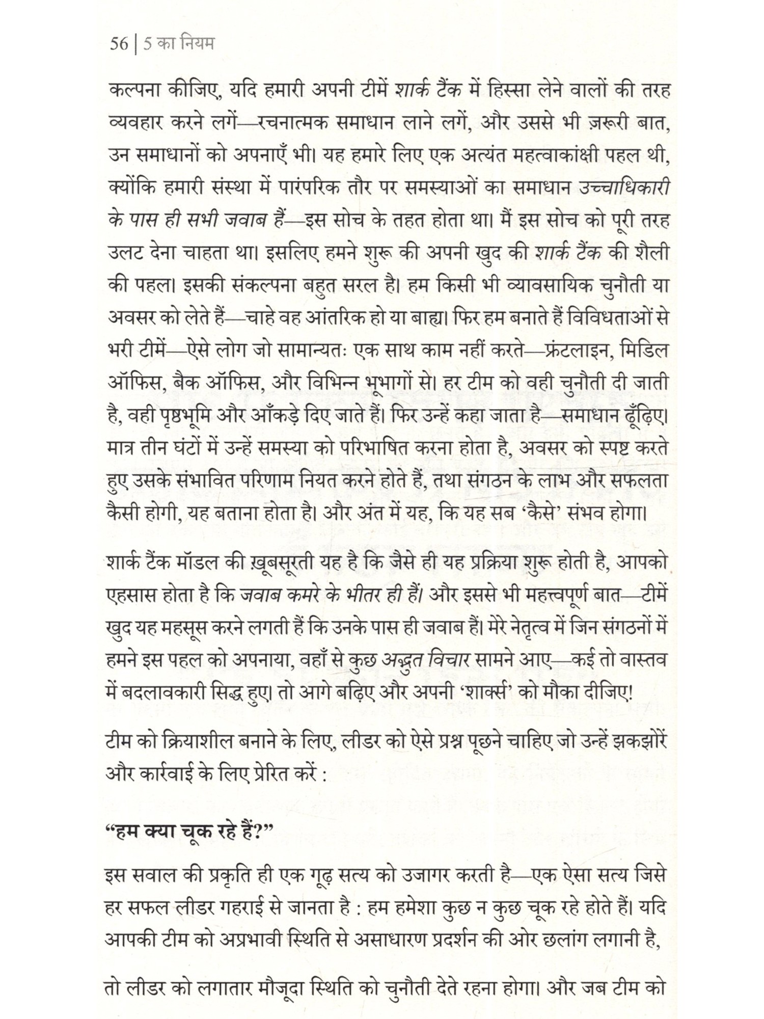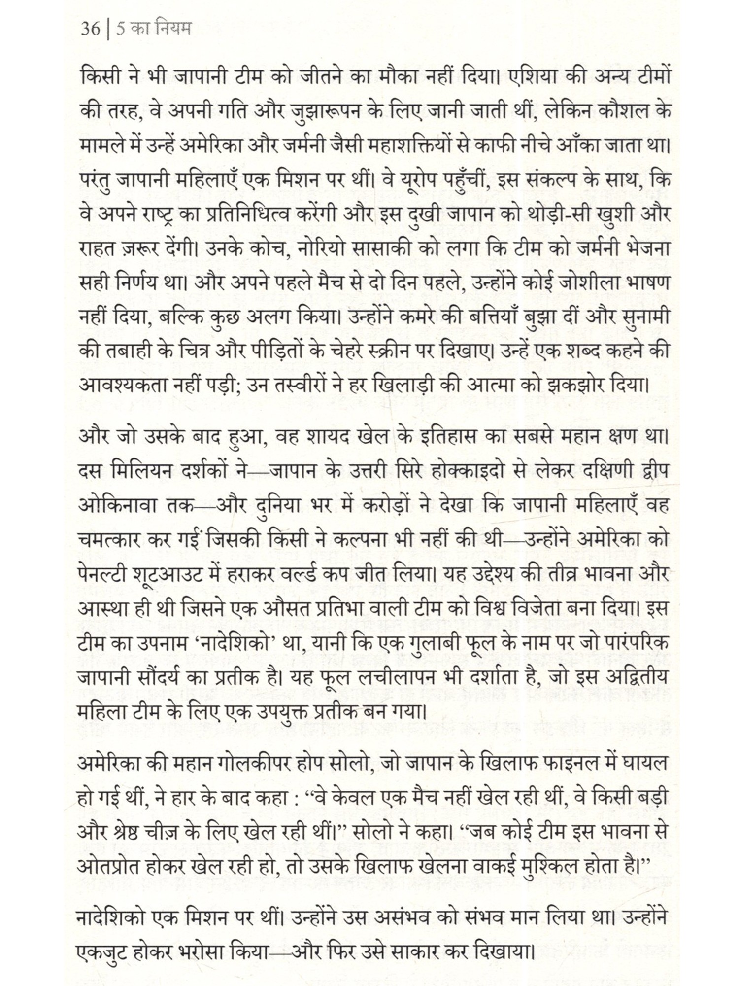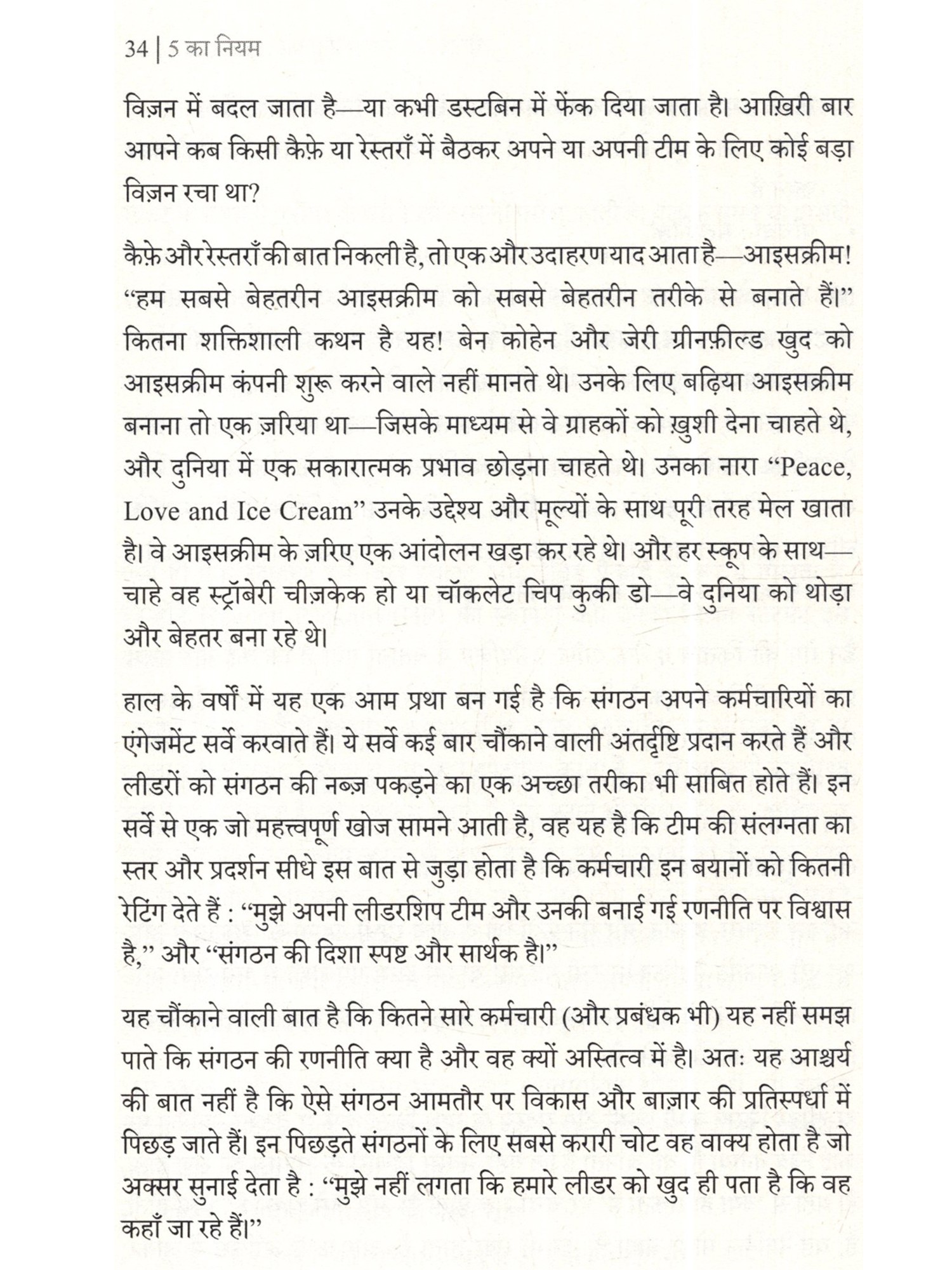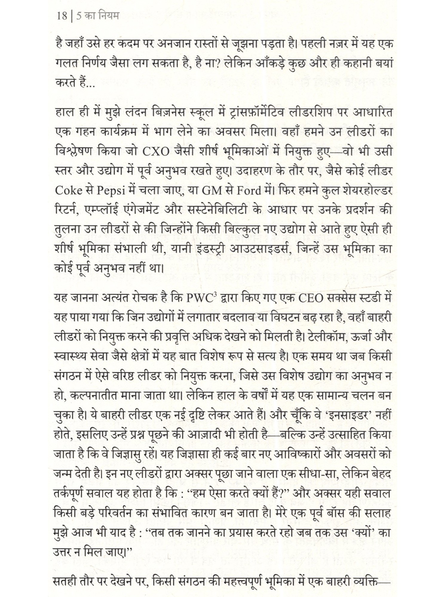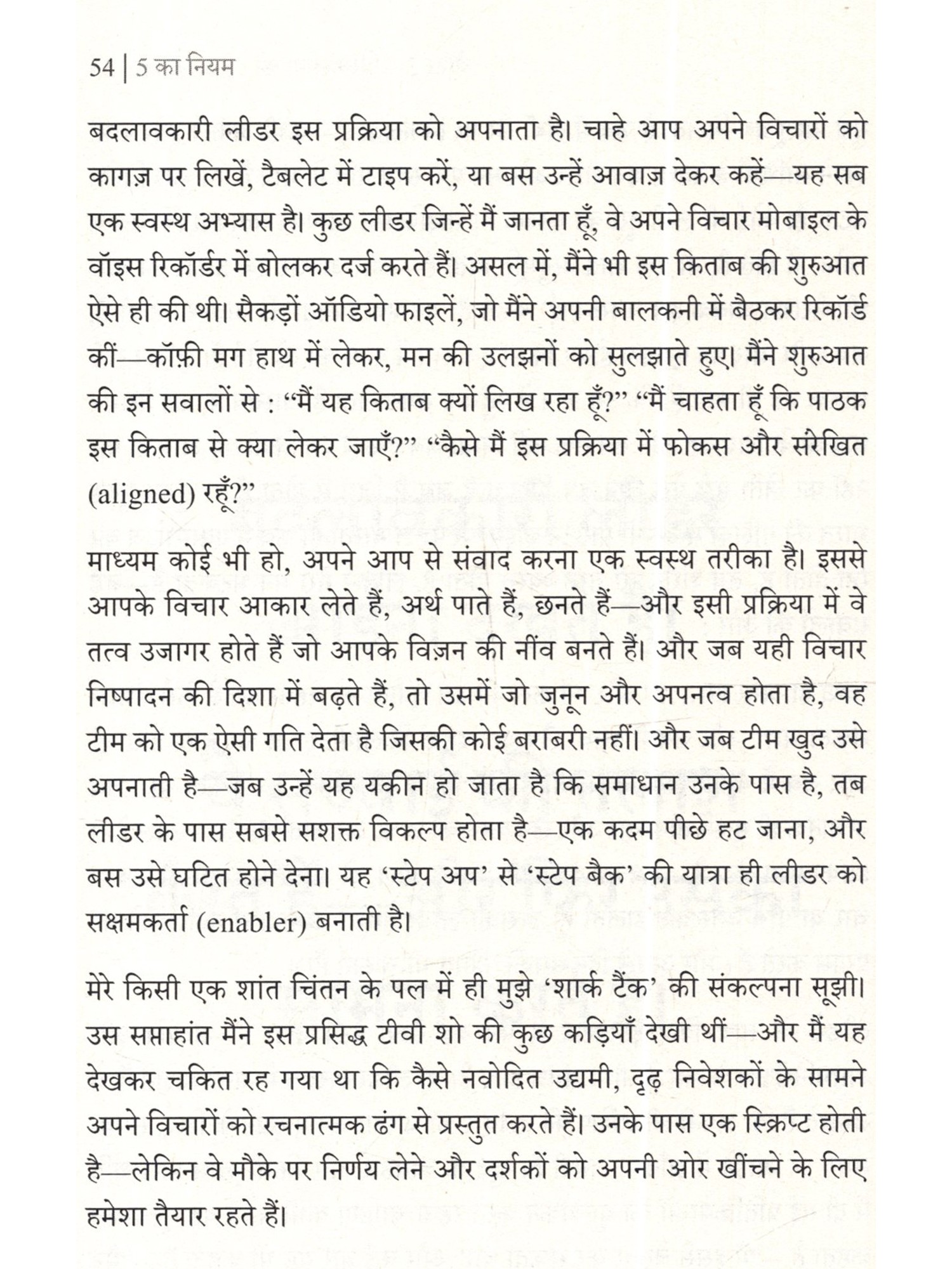 जापान के किसी पार्क की बेंच पर सोनेवाले एक युवा बैकपैकर से लेकर दुनिया की सबसे बड़े कॉर्पोरेट दिग्गज कंपनियों में से एक के सीनियर लीडर बनने तक के अपने सफ़र में पॉल डुपुई ने एक एथलीट, स्वयंसेवक और सीईओ के तौर पर अपने अनुभव के साथ परिवर्तनकारी लीडरशिप के जरिए अपना करियर खुद बनाया। 5 का नियम पुस्तक में विचारा गया E5 का फॉर्मूला जाना-पहचाना भी है और नया भी। यह लीडरशिप का एक ऐसा मॉडल है जिसकी नींव 'दिग्गजों के समर्थन' पर आधारित है। इसकी सीख ऐसे लीडरों से ली गई है जिनमें शामिल हैं 'समानुभूति' और 'सक्षम बनाने' को अपने लीडरशिप दृष्टिकोण के मूल में रखनेवाले, पैनासोनिक के संस्थापक, कोनोसुके मात्सुशिता; अपने 3E को साथ लेकर चलनेवाले जैक वेल्च, जिन्होंने फिर प्रॉक्टर ऍड गैम्बल के बॉब मैकडॉनल्ड को खुद 5E के संस्करण को ईजाद करने के लिए प्रेरित किया, और जिम कॉलिन्स जिन्होंने निष्पादन को मूल में रखते हुए गुड टु ग्रेट पुस्तक में लेवल 5 लीडरशिप का अपना संस्करण साझा किया। E5 मूवमेंट एक आह्वान है दुनियाभर के सभी लीडर्स के लिए कि वे पूरे प्रभाव के साथ कदम उठाने हेतु दुनिया का नेतृत्व करें। यह पाँच E हैं परिकल्पना करना, अभिव्यक्त करना, रोमांचित करना, सक्षम करना और निष्पादित करना। लीडरशिप के यह पाँचों नियम समय व सीमाओं से परे हैं। असल जीवन से लिए गए उदाहरण इस पुस्तक की संवादात्मक शैली के साथ मिलकर इसे सभी के लिए समझने-योग्य व प्रभावशाली बनाते हैं। यह विचारोत्तेजक व व्यवहारिक पुस्तक लीडरों को विवश कर देगी कि वे खुद अपनी लीडरशिप के बारे में सोचें और अपनी-अपनी टीमों का नेतृत्व करने के अपने मिशन में पाँचो E को अपनाएँ, जो वाकई में परिवर्तनकारी हो सकता है। आप भी अपने पाँच चुनकर इस आंदोलन में शामिल हो जाएँ।