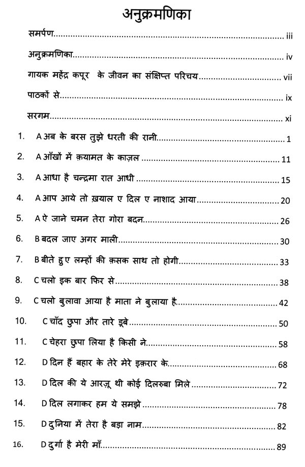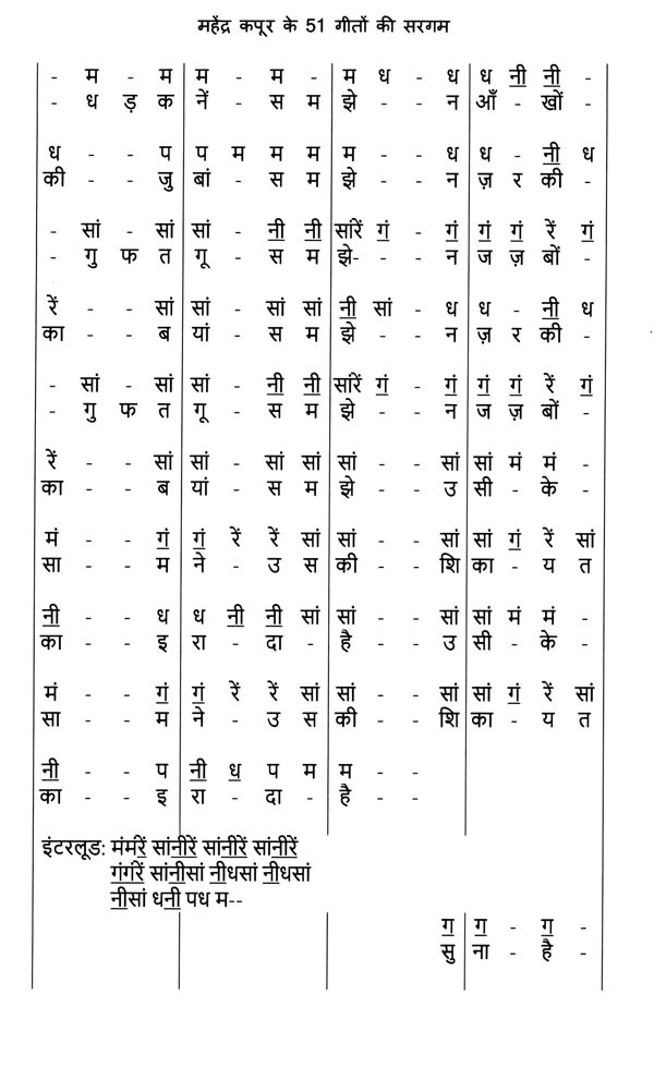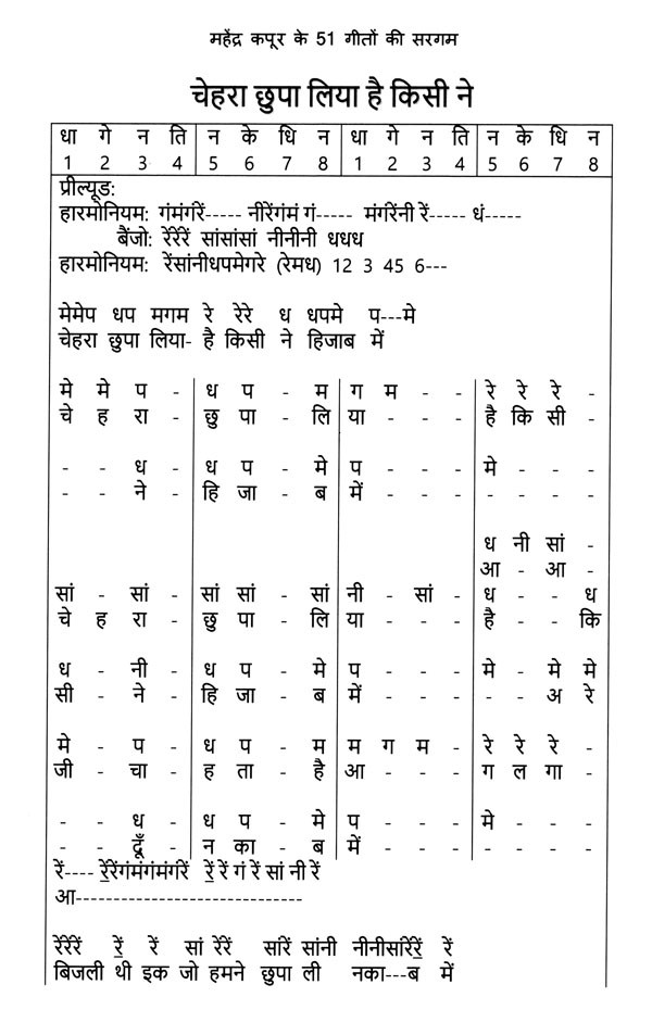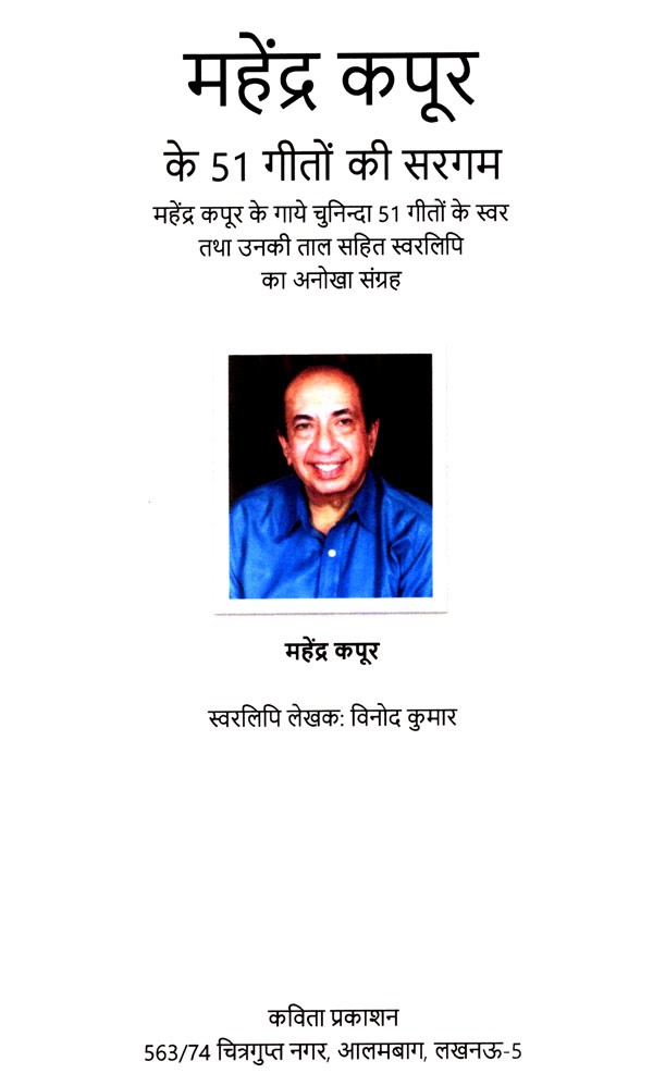 सुप्रसिद्ध गायक महेंद्र कपूर ने एक से बढ़कर एक हिट गीत गाये हैं. उनके अनेक एकल और युगल गीत सदाबहार हैं और अत्यंत प्रसिद्ध हैं. लोग उनके गीर्ता के दीवाने हैं और नित्य ही उनके गीत सुनते व गाते हैं. इस पुस्तक में उनके गाये गीतों के बोल और उनकी स्वरलिपि आसान रूप में लय ताल के साथ प्रस्तुत की गयी है. गीतों की ताल, उसके साथ बजाई जाने वाली कोर्ड, और हर गीत का सा हिंदी भाषा में लिख दिया गया है जिससे गीतों को समझने और गाने बजाने में अत्यंत सुविधा होगी. इस पुस्तक में उनके चुनिन्दा 51 मशहूर गीतों की स्वरलिपि प्रस्तुत हैं. संगीत प्रेमियों को गीत अपने वाद्य पर बजाने में यह पुस्तक सहायक होगी. यह संग्रह करने योग्य पुस्तक है|