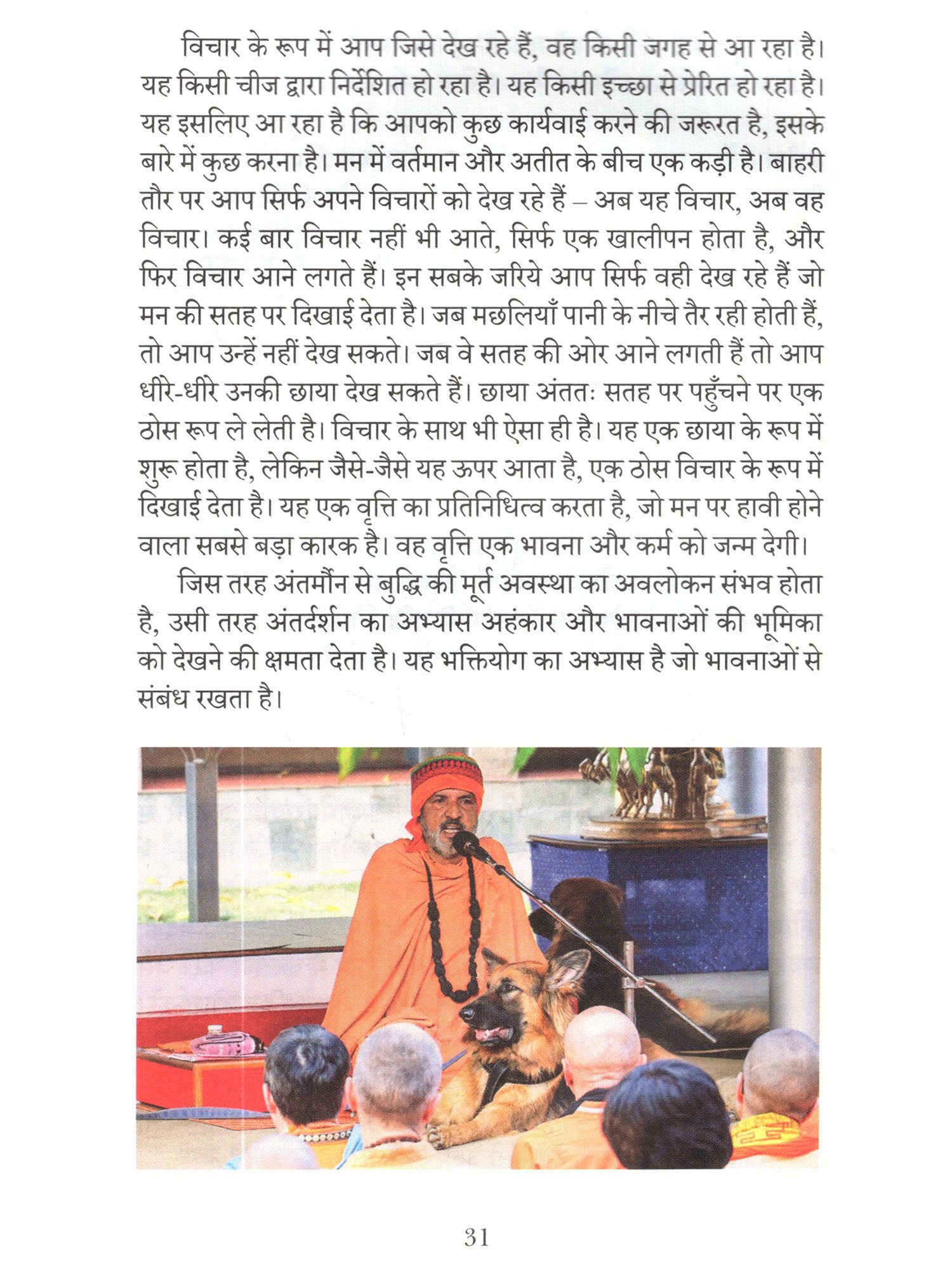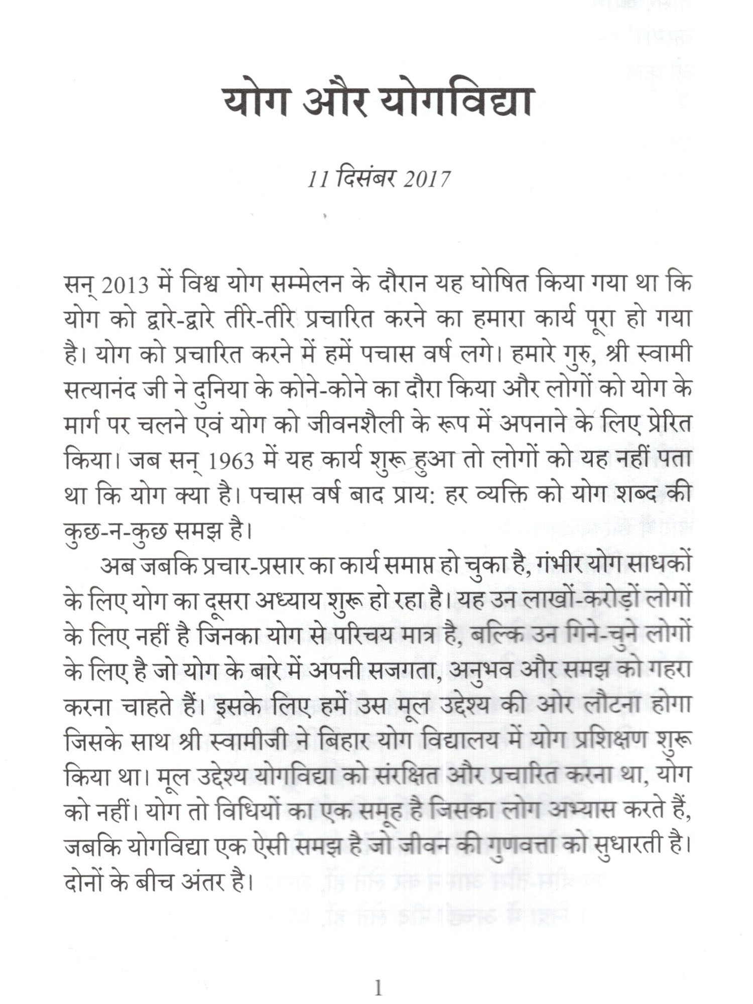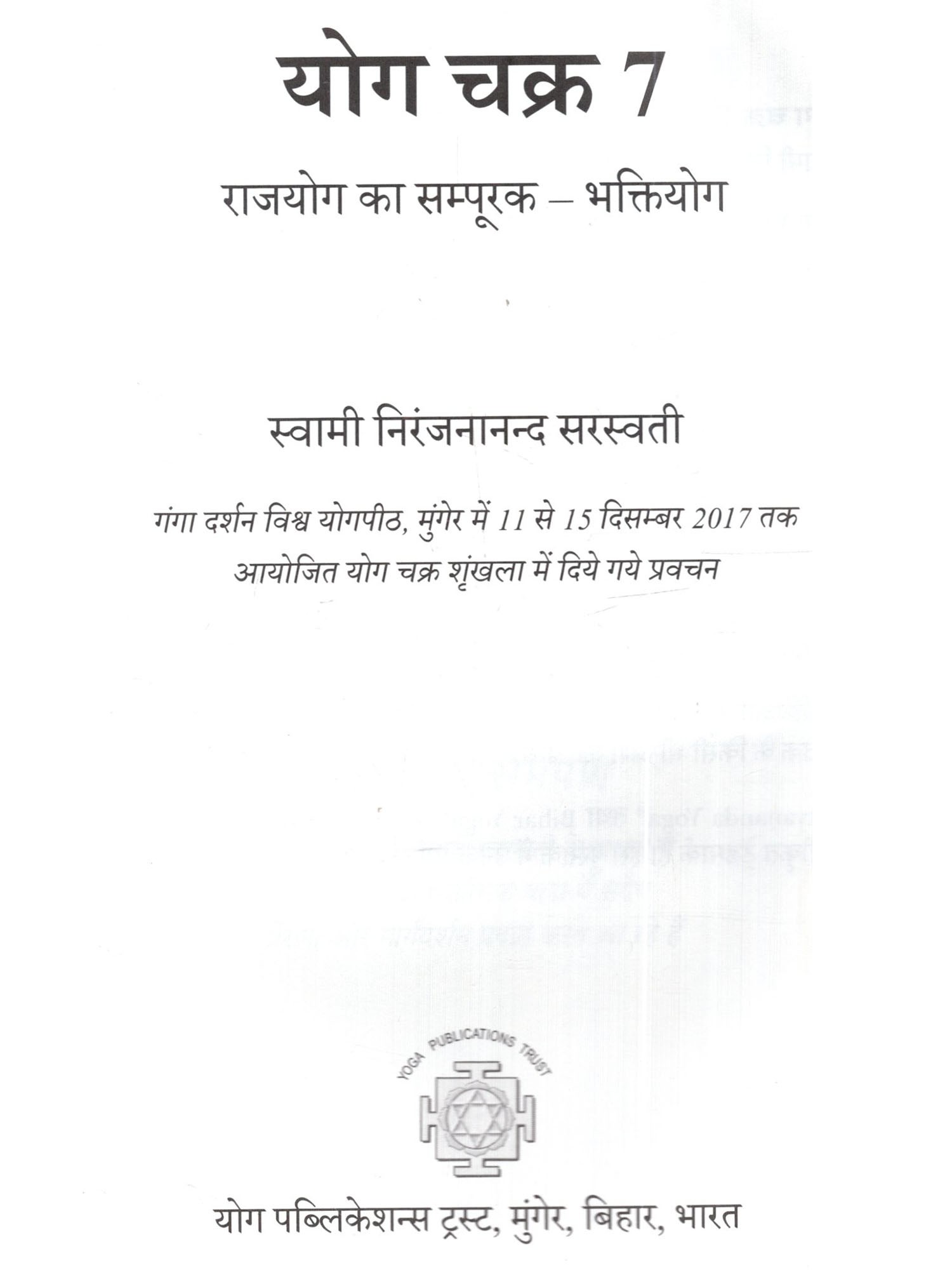 स्वामी निरंजनानंद जी ने गंगा दर्शन विश्व योगपीठ में ।। 15 दिसंबर 2017 तक आयोजित योग चक्र कार्यक्रम के दौरान मन्गस्तुत की। यह कार्यक्रम योग के अगले अध्याय को विकसित कराने की प्रक्रिया का अंग था, जिसका लक्ष्य योग विद्या से जुड़कर इसके गहन आयामों का अन्वेषण करना है। सत्संगों का विषय राजयोग और भक्तियोग था, जो षडंगीय रोग चक्र के दो महत्त्वपूर्ण अंग है। स्वामीजी ने समझाया कि किस प्रकार राजयोग और भक्तियोग एक-दूसरे के सन्पूरक है. इसलिए इन्हें अलग-अलग प्रणालियों के रूप में नहीं देखा जाना चाहिए। उन्होंने प्रतिभागियों को इन दोनों योगशाखा ओं की समानांतर यात्रा करावी, जिसमे वे मन और भावनाओं के बीच सामंजस्य लाने की प्रक्रिया का गहराई से अनुभव कर सके। स्वामीजी ने इस विषय पर कई भ्रांतियों को स्पष्ट किया और प्रतिभागियों को अपनी व्यक्तिगत समझ एवं अनुभव विकसित करने के लिए प्रोत्साहित किया ताकि वे योग के उभरने दसरे अध्याय के संदेशवाहक बन सके।