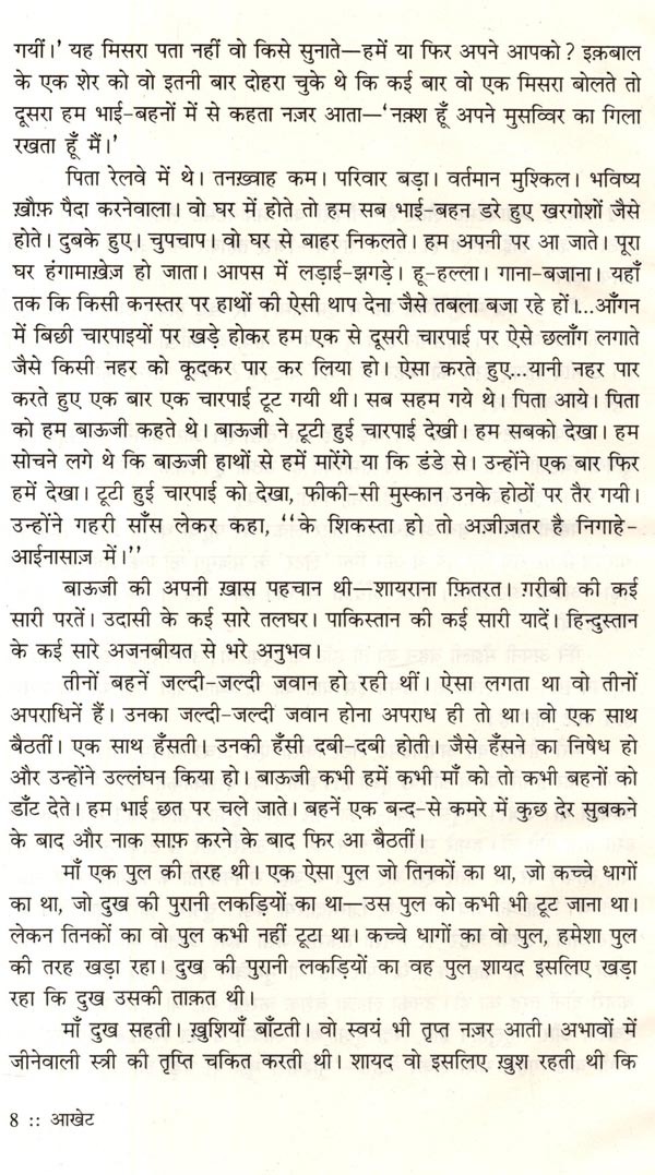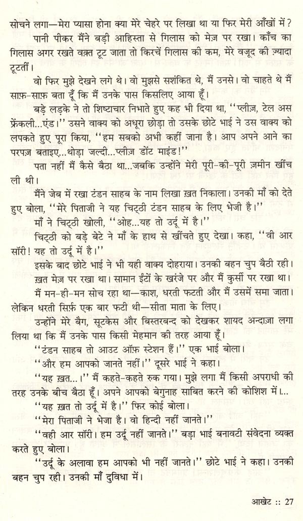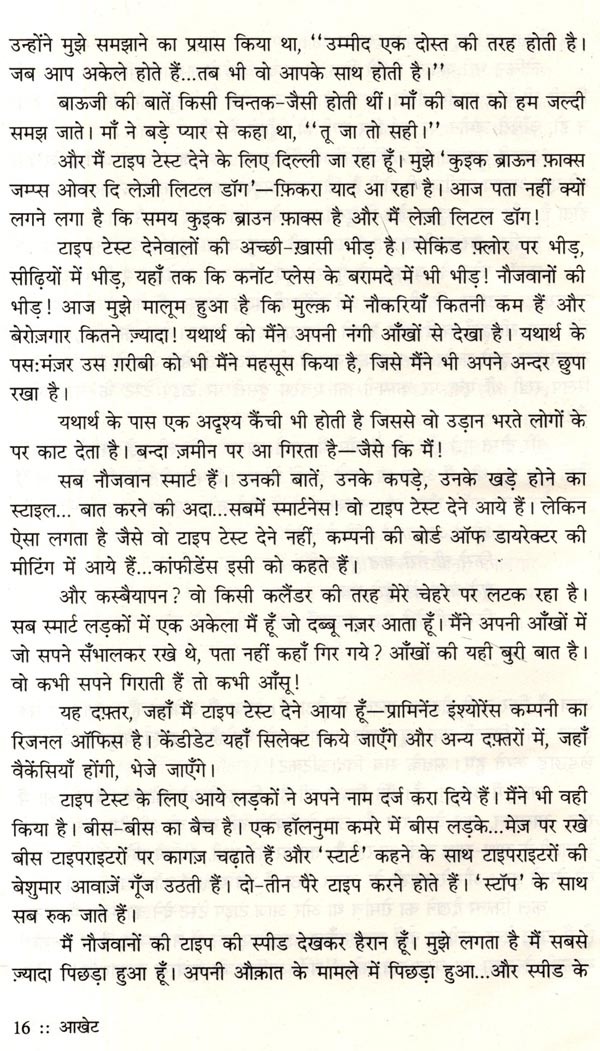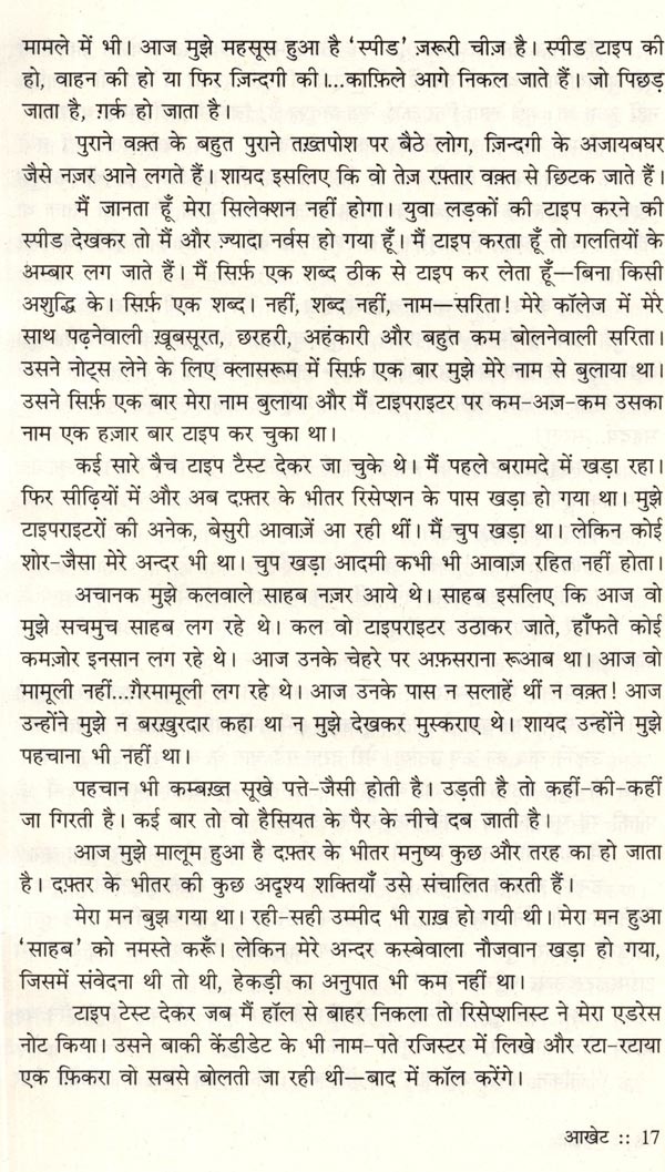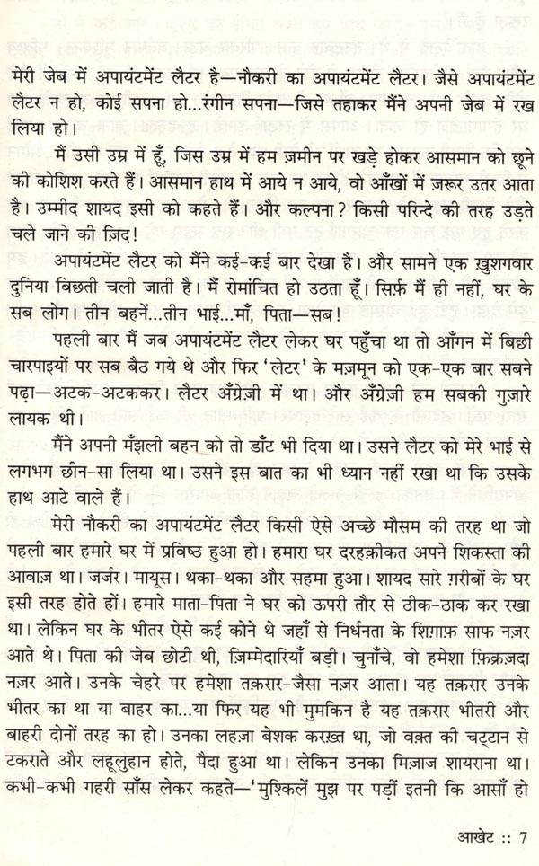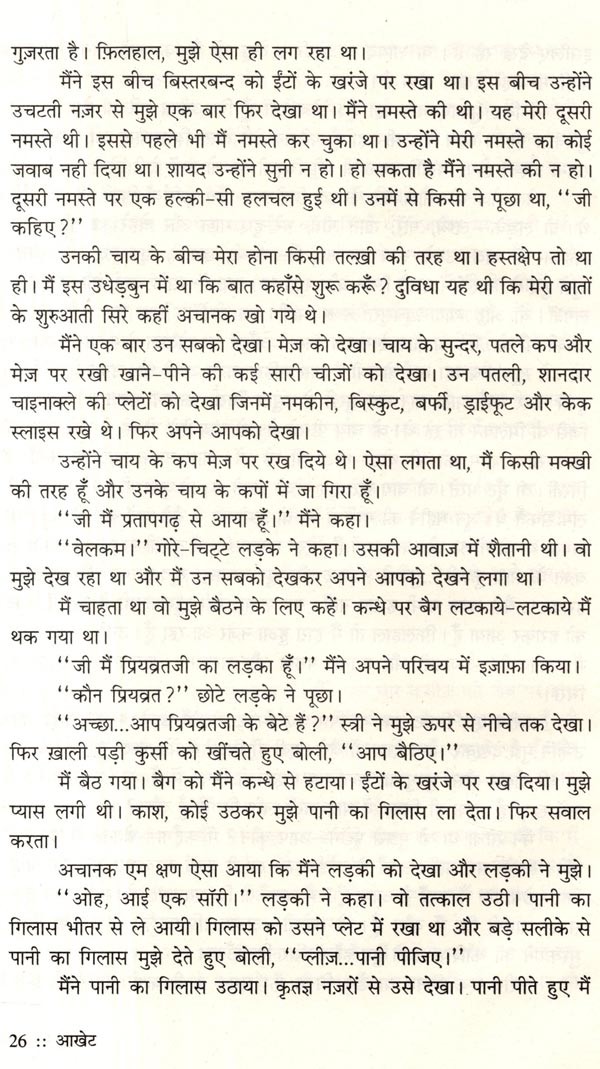 आखेट उपन्यास एक बेरोजगार युवक चेतन के घर परिवार, जीवन-संघर्ष, महत्त्वाकांक्षा, सपने, प्रेम, दोस्ती, तनाव, अकेलापन तथा उपेक्षाओं से लड़ने और ताक़त हासिल करने की कथा है। अम्बाला छावनी की जिस इंश्योरेंस कम्पनी में चेतन (रीजनल आफ़िस दिल्ली से) नियुक्ति पत्र लेकर जाता है, वहाँ का भ्रष्ट और ताक़तवर तन्त्र उसे आउटसाइडर की तरह उपेक्षित और प्रताड़ित करता है। लेकिन चेतन... ऐसे तनावपूर्ण और ख़ौफ़ज़दा माहौल में भी जीवन राग को ढूँढ़ने का प्रयास करता रहता है। कम्पनी की बाहरी भव्यता के पसः मंज़र संशय का वातावरण है। कार्यालय के शिखर पुरुष, काय। और भ्रष्ट हैं। वे खुद को बचाने तथा दूसरे को गिराने का खेल खेलते रहते हैं- किसी आखेट की तरह। यह 'इन डोर गेम' किसी रूपक की तरह है जो हमारे समाज, सियासत और सम्बन्धों में, किसी न किसी रूप में मौजूद है। शायद इसलिए कि संसार में तुच्छताओं का अपना प्रतिसंसार है।