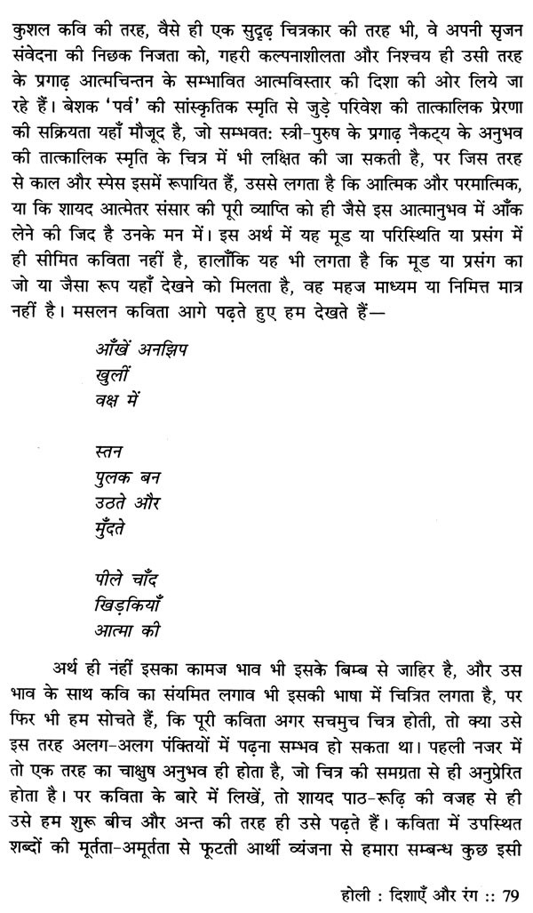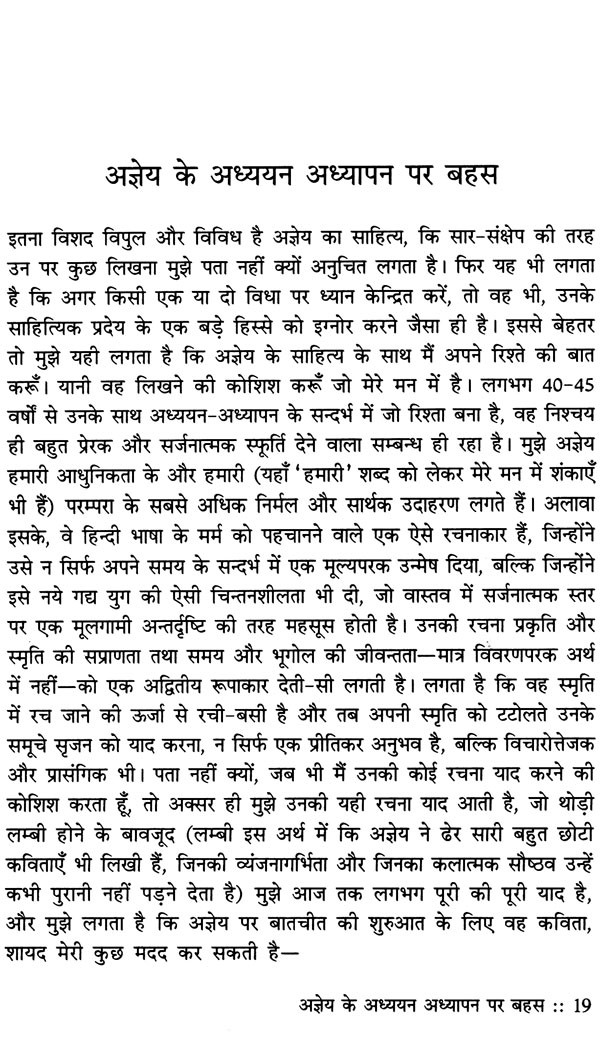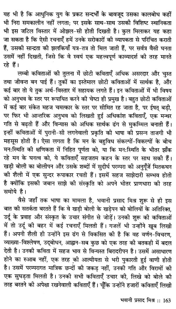 कविता के आस्वाद के अपने अनुभवों को दर्ज करते हुए प्रभात त्रिपाठी ने आलोचना की एक नयी और आत्मीय भाषा विकसित की है। आलोच्य कृति के अन्तरंग के साथ आनुभविक सम्बन्ध रचते हुए उन्होंने कविता के मर्म को लिखने का जो नया मुहावरा खोजा है, उसमें खोजने की विकलता की अनुगूँजें हैं। हम अनुभव करते हैं कि वह कुछ चालू अवधारणाओं और नुस्खों पर टिकी अधिकांश समीक्षा की तुलना में हमारे मन पर गहरा असर डालती है। वास्तव में उनकी समीक्षा कवियों के रचनाशील मन की अनेक परतों को उघारने में तथा रचना की जटिलता को बोधगम्य बनाने में मनोयोग से जुटी सृजनात्मकता का ही एक अन्य रूप है। उसे साम्प्रतिक आलोचना की तरह देखना और पढ़ना शायद नाकाफी है। प्रस्तुत पुस्तक में उन्होंने अज्ञेय, शमशेर, मुक्तिबोध, नेमिचन्द्र जैन और भवानीप्रसाद मिश्र की अनेक कविताओं की व्याख्या करते हुए उनके काव्य संसार की विशेषताओं को दर्ज भर नहीं किया है, बल्कि पूरे काव्यानुराग के साथ उनके अनुभव-संसार से अपने मन को जोड़ने की कोशिश की है। यही नहीं, अज्ञेय और शमशेर की कुछ विशिष्ट रचनाओं की सुविस्तृत व्याख्या करते हुए उन्होंने यह स्पष्ट किया है कि हर महत्त्वपूर्ण कविता अपनी नानार्थता के आलोक के साथ ही पाठक के मर्म तक पहुँचती है। कविता में सक्रिय वैचारकिता की पहचान से दूर न रहते हुए भी उन्होंने यह कोशिश की है कि विचार को काव्य-विन्यास और कविता के शब्दों में ही, कविता के विचार की तरह पढ़ने की एक सार्थक शुरुआत हो। हर कवि की रचना की व्याख्या के दौरान लेखक ने उसके रचनागत वैशिष्ट्य को इस तरह से रेखांकित किया है कि उन्हें महज़ किन्हीं सरलीकृत सामान्यीकरणों के आधार पर न पढ़ा जा सके।