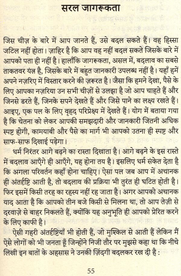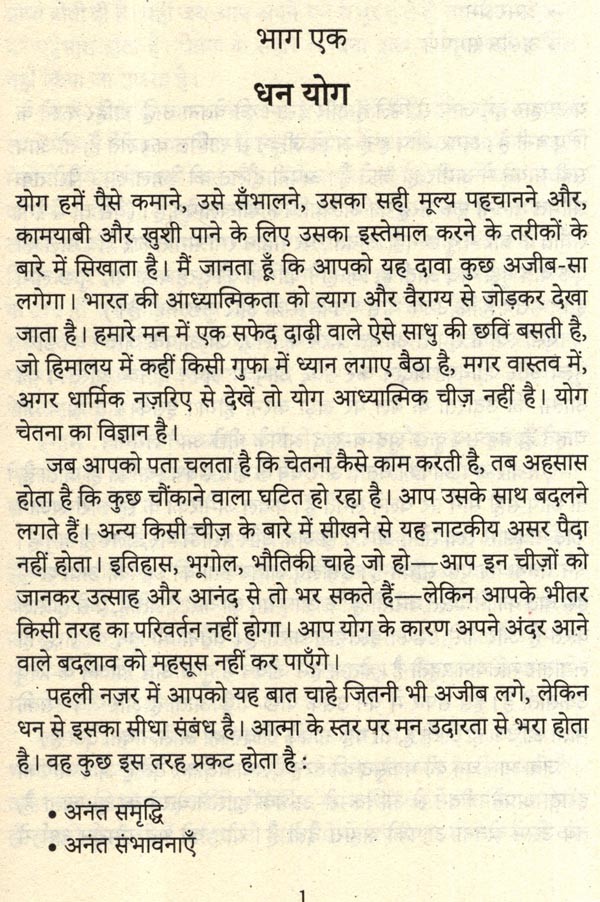 पैसा कमाने के तरीकों पर कई किताबें लिखी जा चुकी हैं, लेकिन मुझे लगता है कि यह किताब अनोखी है, क्योंकि यह समृद्धि के लिए आत्मिक मार्ग खोलती है। मैं चाहता हूँ कि पाठक यह जानें कि समृद्धि, जागरूकता की स्थिति है। चेतना अनंत है, इसलिए उसके उपहार भी अनंत हैं। यह प्राचीन सत्य है, जो भारत में योग प्रणाली के केंद्र में रहा है। योग की कक्षा में बताए जाने वाले अभ्यासों से कहीं ज़्यादा (जो इस किताब का हिस्सा नहीं है), योग के सत्य, जीवन में भौतिक संतुष्टि या धन सहित सभी प्रकार की संतुष्टियों में शामिल हैं। योग एक शानदार शब्द है और इसके अर्थ के पीछे छिपा हुआ नज़रिया इसी से भी अधिक शानदार है। संस्कृत में योग शब्द का अर्थ होता है जुड़ना या जोड़ना। अंग्रेज़ी शब्द योक इसी से लिया गया है, लेकिन जहाँ योक से बैलों पर जुए लगाकर खींची जाने वाली मध्ययुगीन गाड़ी की तस्वीर उभरती है, वहीं योग पूरी तरह से नई वास्तविकता उजागर करता है। इस वास्तविकता में जिन चीज़ों को हम आमतौर पर अलग रखने की सोचते हैं, वे एक साथ होती हैं।