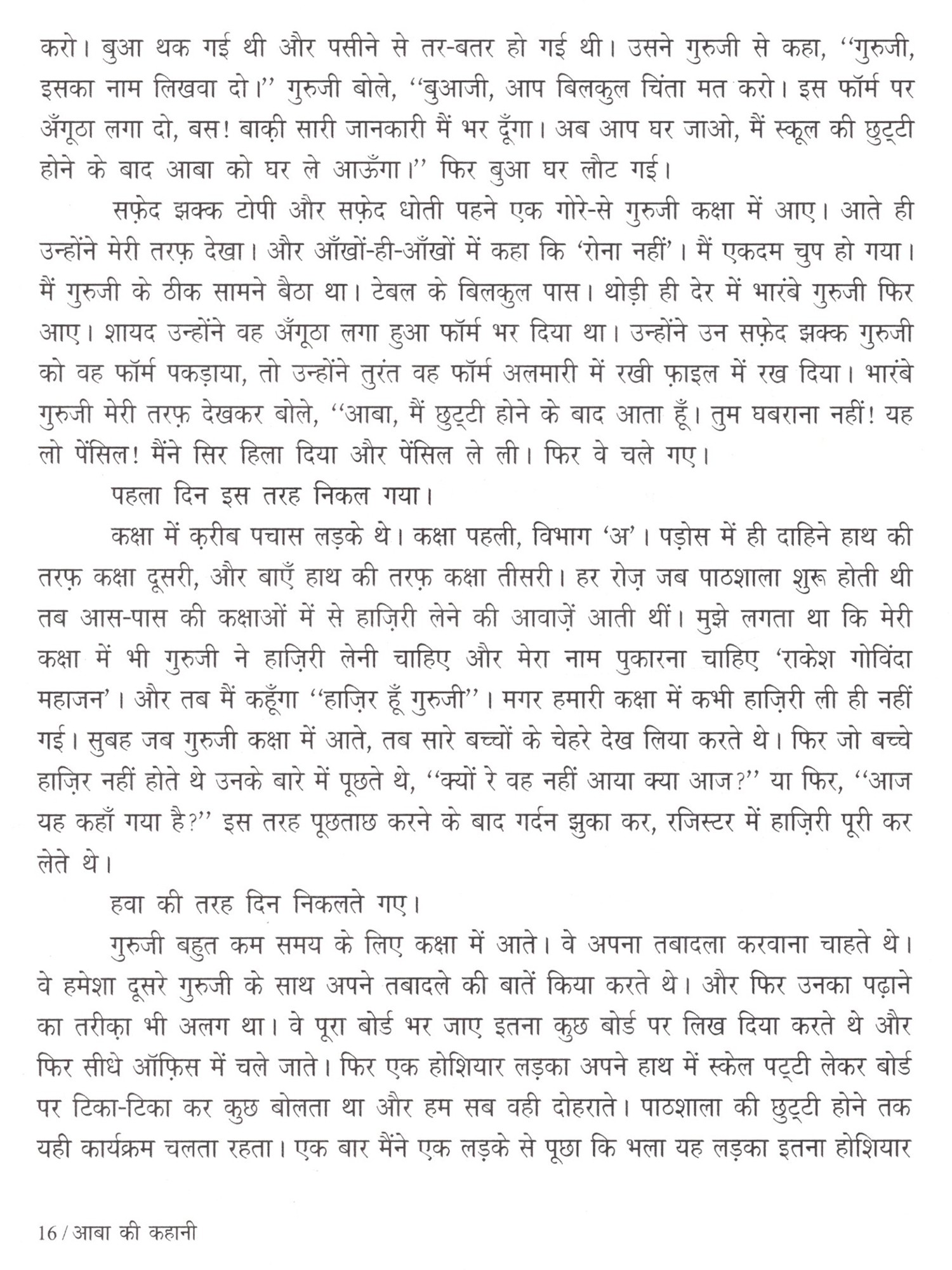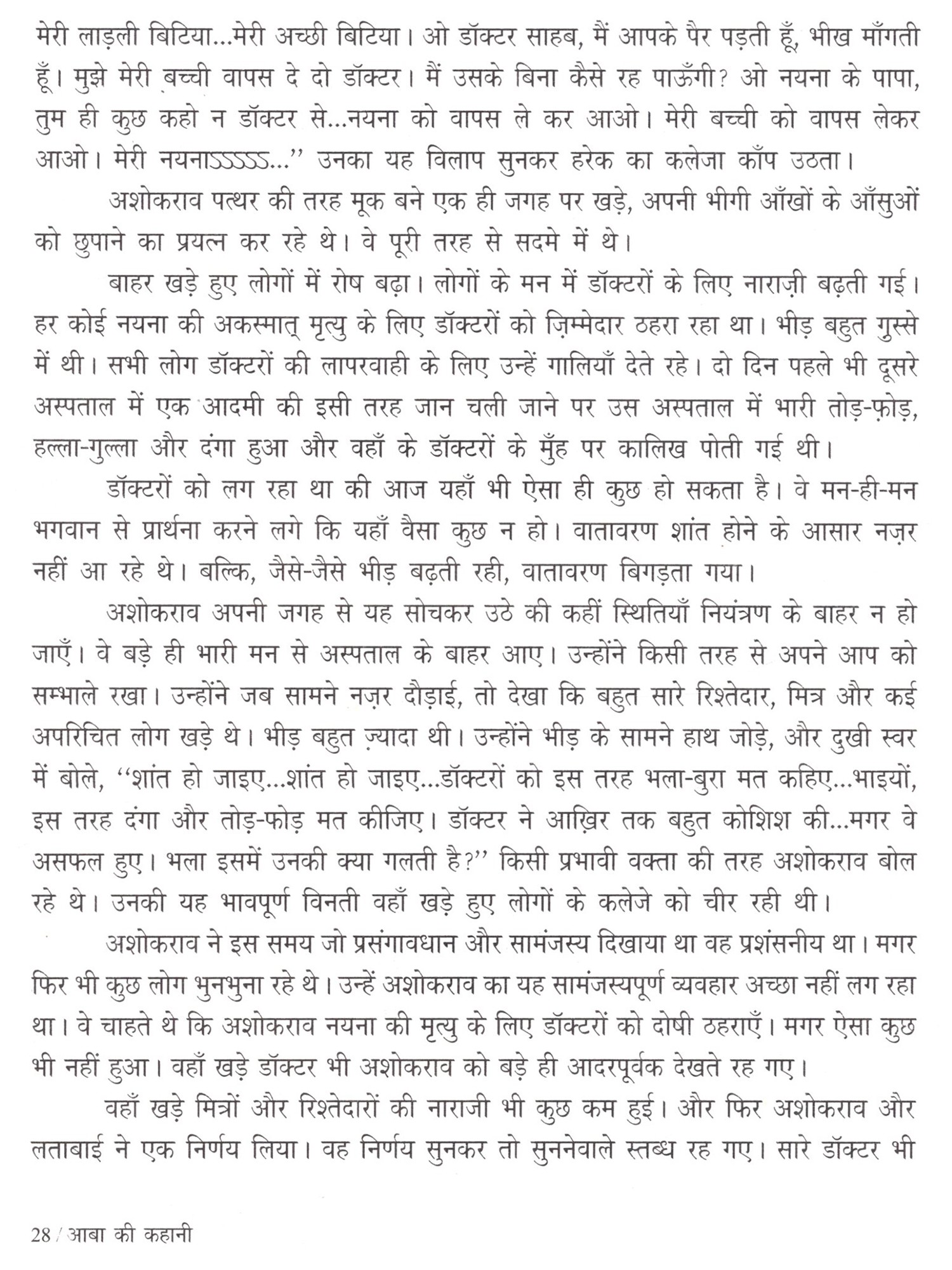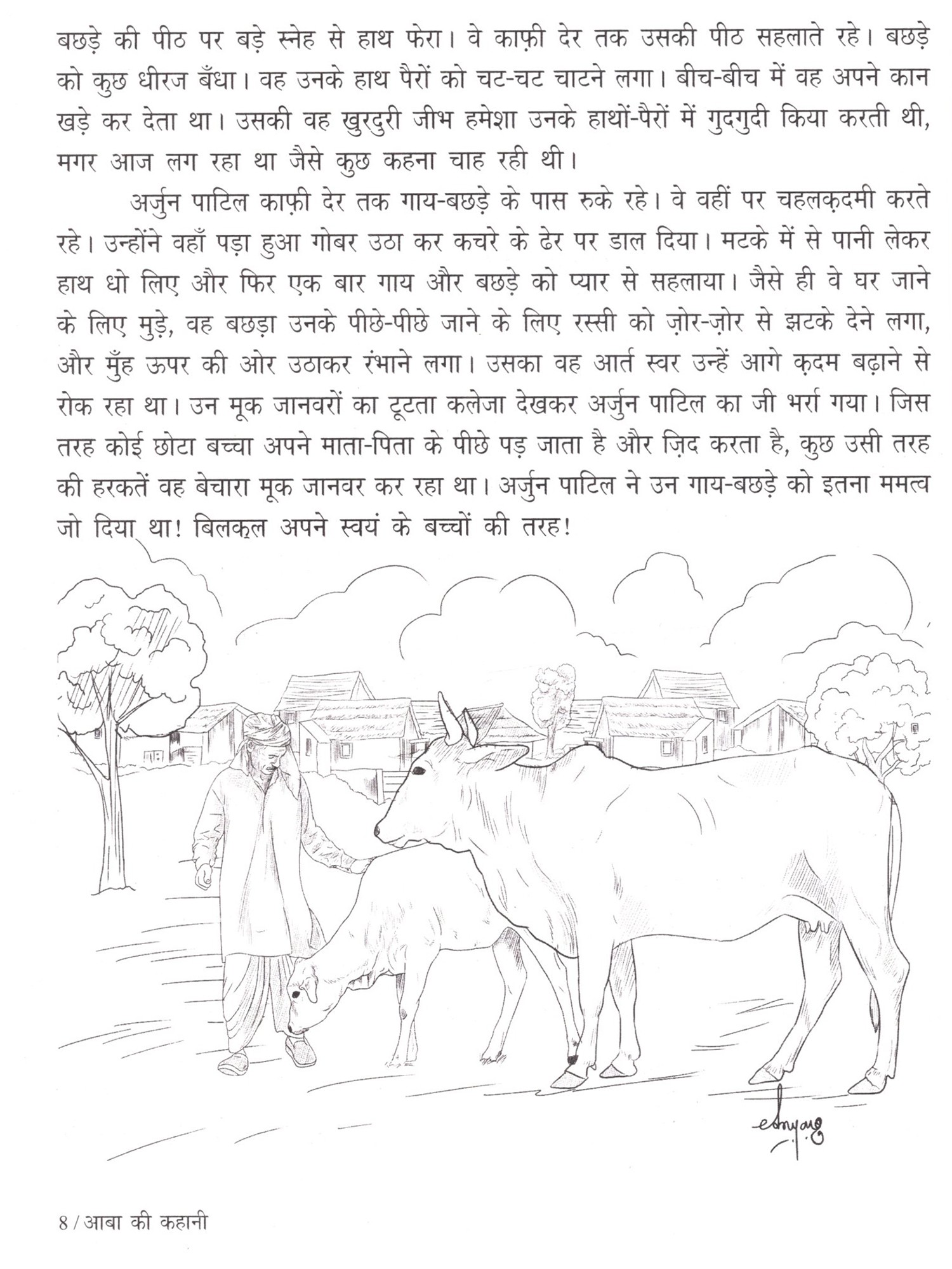 आबा की कहानी मराठी से हिंदी में अनूदित कहानियों का संग्रह है। इस मराठी कहानी-संग्रह को 2020 में साहित्य अकादेमी के बाल साहित्य पुरस्कार से पुरस्कृत किया गया था। इस संग्रह में स्कूल जाने वाले बच्चों तथा उनके माता-पिता की दुनिया को रोचक ढंग से दर्शाया गया है। इसमें ग्रामीण और शहरी दोनों परिवेश है। नैतिक मूल्यों और तर्क शक्ति के विकास के साथ-साथ इन कहानियों में विपरीत परिस्थितियों में रहने वाले ईमानदार और मेहनती बच्चों के संघर्षों को भी चित्रित किया गया है। सुंदर और पठनीय भाषा में लिखी यह कहानियाँ बच्चों और उनके माता-पिता को भी जागरुक और जिम्मेदार नागरिक बनने की प्रेरणा देती हैं।
