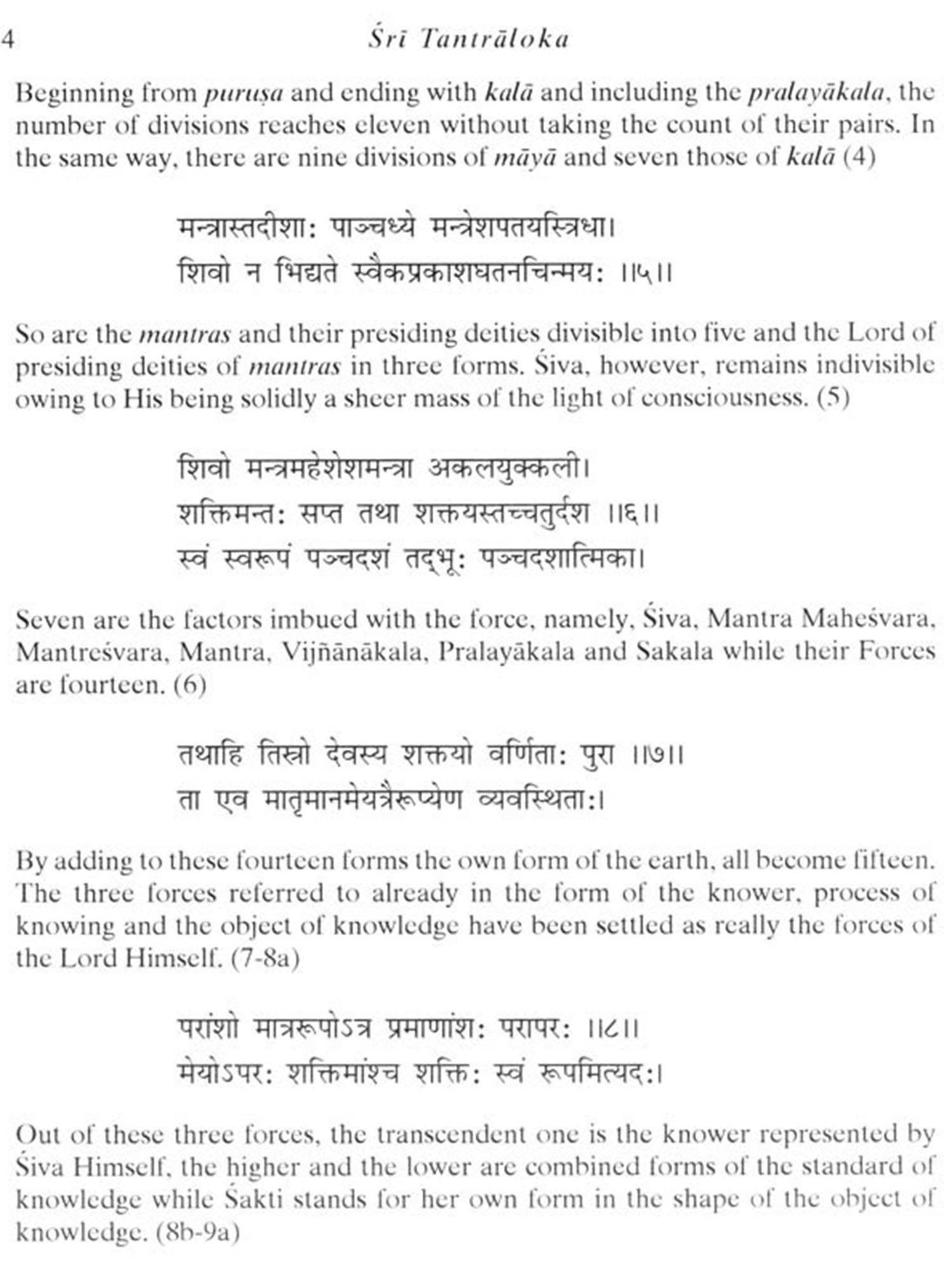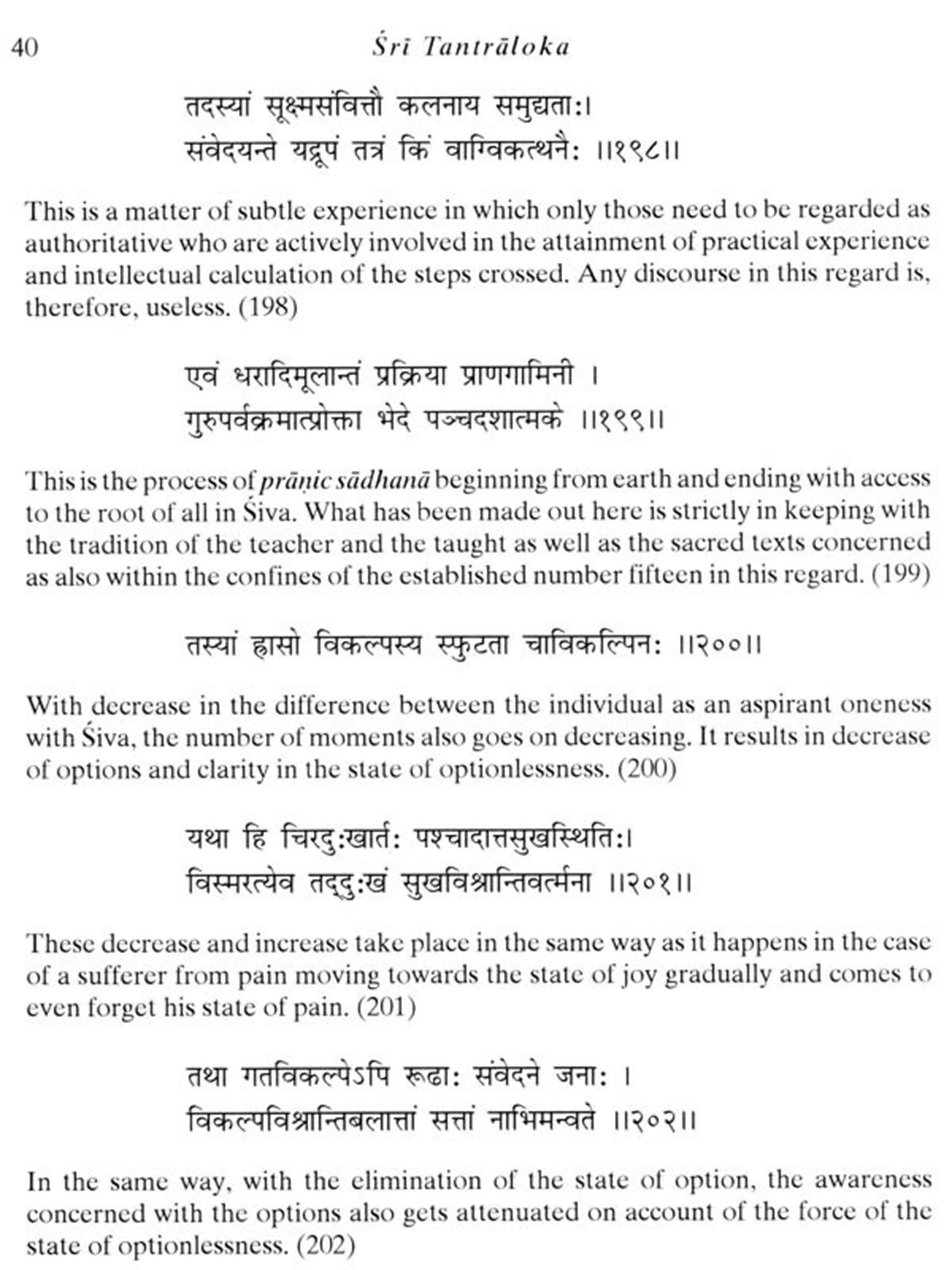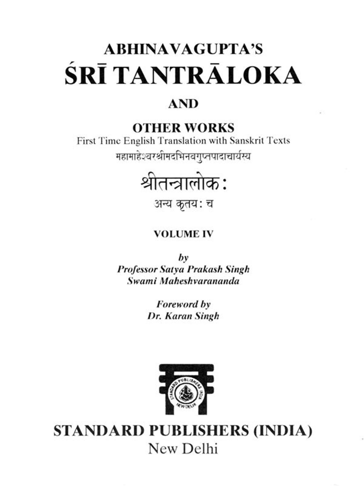 Iwarmlycongratulate Professor Satya Prakash SinghandSwami Maheshvarananda for undertaking the massive task of translating Abhinavagupta's Tantraloka and other minor works into English. Partial translations are available but, to the best of my knowledge, this is the first time that the entire corpus of Tantraloka is being presented in the original Sanskrit and a lucid English translation, I pay my homage to the great Acarya Abhinavagupta. May Param Siva bestow His blessings on us all, and thereby redeem mankind from the strife and violence that is plaguing the world. Aum Namah Sivaya.