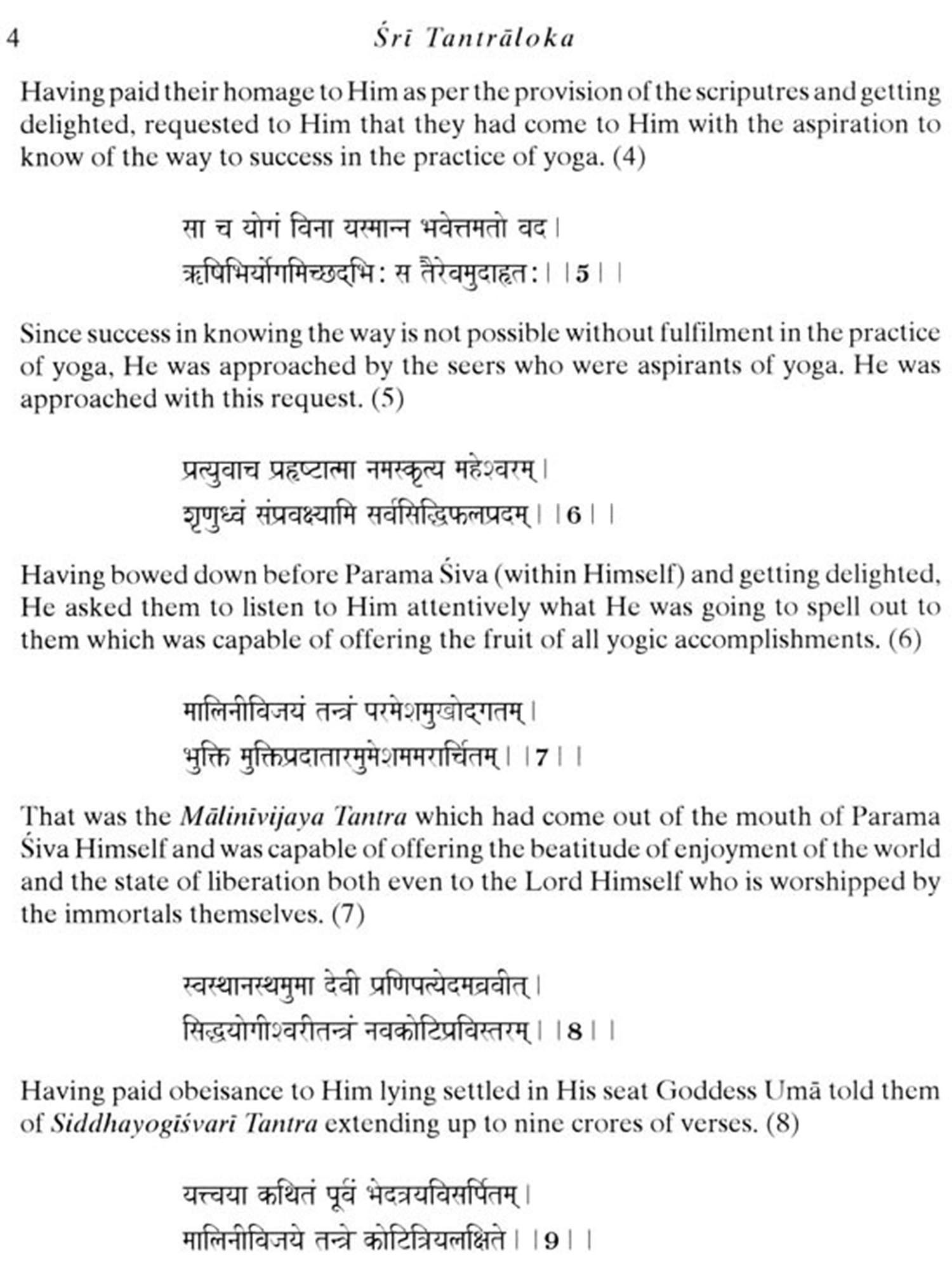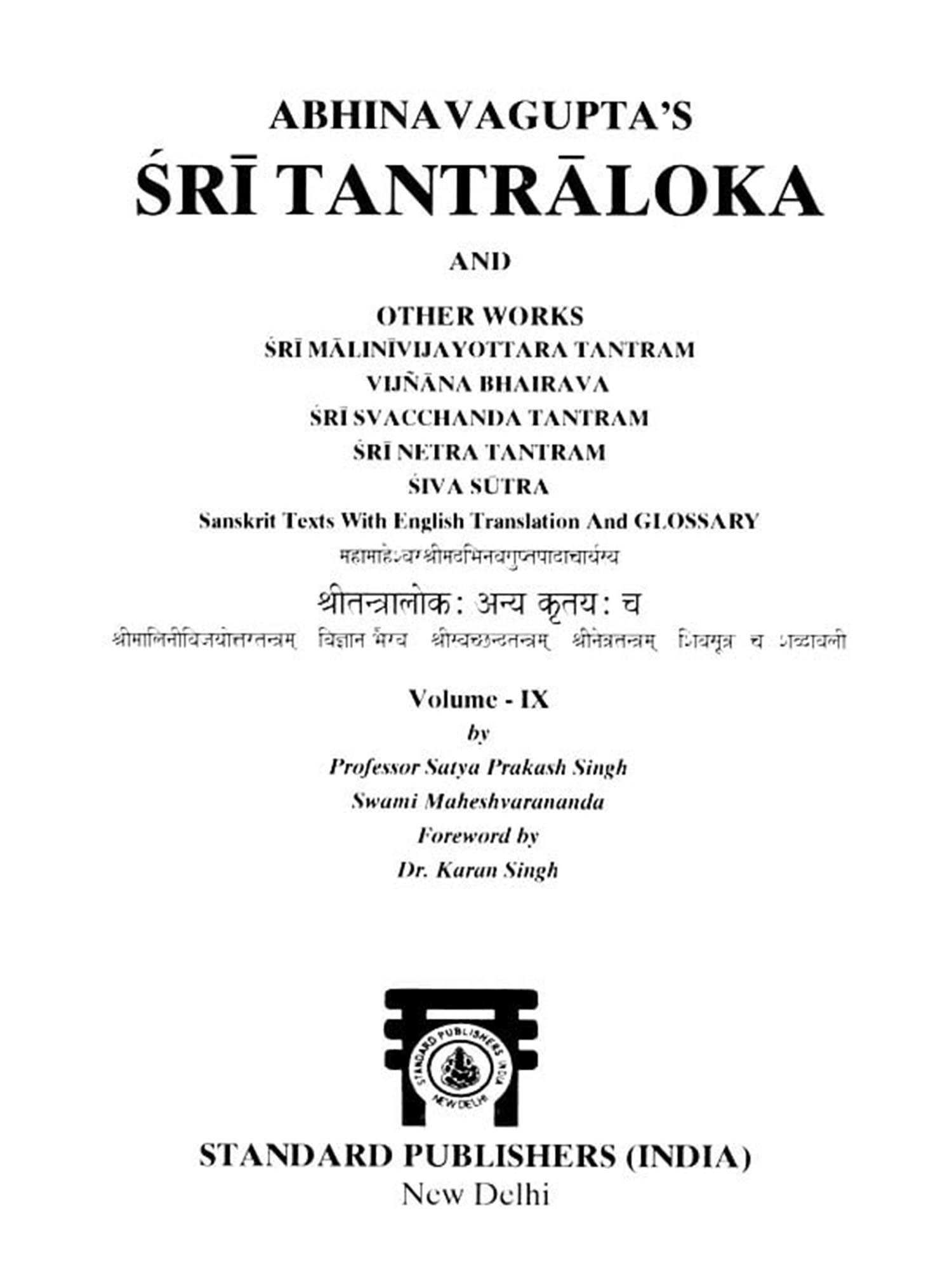 I warmly congratulate Professor Satya Prakash SinghandSwami Maheshvarananda for undertaking the massive task of translating Abhinavagupta's Tantraloka and other minor works into English. Partial translations are available but, to the best of my knowledge, this is the first time that the entire corpus of Tantraloka is being presented in the original Sanskrit and a lucid English translation, I pay my homage to the great Acarya Abhinavagupta. May Param Siva bestow His blessings on us all, and thereby redeem mankind from the strife and violence that is plaguing the world. Aum Namah Sivaya.