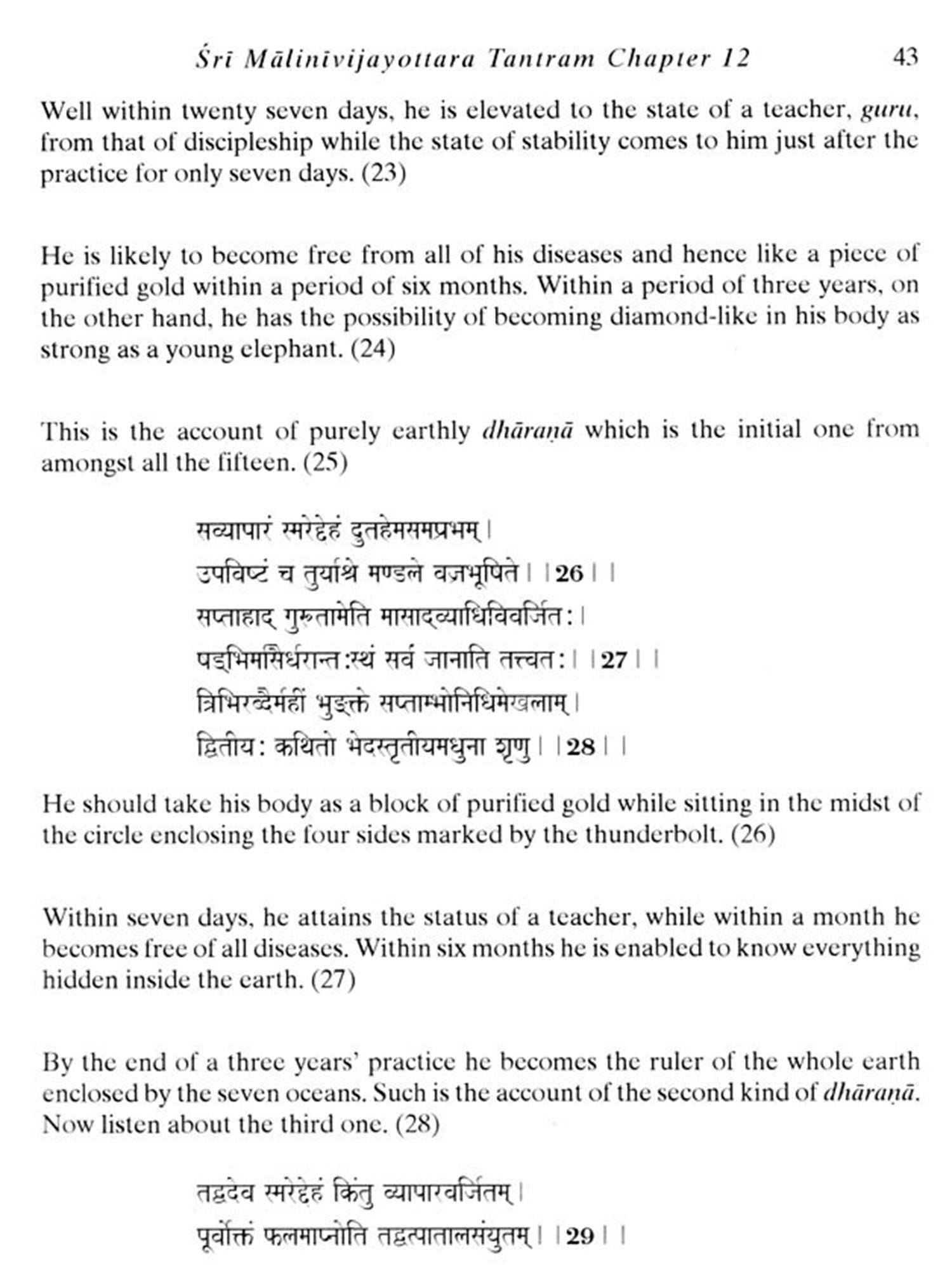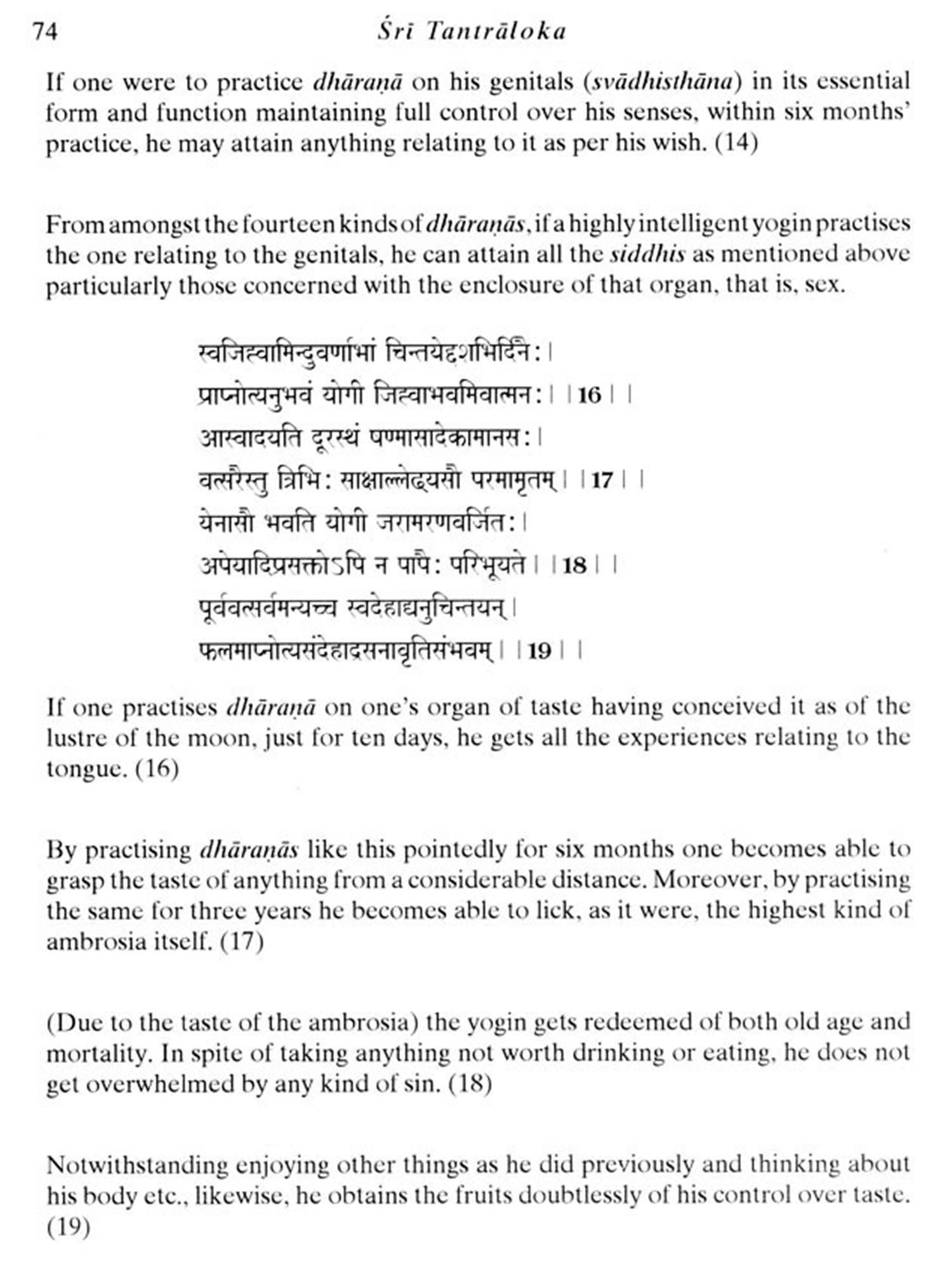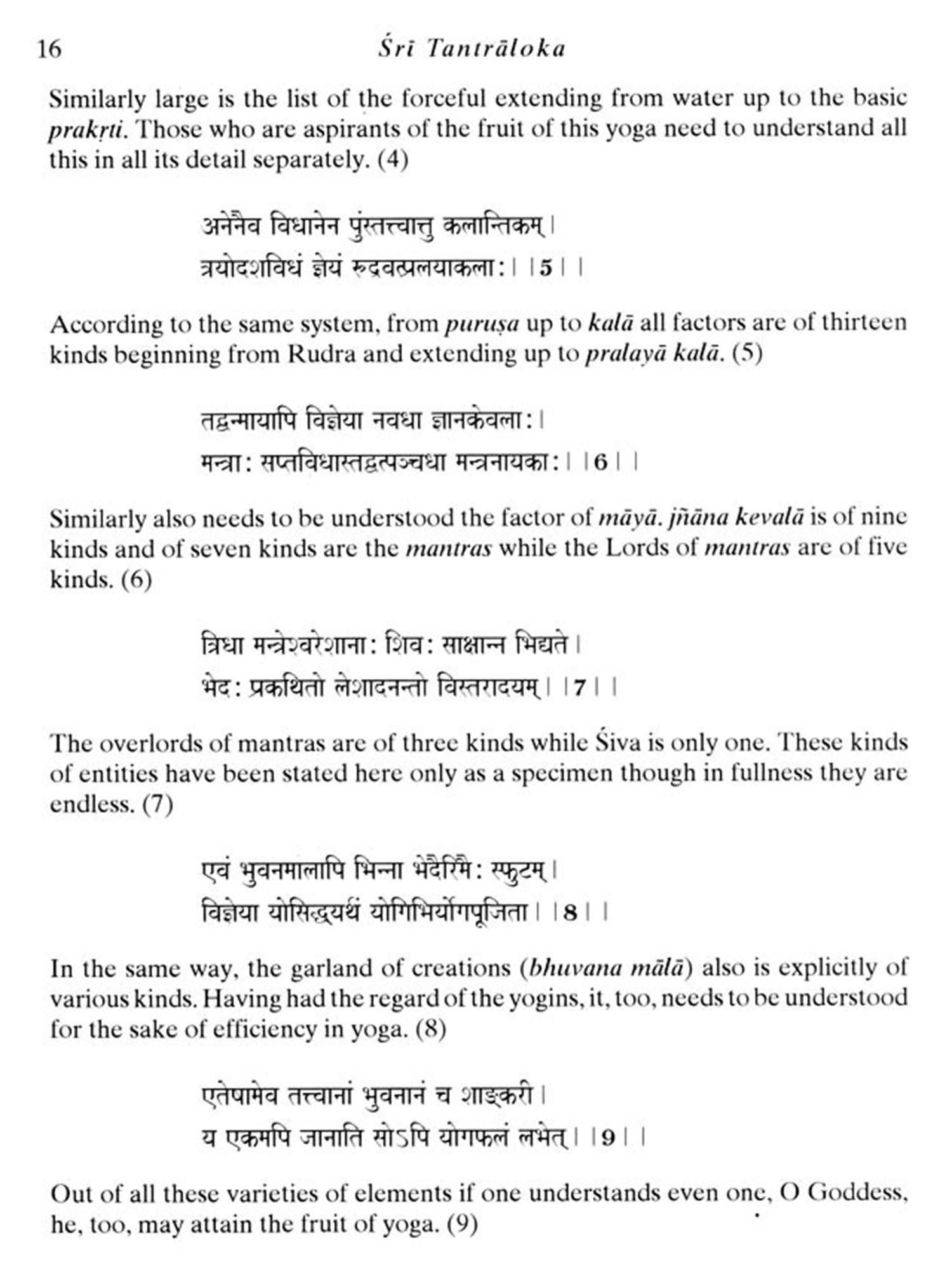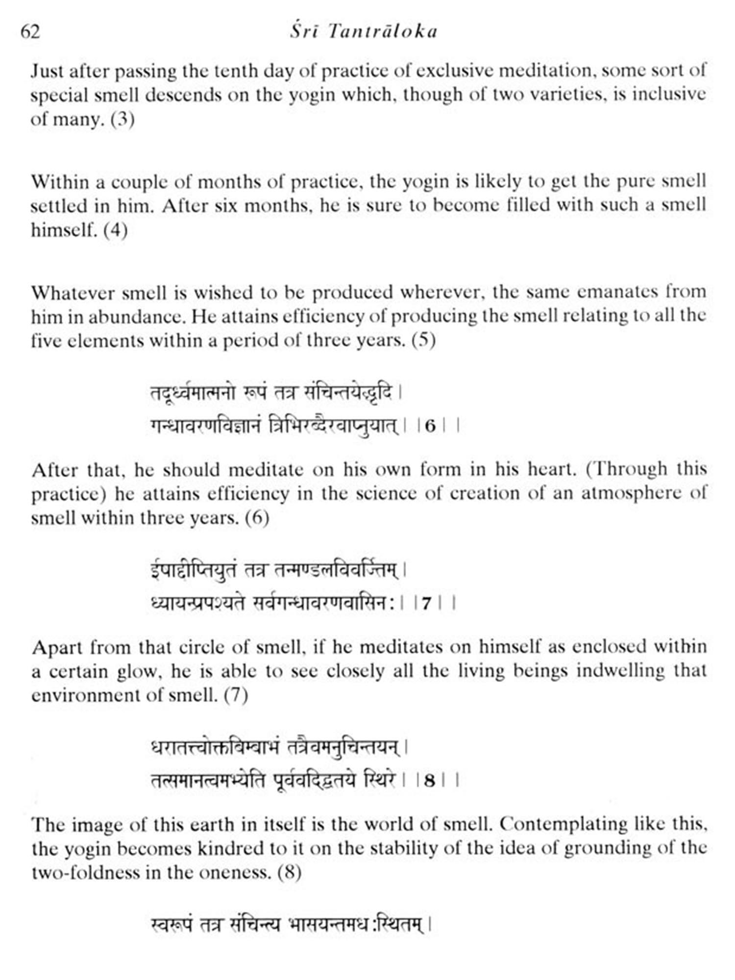 To the best of my knowledge the present is the first complete English translation of this colossal work rendered by the combined efforts of Professor Satya Prakash Singh and Swami Maheshvarananda with their years of practice of yoga and tantra, philosophy Eastern and Western, psychology Freudian and Jungian, Sanskrit and English. This is evident from dozens of their publications and papers ranging over areas like yoga, history and culture on A.N. Whitehead, C.G. Jung. Veda and the history of yoga, linguistics and many more. It was by virtue of deep understanding that an English translation of such a massive work as the Tantraloka could be accomplished lucidly by these scholars after a lapse of almost a millennium from the time of Abhinavagupta himself. But for Tantraloka, the disciplines of Yoga and Tantra would have remained only a dream in its relationship to philosophy and yoga. Tantraloka, indeed, by virtue of its wide and integrative attempt, would have been lost for ever to the modern world getting diminished to the state of a mere cult instead of opening the doors to the mystery of human psychology and physiology.