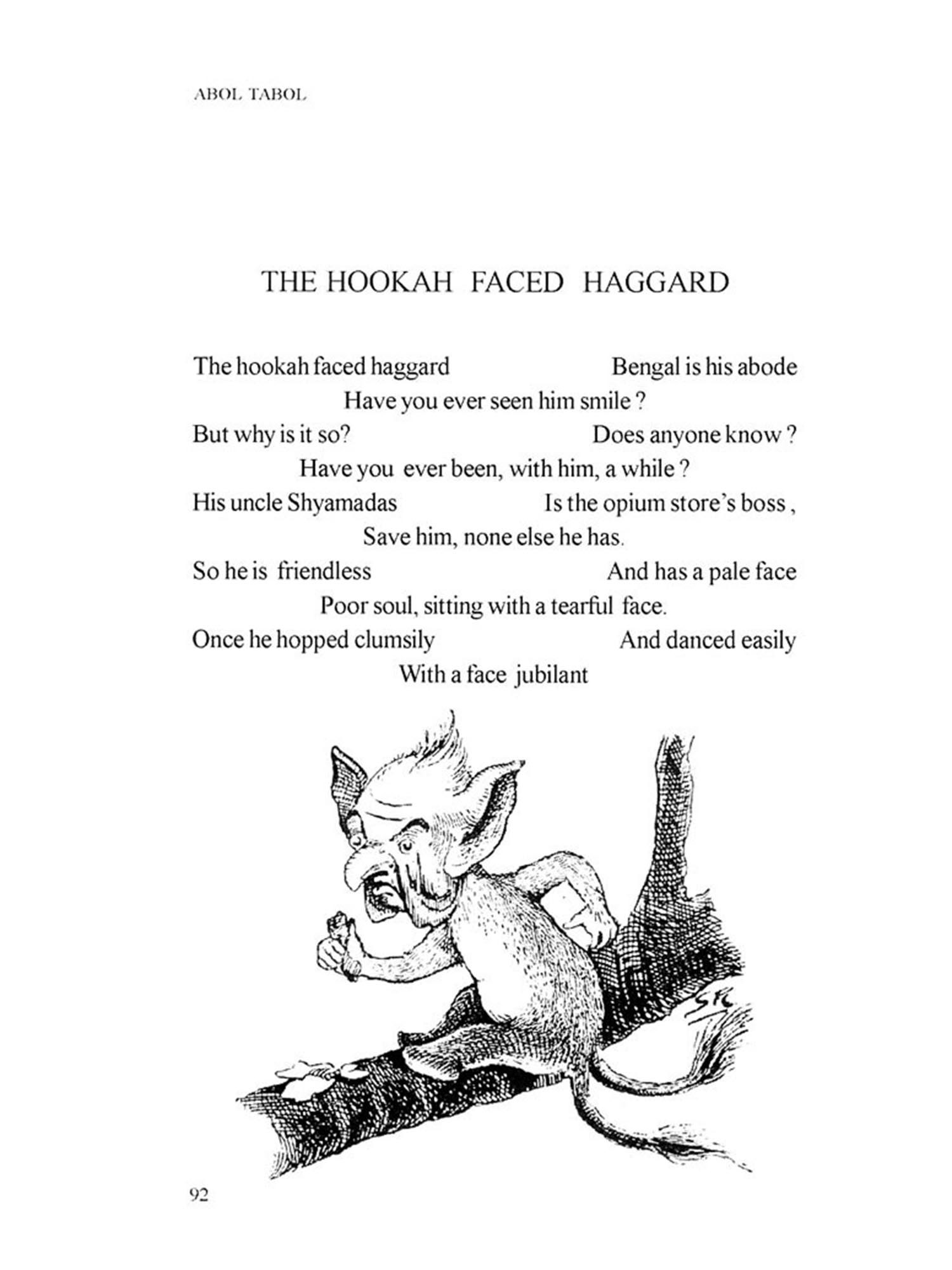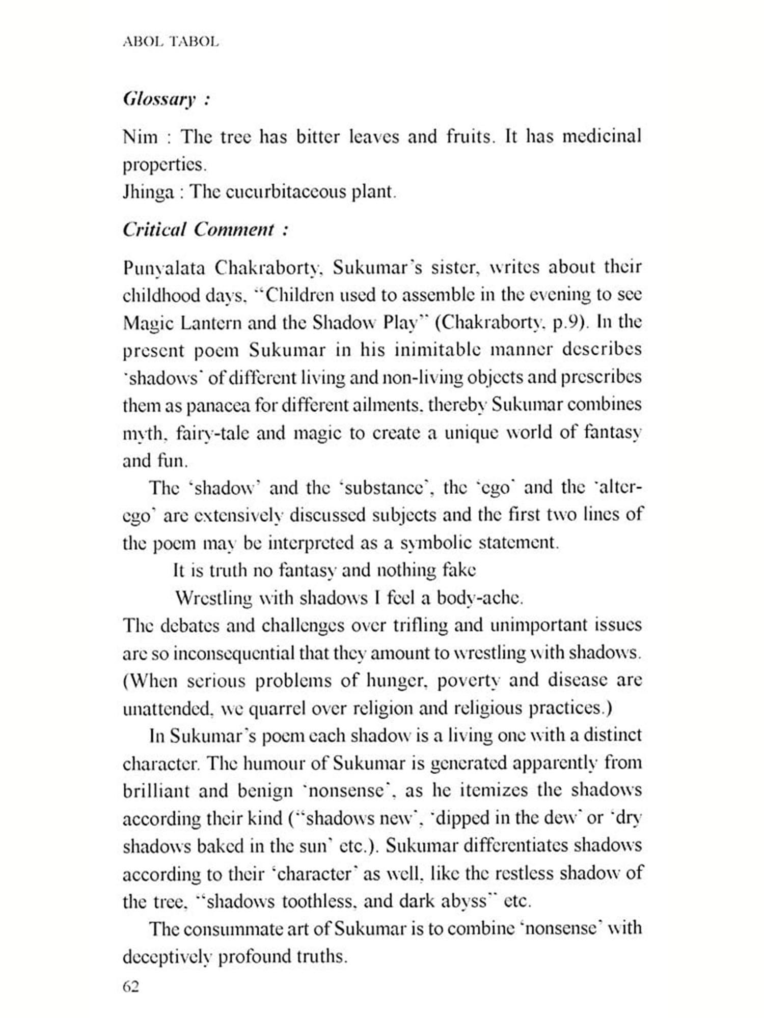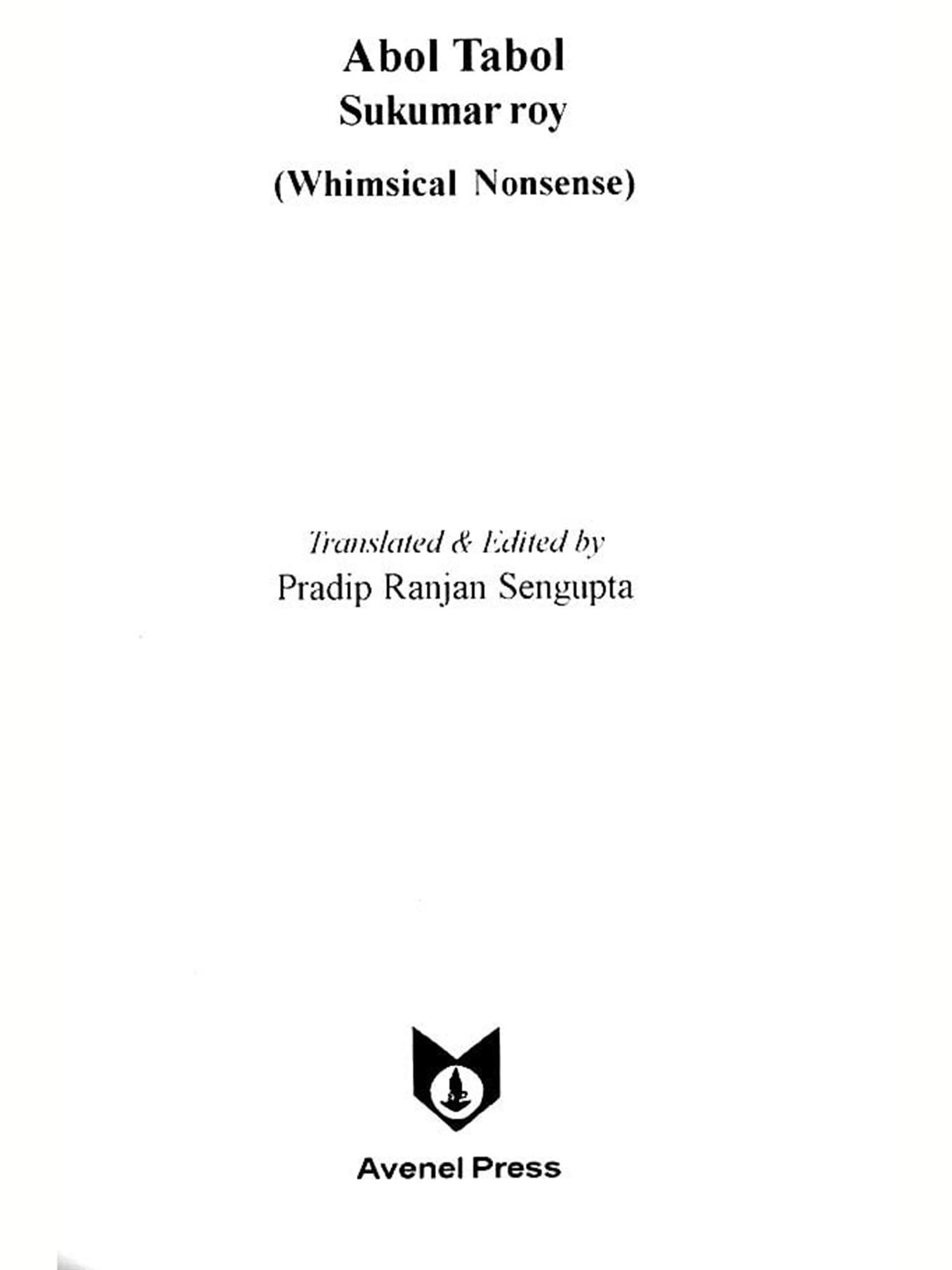 Bengali language which has emerged from its 'mother' Sanskrit is essentially different from English which has its Anglo-Frisian origin. English language, for its rhythm and meter, depends on accent and 'stress', Bangla (Bengali language) has its unique fluidity and flow Is translation an 'art', a 'craft' or is it a 'science? There are a variety of prescribed methods of translation, it may be word for word translation or the translator may take liberty with the source language text and create a 'new text' in the target language. But while translating Abol Tabol I had to keep in mind a few famous 'names' who have already translated Abol Tabol effectively and with competence; I decided to translate Sukumar Roy in my own way, without being overawed by the 'aura' of some of these names, and consciously refraining from any imitation It has been an arduous task for me to try to retain the flavor and cadence of Sukumar's rhythm. My translation I believe, is neither a paraphrase nor a metaphase, nor is it an imitation. Transmitting the authentic *signature of Sukumar in any other language is almost an impossible task for any translator, I can only say with all humility that I have tried my best.
