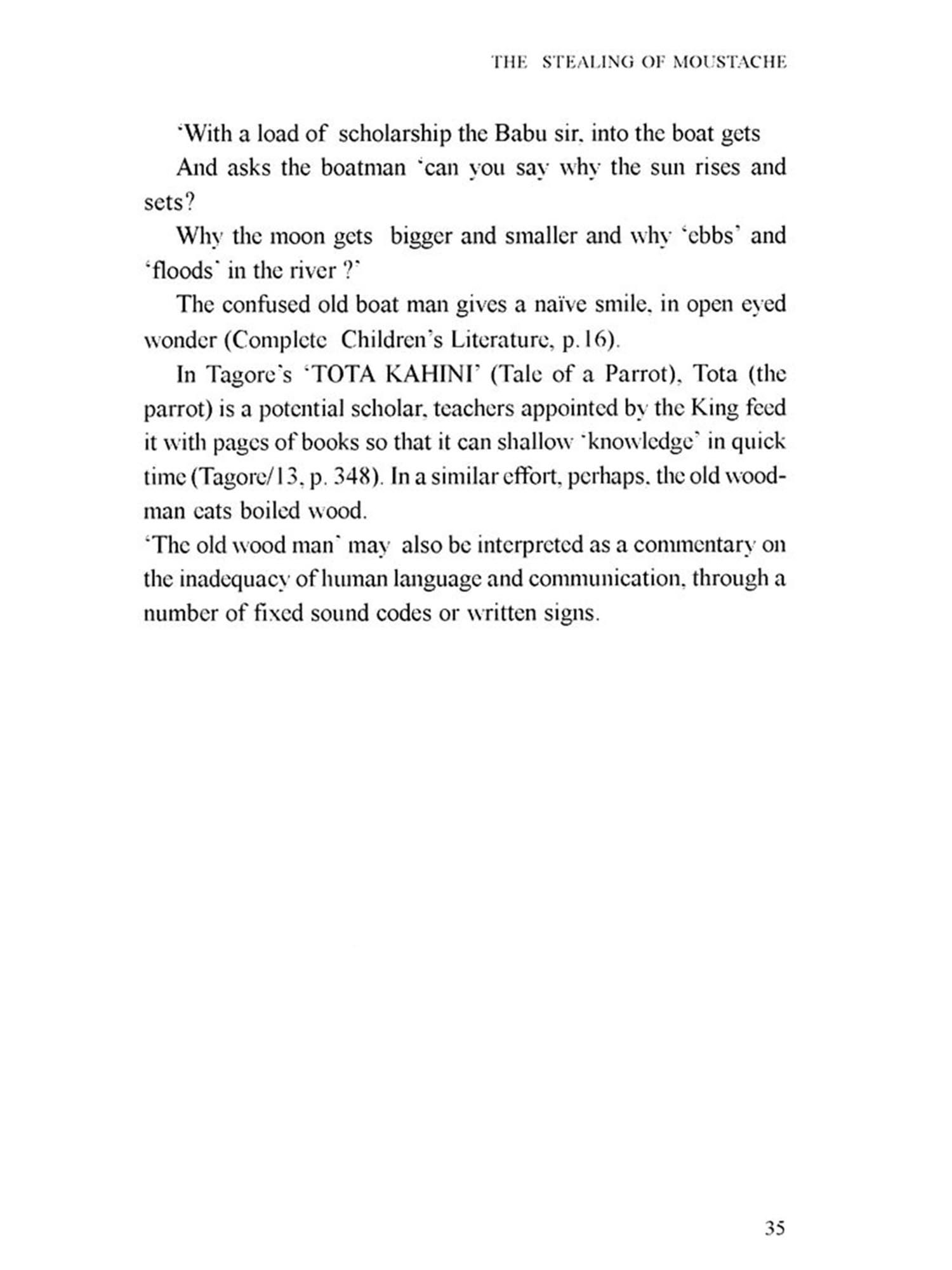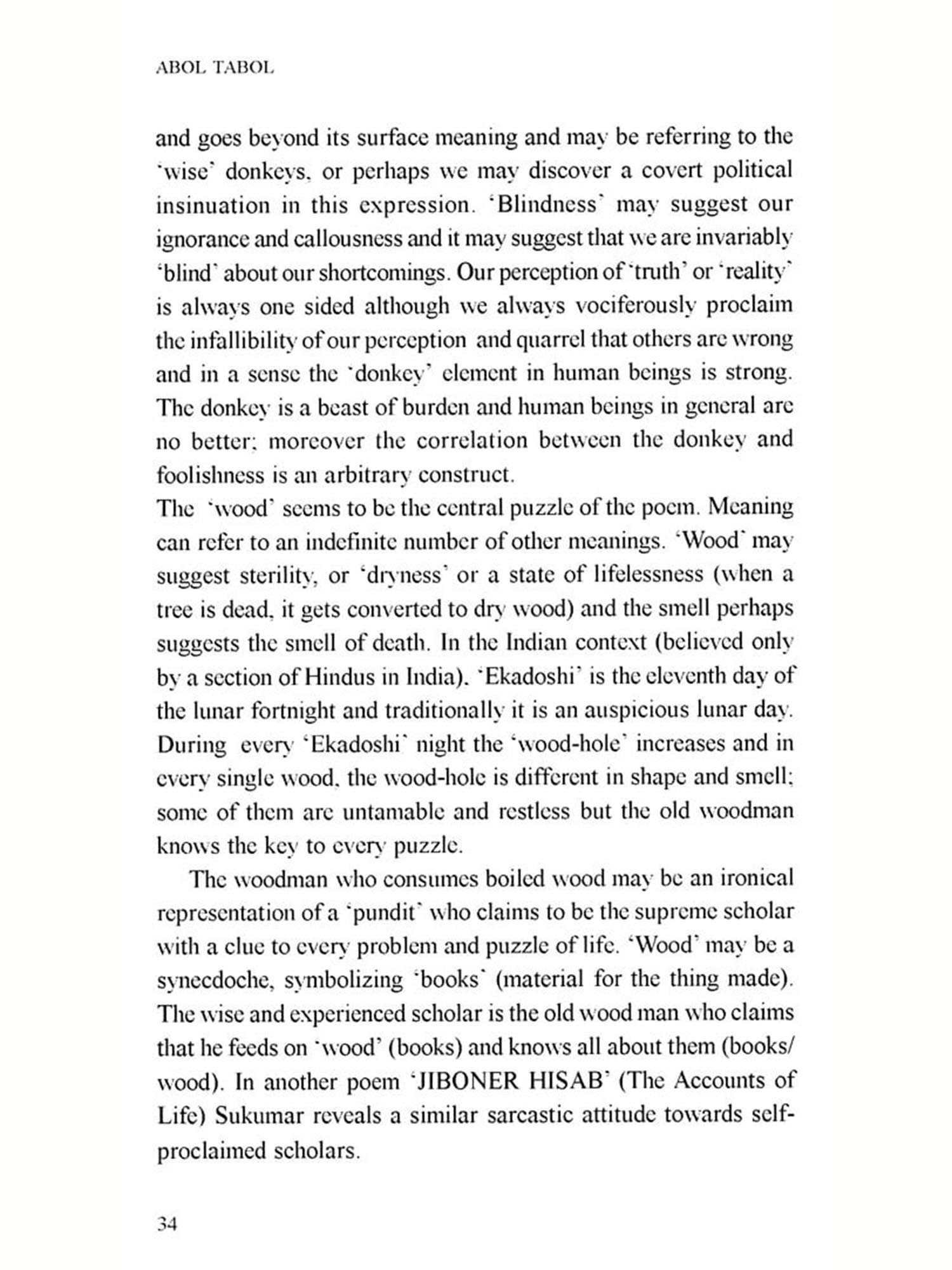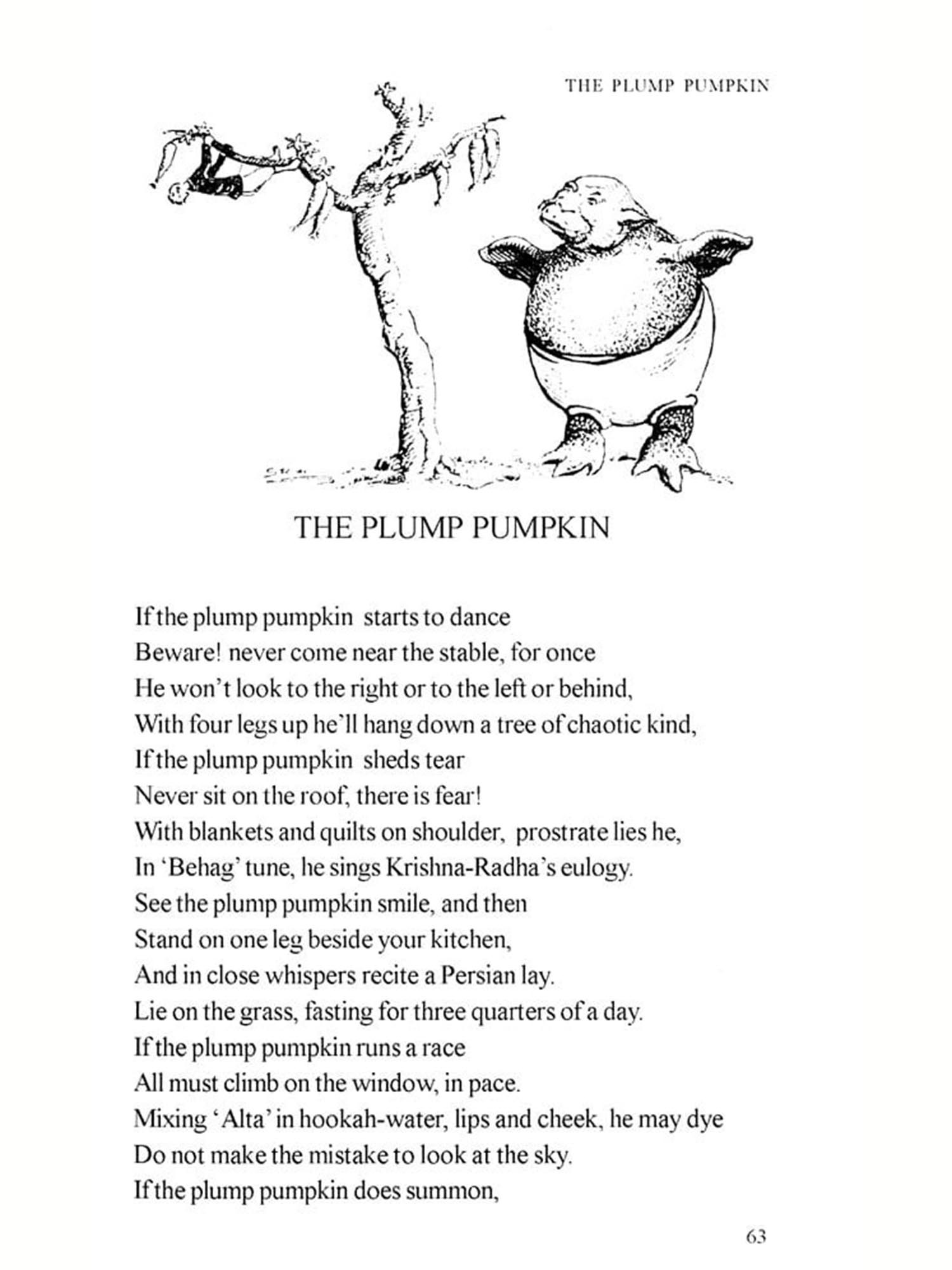 Bengali language which has emerged from its 'mother' Sanskrit is essentially different from English which has its Anglo-Frisian origin. English language, for its rhythm and meter, depends on accent and 'stress', Bangla (Bengali language) has its unique fluidity and flow Is translation an 'art', a 'craft' or is it a 'science? There are a variety of prescribed methods of translation, it may be word for word translation or the translator may take liberty with the source language text and create a 'new text' in the target language. But while translating Abol Tabol I had to keep in mind a few famous 'names' who have already translated Abol Tabol effectively and with competence; I decided to translate Sukumar Roy in my own way, without being overawed by the 'aura' of some of these names, and consciously refraining from any imitation It has been an arduous task for me to try to retain the flavor and cadence of Sukumar's rhythm. My translation I believe, is neither a paraphrase nor a metaphase, nor is it an imitation. Transmitting the authentic *signature of Sukumar in any other language is almost an impossible task for any translator, I can only say with all humility that I have tried my best.