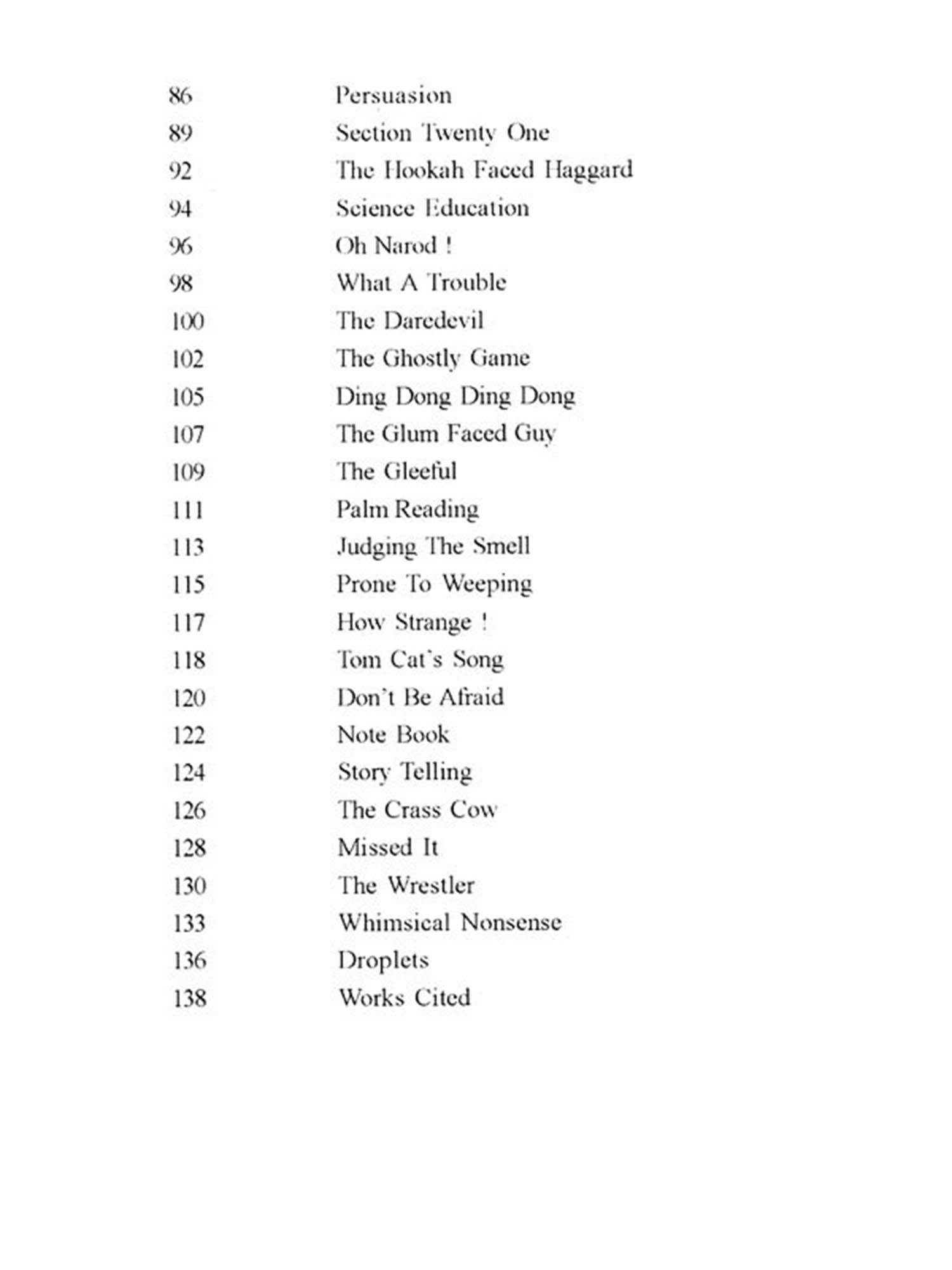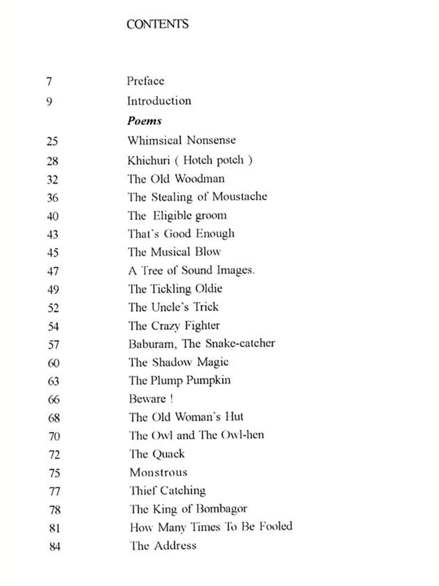 The book contains translation of forty six longer poems and four short poems or 'Droplets' from Sukumar Roy's Abol Tabol. The book provides a critical review and a 'glossary' for each poem. The 'Introduction' provides detailed discussions on various aspects of Sukumar's life and creative genius including brief comparative studies of Sukumar and Iswar Gupta and Sukumar and Tagore; and the 'preface' touches upon the problems of translating Sukumar.