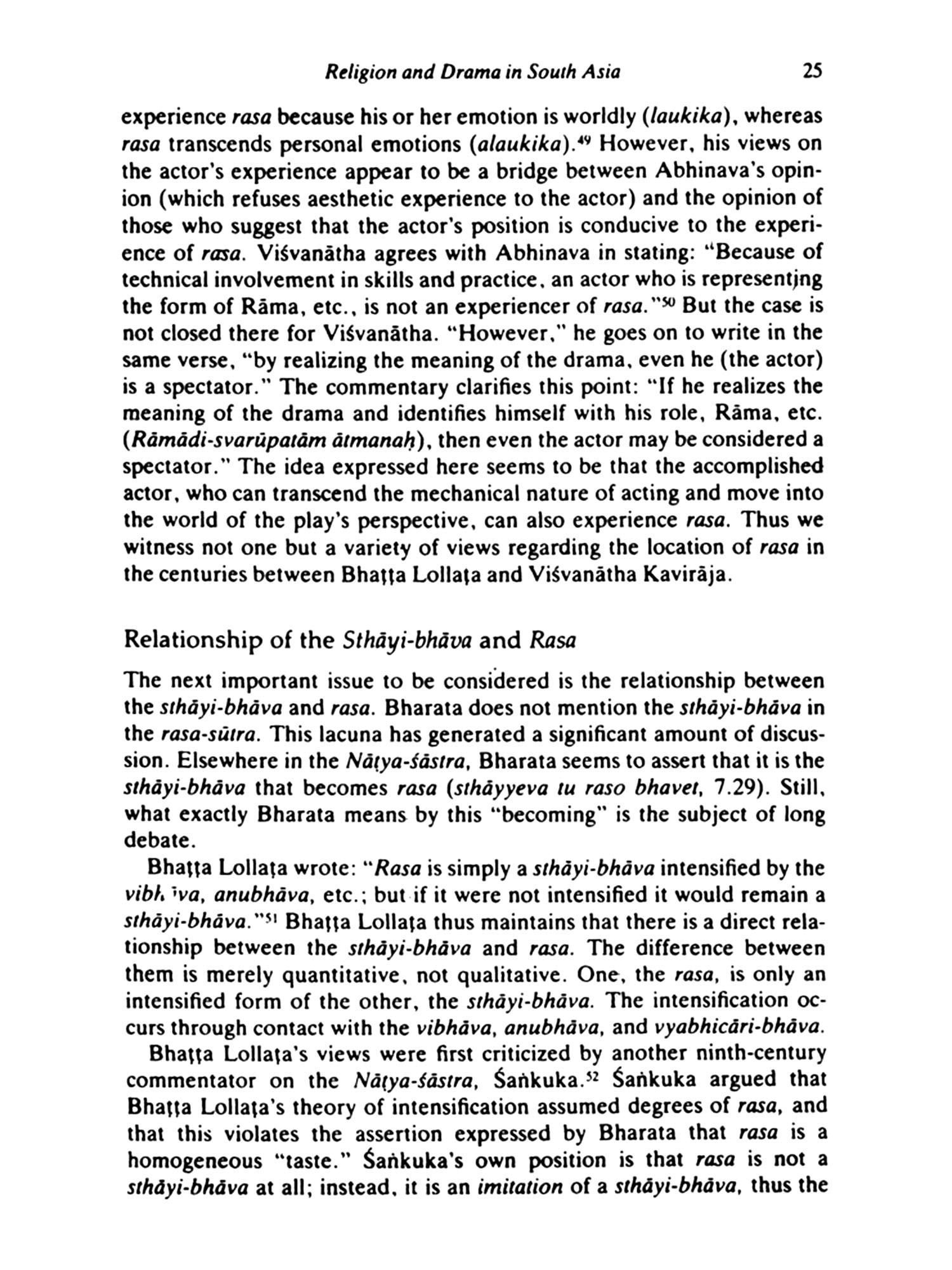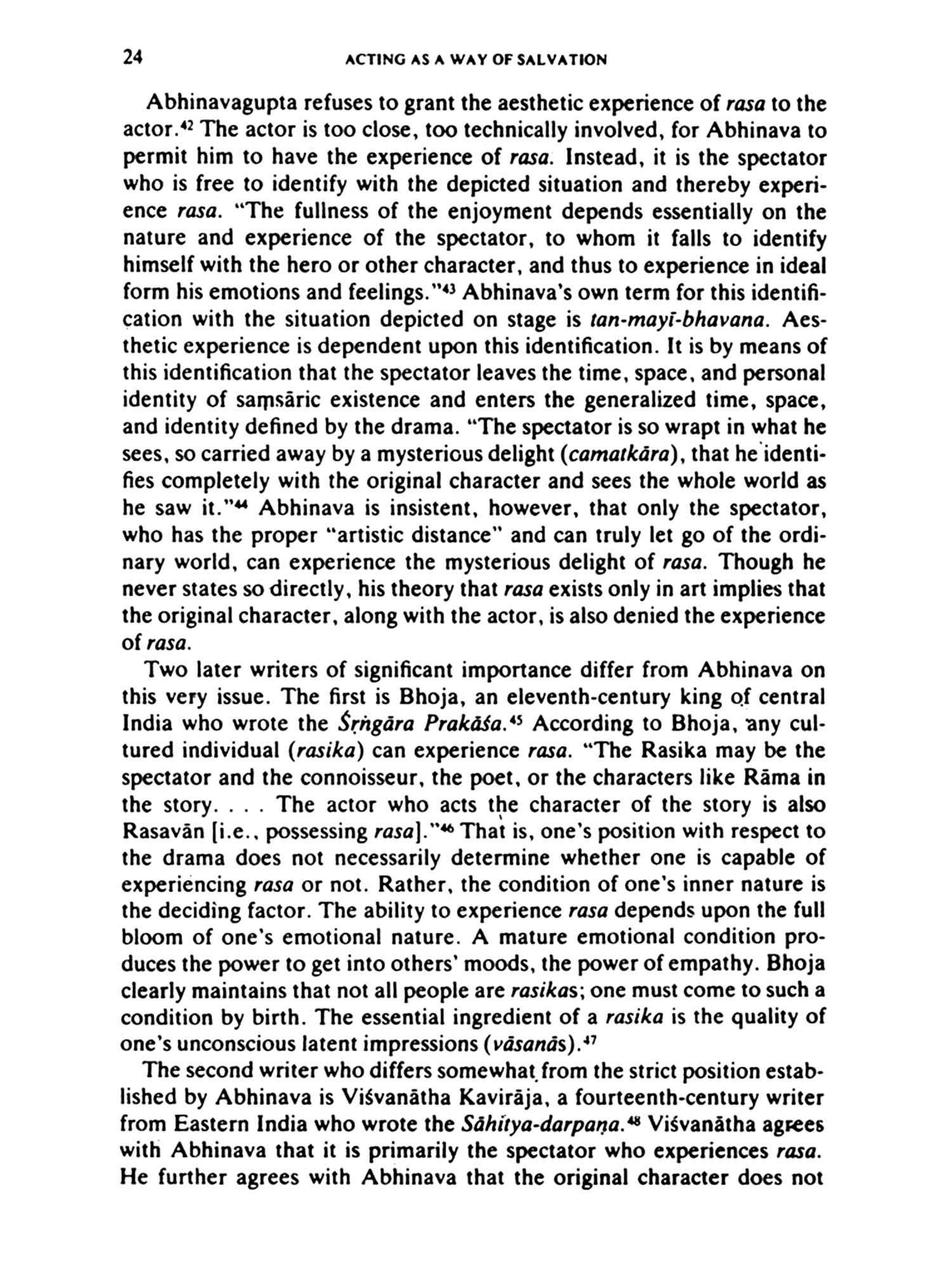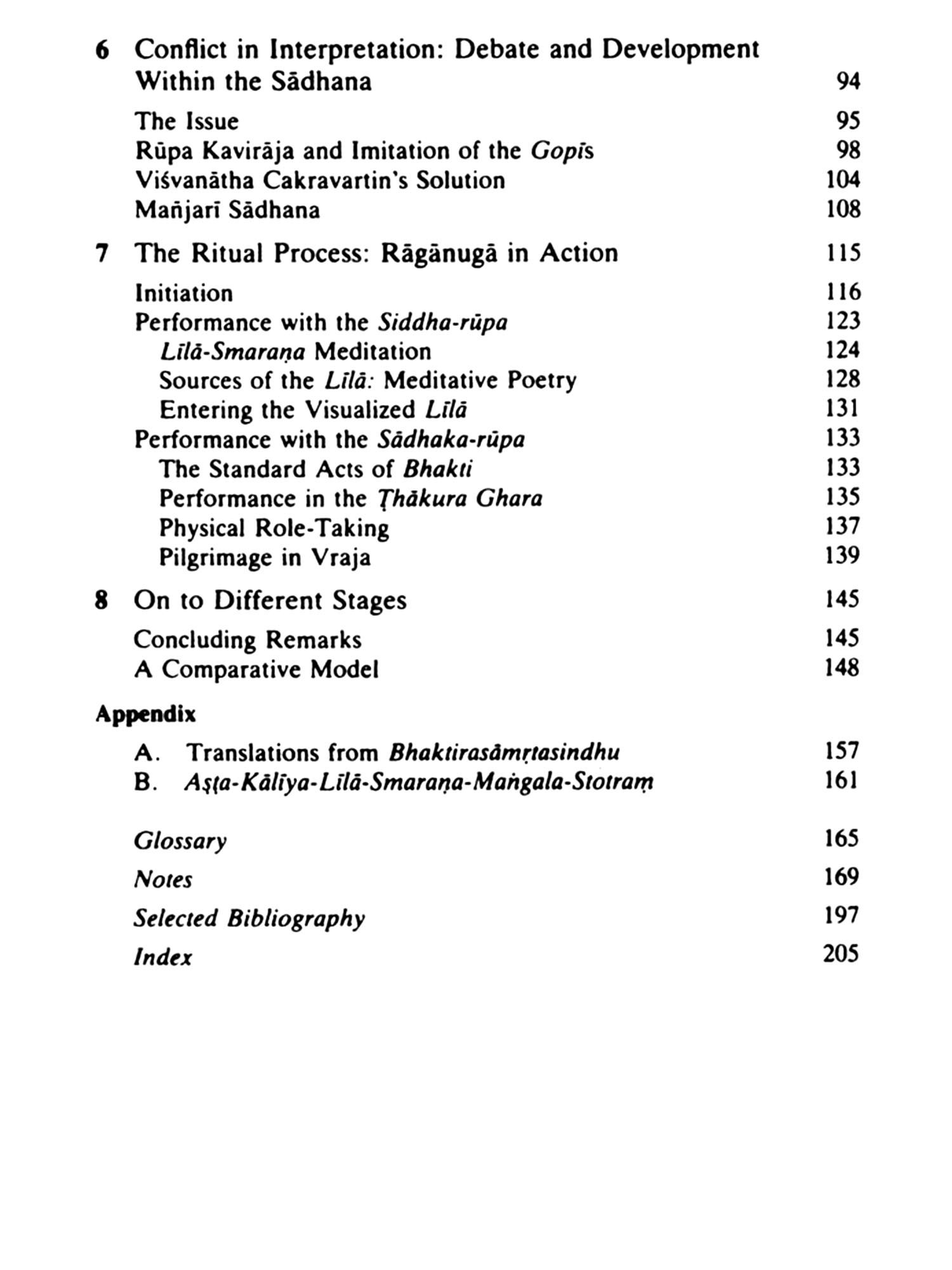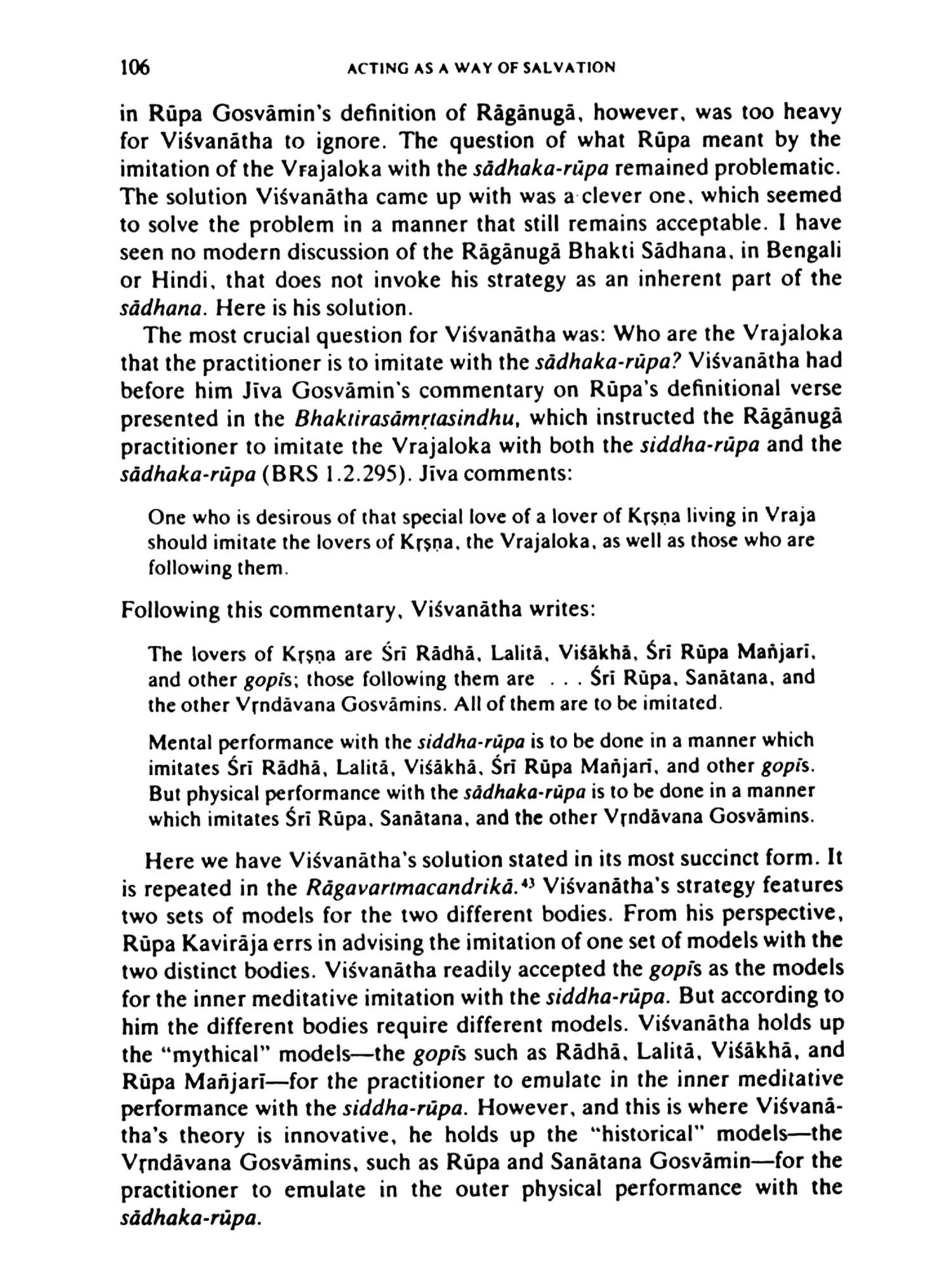 The concept and the process, and therefore the book, are both specific and not specific to India. There are of course many religions in which ecstatic experience is valued and is the ideal, many in which a model, or a paradigm of the process, is presented for emulation. But there are few, if any, that are so elaborate, so detailed, and so entwined with esthetic understanding that are based on the idea that there is a realm of the spirit which God shares with man. The imitation of Christ is not an unfamiliar theme in Christianity but, in itself, I don't think it aims one toward identity. The systems may be similar, in that in Christianity one does indeed participate in the Body of Christ through an institution, the Church, but Christ is unique in being God as well as man. His deeds. because of his divine nature, are by definition perfect. One can imitate them, for they were after all performed by a man, but through imitation one does not become Christ. The Vaisnava both becomes and does not become Krsna, for the stage on which the drama is being acted and the dramatis personnae are extensions of him.
