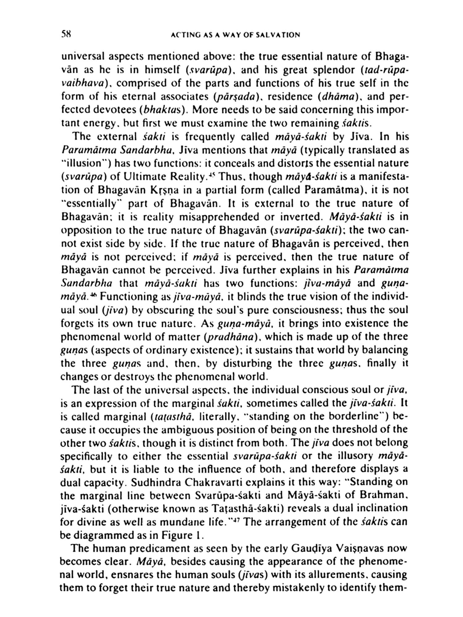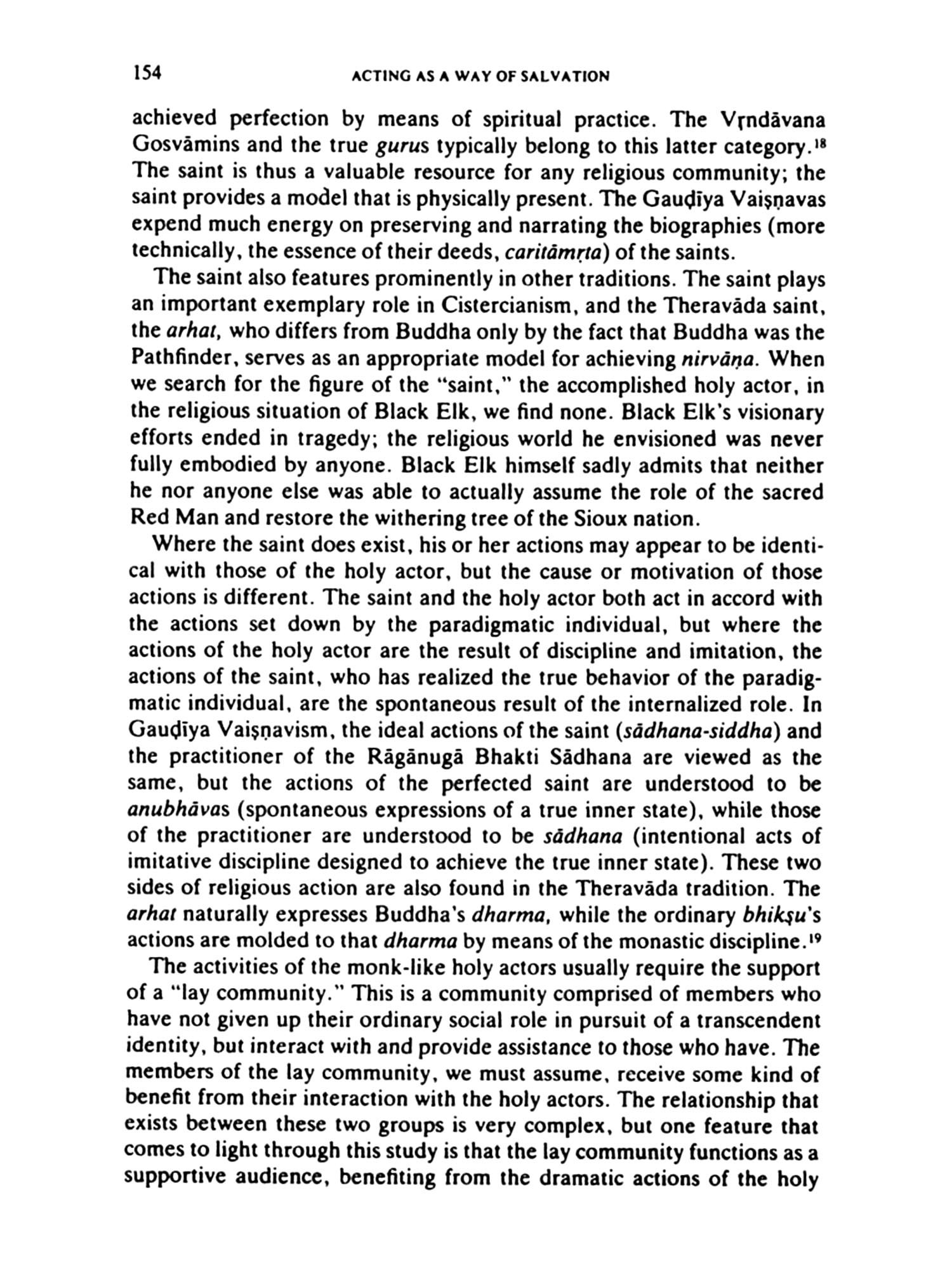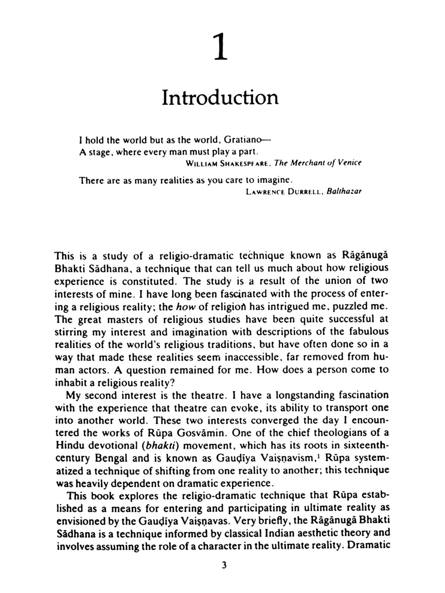 It is a mark of the creativity of the Vaisnavas of Bengal (or the Gaudīya Vaişnavas, as David Haberman chooses to call them here) that such an interesting question can form the cornerstone of a religious and philosophical system, for definitions of the self, or selves, and the roles each of these play are critical to Vaisnava considerations. The script for the roles is Reality, and the playwright divine. In the Vaisnava system, the Stanislavski method is intensified to the nth degree: the part for which one trains is, ultimately, one's true self, and the transformation, when it comes about, lasts for longer than the play runs. It is complete, and final, and forever.