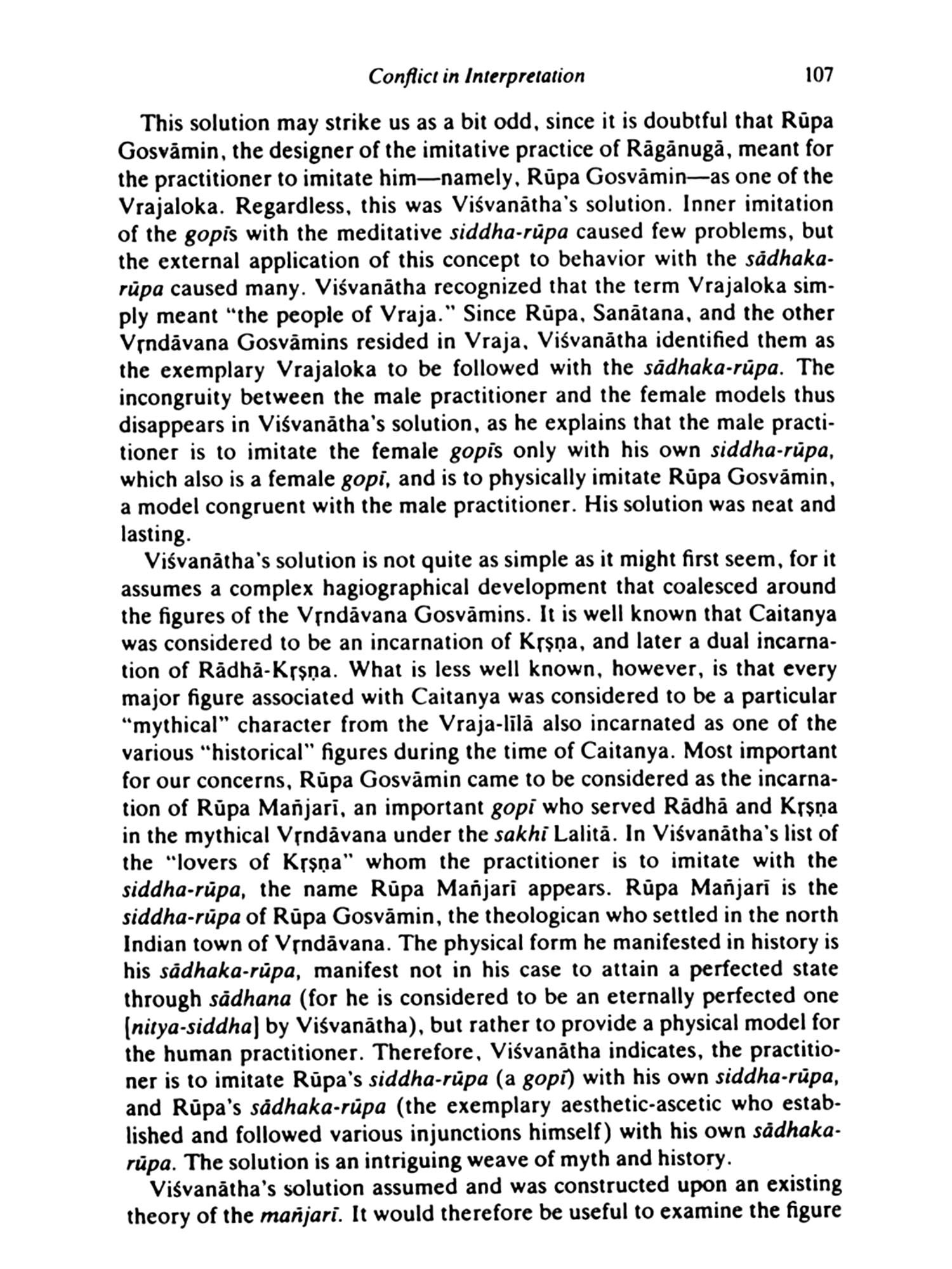 Nor are there auditions for the parts. Everyone has a roje, and it is self-selected. The play was written long ago, before time began. It is the play of Krsna, made known on earth through the text called the Bhagavata Purana, and it is infinite. There are roles for all who choose to be devoted, who are willing to train themselves until they understand that they are, in fact, in the world of the Real, the friends or parents or servants or-most significantly-the lovers, of God. Because the drama is divine, the stage is eternity, the time frame is no longer act and scene. The real world and the Real world are revealed to be the same.