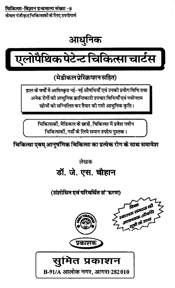 राष्ट्रभाषा के माध्यम से पठन-पाठन के मार्ग में सबसे बड़ी बाधा उपयुक्त पुस्तकों के अभाव की है, विशेषकर चिकित्सा विज्ञान से सम्बन्धित विषर्या पर हिन्दी में सरल एवं सुबोध भाषा में लिखी या अनुदित पुस्तकों का बड़ा अभाव है। फलस्वरूप हिन्दी माध्यम के छात्र-छात्रायें अंग्रेजी माध्यम से अध्ययन करने को विवश होते है। तकनीकी शब्दों का हिन्दी में ज्ञान न होने एवं अंग्रेजी न जानने के कारण चिकित्सा, नर्सिंग एवं अन्य सह-चिकित्सा (पैरा-मैडीकल) विज्ञान के छात्र इनके अध्ययन को अत्यन्त दुर्गम मानते हैं, तथा विषय को सम्पूर्ण रूप से समझ पाने में असमर्थ रहते हैं। 'आधुनिक एलोपैथिक पेटेन्ट चिकित्सा चार्ट्स' के द्वारा इस अभाव को पूर्ति करने का प्रयास किया गया है। हिन्दी भाषा में यह अपने प्रकार का प्रथम ग्रन्थ है। आशा है इसके समुचित उपयोग द्वारा चिकित्सा सम्बन्धी विषय के पठन-पाठन में आसानी होगी।