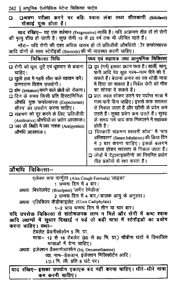 2. श्वसन संस्थान रोग चिकित्सा विभाग- श्वसन मार्ग, फेफड़ों के प्रमुख रोगों की पहचान परीक्षायें एवं लक्षण विस्तार से चिकित्सा सहित मय प्रेस्क्रिप्शन के दिये गये हैं।