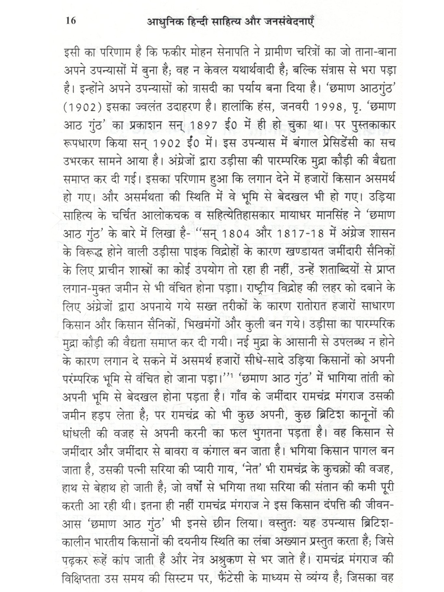 डॉ. हरेराम सिंह लेखक: डॉ. हरेराम सिंह ख्यातिप्राप्त कवि, आलोचक, कहानीकार व उपन्यासकार। जन्म: बिहार के रोहतास जिला अन्तर्गत काराकाट के करूप ईगलिश गाँव में 30 जनवरी, 1988. को, पितामह लाल मोहर सिंह कुशवंशी के घर हुआ। पिता राम विनय सिंह य माँ तेतरी कुशवंशी अच्छे किसान हैं। शिक्षा : प्रारंभिक शिक्षा करुप व गोड़ारी में, मिडिल की शिक्षा ईटवा से, माध्यमिक हाई स्कूल बुढ़वल से, इंटरमीडिएट व स्रातक (प्रतिष्ठा) की शिक्षा अनजबित सिंह कॉलेज बिक्रमगंज, रोहतास से हुई। इन्होंने नालंदा खुला विश्वविद्यालय-पटना से एम. ए. तथा बीर कुंवर सिंह विश्वविद्यालय-आरा से पीएच. डी. की डिग्री प्राप्त की। साहित्यिक योगदान: हंस, जनपथ, सृजना, फारवर्ड प्रेस, नागफनी, रु, लौ, आजकल, अभ्यर्थना, युग-सरोकार, शोध-धारा, अर्जक, शोषित, आईना बिहार, विभाषा-संसृति, संस्कार चेतना, पहचान, बुद्धवाणी, शेरशाहटाईम्स, नईधारा, सूजन-सरिता, ककसाड़, शोध-दिशा, शोध-ऋतु, हाशिये की आवाज आदि में निरंतर कविताएँ, शोधालेख, आलेख और पत्र प्रकाशित। कई राष्ट्रीय अंतराष्ट्रीय सेमिनारों व सम्मेलनों में सहभागिता। है। भारतीय भाषाओं के विभिन्न उपन्यासों के तुलनात्मक अध्ययन में इनकी विशेष रुचि रही हाशिए का चाँद', 'रात गहरा गई है।', 'पहाडों के बीच से', 'मैं रक्तबीज हूँ!', 'चाँद के पार आदमी', 'रोहतासगढ़ के पहाड़ी बच्चे', 'रात के आखिरी पहर तक', 'नीम की पत्तियों से उतरती चाँदनी', 'मुक्ति के गीत' (कविता संग्रह), 'डॉ. ललन प्रसाद सिंह जीवन और साहित्य', 'ओबीसी साहित्य का दार्शनिक आधार', 'हिंदी आलोचना का प्रगतिशील पक्ष', 'हिंदी आलोचना का जन पक्ष', 'हिंदी आलोचना का बहुजन दृष्टिकोण', 'डॉ. राजेंद्र प्रसाद सिंह की वैचारिकी, संस्मरण एवं साक्षात्कार', 'आधुनिक हिंदी साहित्य और जन संवेदनाएँ', 'किसान जीवन की महागाथा : गोदान और छमाण आठगुंठ ' (आलोचना ग्रंथ), 'टुकड़ों में मेरी जिंदगी', 'अनजान नदी!' (उपन्यास), 'अधूरी कहानियाँ', 'कनेर के फूल ' (कहानी संग्रह), 'लोकतंत्र में हाशिए के लोग' इनकी प्रकाशित पुस्तकें हैं। डॉ. हरेराम सिंह के इस आलोचना ग्रंथ में औपनिवेशिक-युग के दो उपन्यासों' गोदान' और 'छमाण आठगुंठ' का तुलनात्मक अध्ययन प्रस्तुत है, जहाँ किसान ब्रिटिश कोलोनीइजम के गहरे आघात से टूट चुका है, उसके सपने बिखर चुके हैं और यह मजदूर या पागल होकर मरने को विवश है!