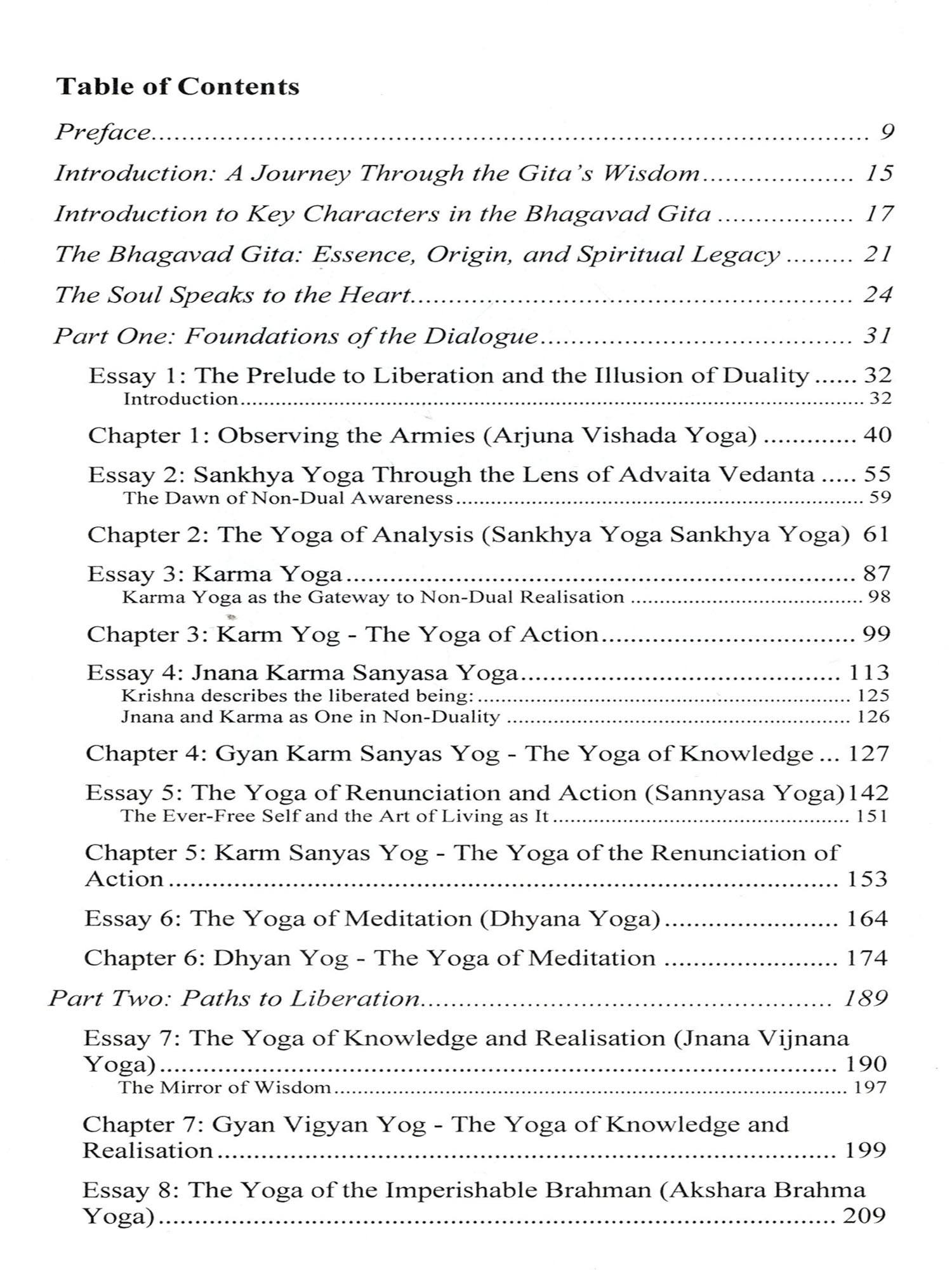 I've chosen this hybrid format to make the Bhagavad Gita accessible and meaningful, whether you are a spiritual seeker, a student of philosophy, or new to this sacred text. Pairing each essay with its corresponding Gita chapter enables you to engage directly with the source material alongside my interpretation, where Shri Krishna represents the eternal soul and Arjuna embodies the human heart's struggles. This structure ensures that my reflections, rooted in the principle of non-dualism, the oneness of self and the divine, are grounded in the Gita's verses, providing immediate context and clarity. By grouping the chapters into three parts, the book traces a journey from Arjuna's initial despair to his ultimate surrender, reflecting the path from inner conflict to non-dual awareness. It invites you to see your own heart's questions in Arjuna's and your soul's wisdom in Shri Krishna's.