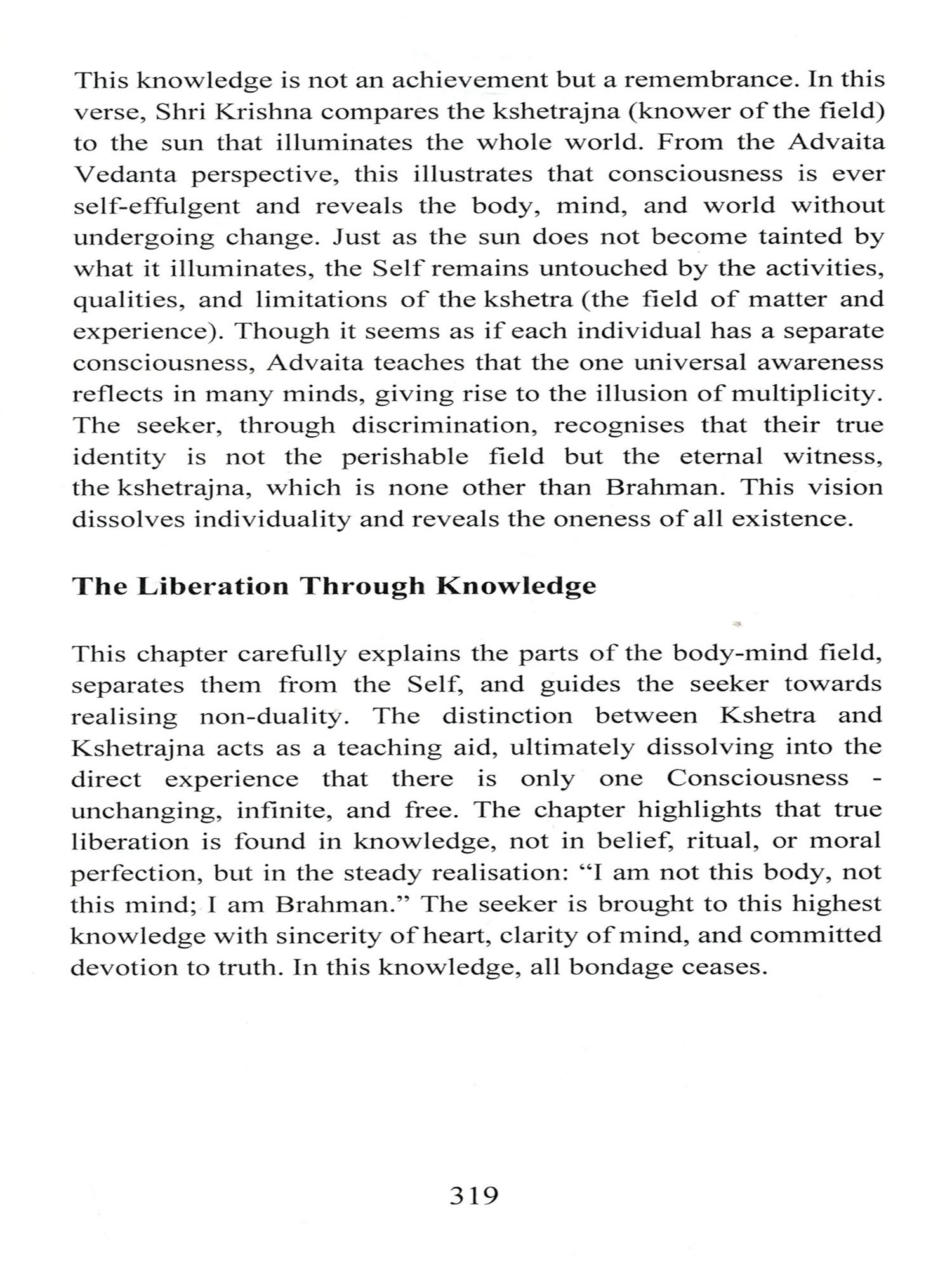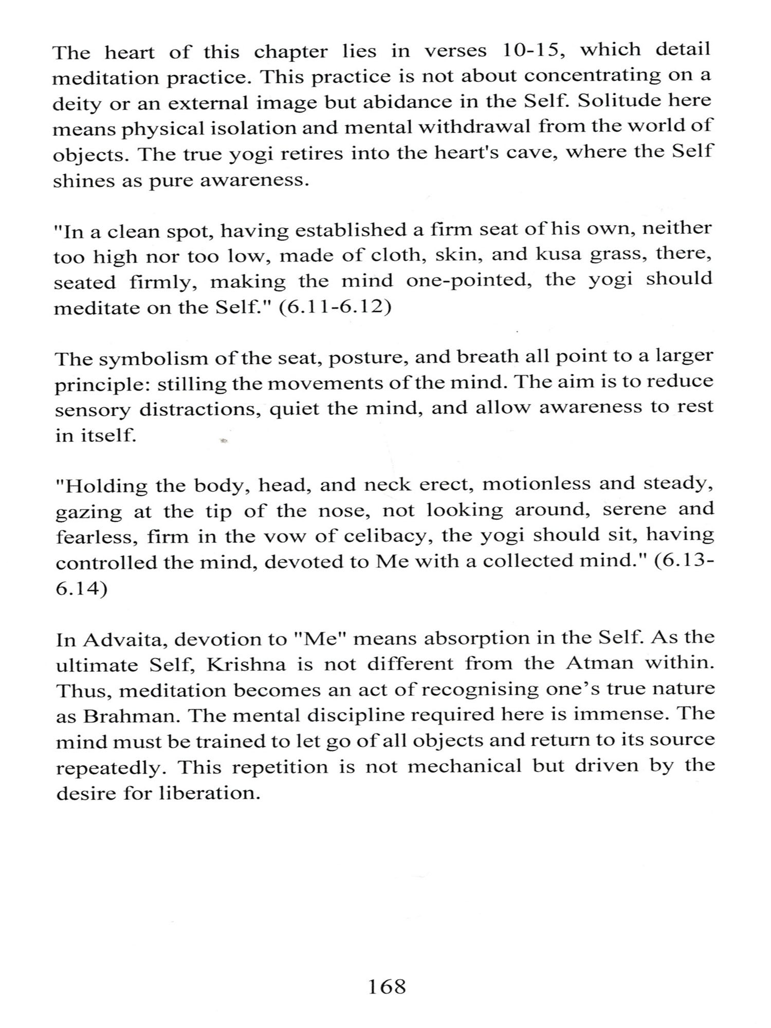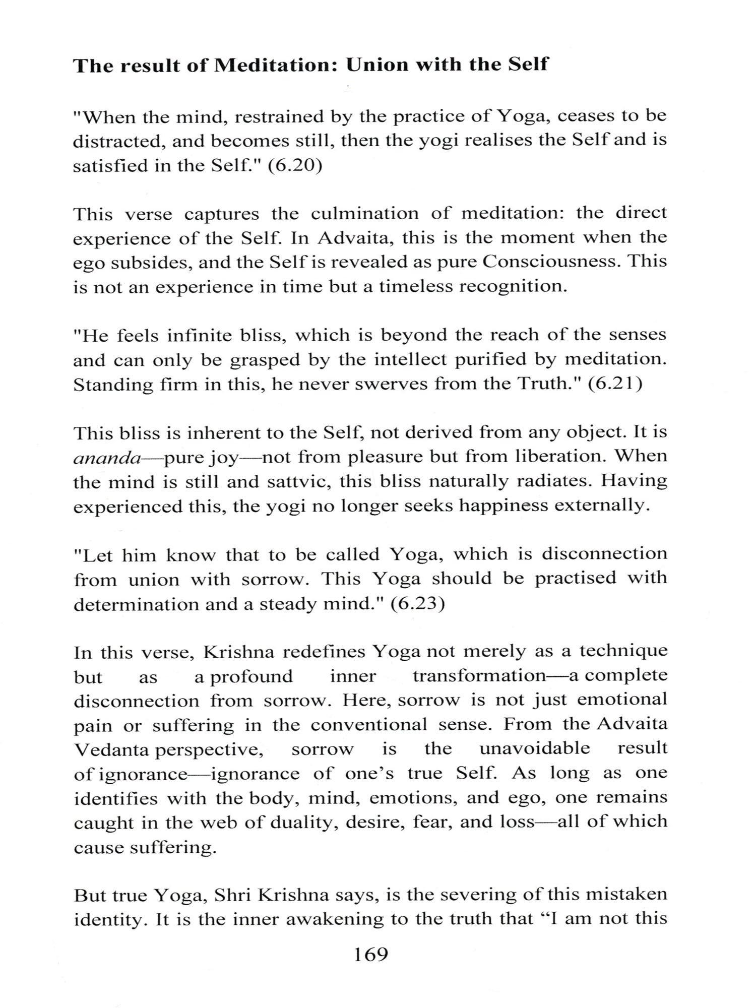 This book, an unfolding of the Bhagavad Gita through the non-dual vision of Advaita Vedanta', is both an inward pilgrimage and a contemplative companion for the earnest seeker. It is not meant as a scholarly treatise nor a devotional commentary in the conventional sense. Instead, it is an attempt to illuminate each chapter of the Gita through the clear lens of Advaita-the timeless truth that the Self alone is authentic and that all multiplicity, all action, and all seeking culminate in the silence of Self-realisation.