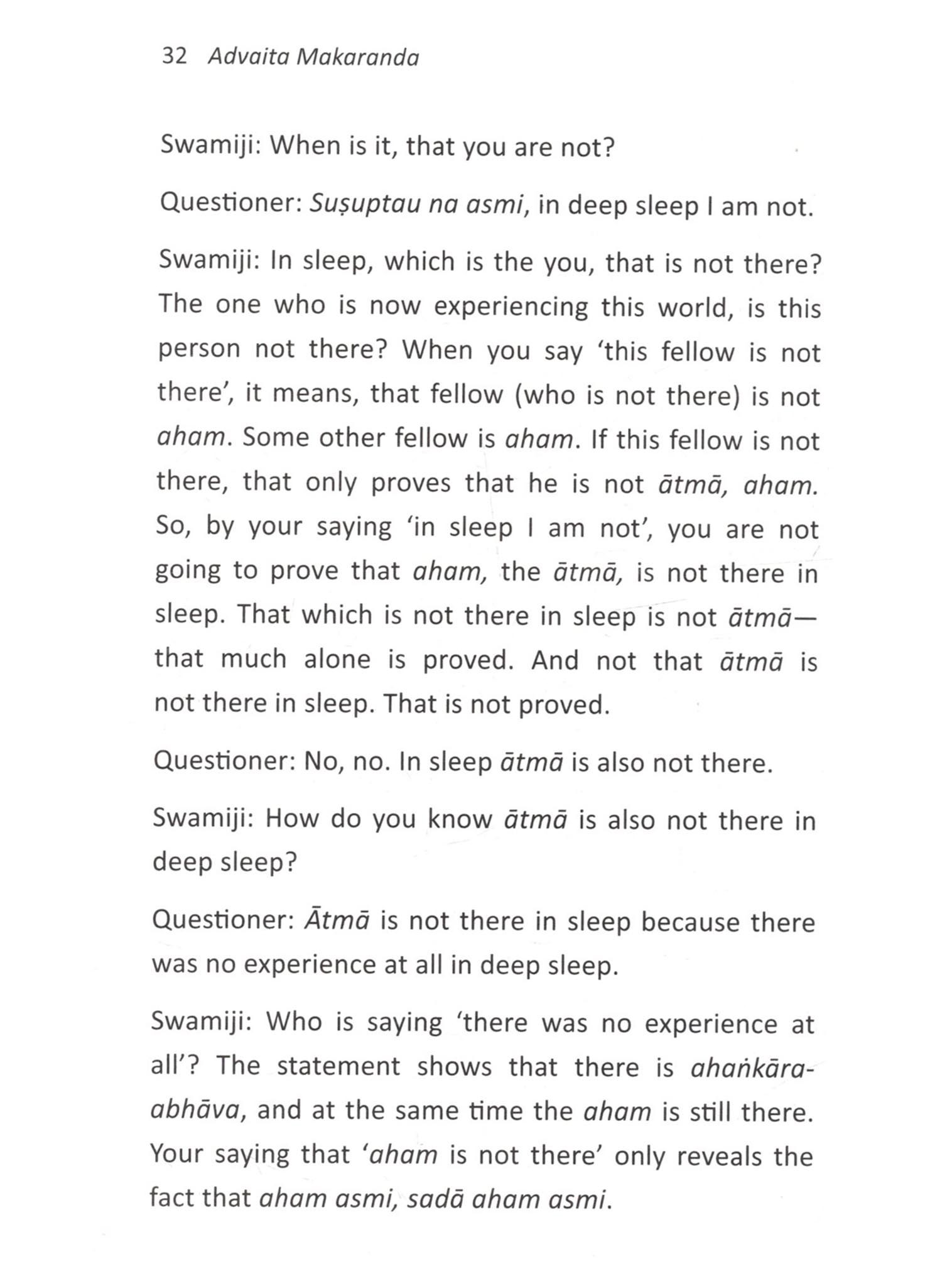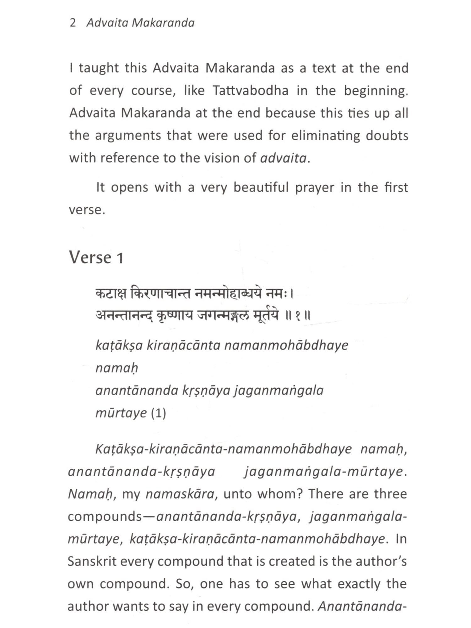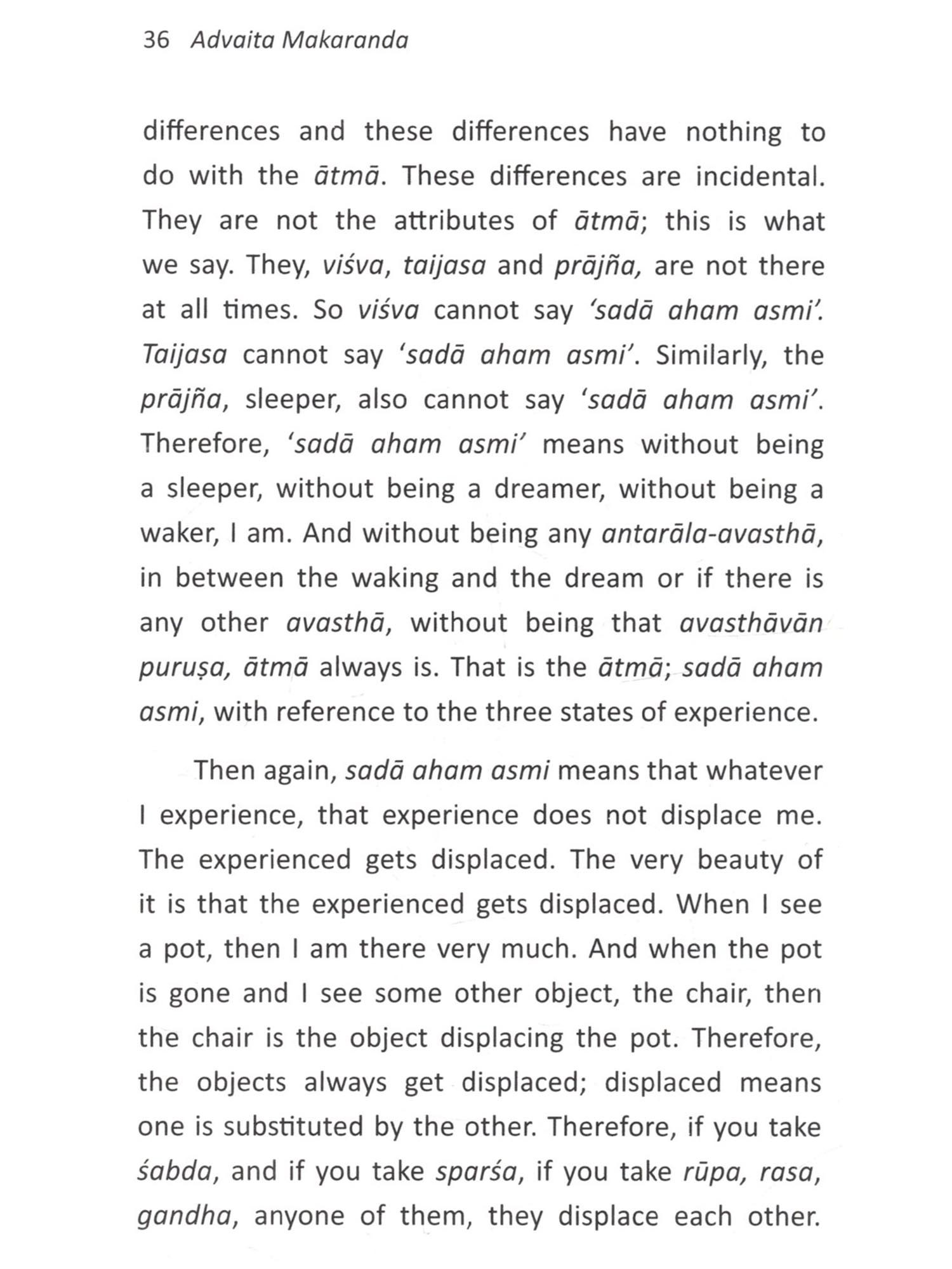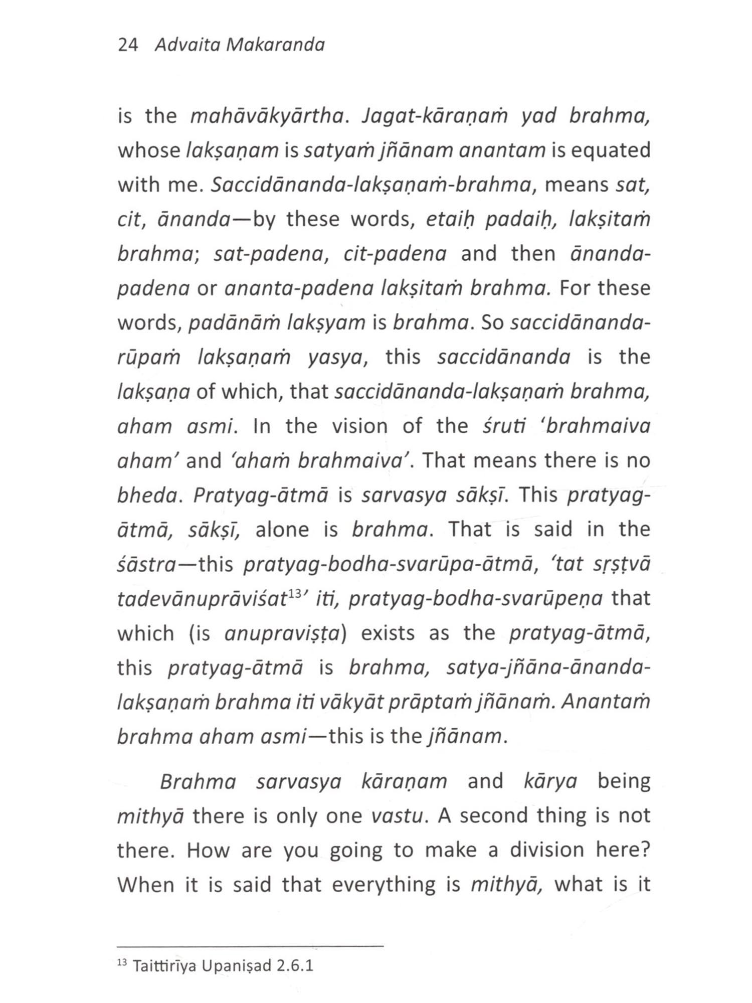 Understanding of Brahman is understanding of atma as satyam jñānam anantam. There is no other understanding of Brahman. When this is unfolded by the śāstra, there are questions as to how it can be true. This whole book answers the questions to remove all obstacles to establish that I am satyam jñānam anantam brahma. That is why it is a very interesting work. There is only one thing that is said in this work, advayam brahma aham asmi. That is why it is Advaita Makaranda.